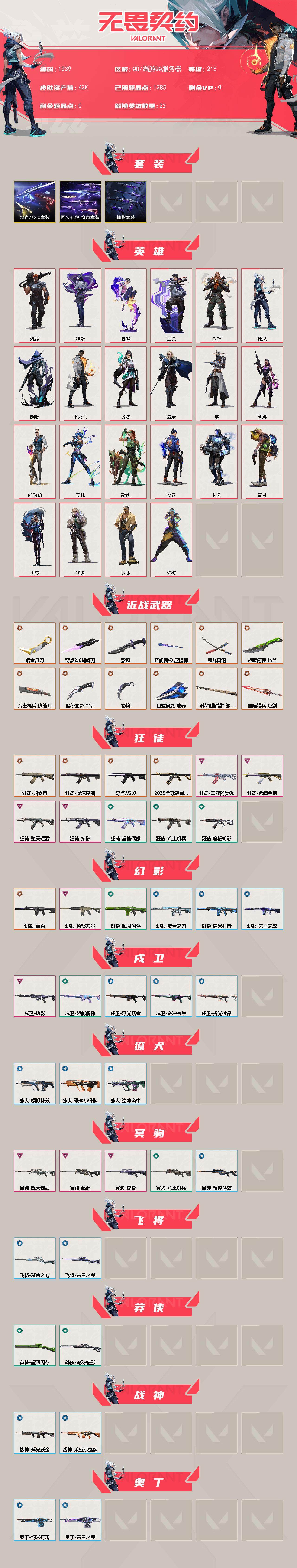 【1239】欢 270218【套装】:奇点//2.0套装,回火礼包:奇点套装,掠影套装 【英雄】:幻棱,炼狱,维斯,暮蝶,钛狐,壹决,铁臂,捷风,幽影,不死鸟,贤者,猎枭,零,芮娜,尚勃勒,霓虹,斯凯,夜露,k/o,盖可,黑梦,钢锁 【近战 武器】:近战武器-影钩,近战武器-奇点//2.0 蝴蝶刀,近战武器-紫金爪刀,近战武器-鬼丸国纲,近战武器-超能偶像 应援棒,近战武器-超限闪存 匕首,近战武器-荒土机兵 热能刀,近战武器-影刃,近战武器-诡秘蛇影 军刀,近战武器-日耀风暴 遗器,近战武器-阿特拉斯指挥部 甩棍,近战武器-星际猎兵 短剑 【狂徒】:狂徒-2025全球冠军赛,狂徒-归零者,狂徒-混沌序曲,狂徒-奇点//2.0,狂徒-堕天遗武,狂徒-掠影,狂徒-盖亚的复仇,狂徒-紫阙金琅,狂徒-超能偶像,狂徒-荒土机兵,狂徒-诡秘蛇影 【幻影】:幻影-奇点,幻影-侦察力量,幻影-超限闪存,幻影-聚合之力,幻影-纳米打击,幻影-末日之翼 【戍卫】:戍卫-掠影,戍卫-超能偶像,戍卫-浮光跃金,戍卫-逆冲蛮牛,戍卫-折光棱晶 【獠犬】:獠犬-采蜜小蜂队,獠犬-模拟赫兹,獠犬-逆冲蛮牛 【冥驹】:冥驹-堕天遗武,冥驹-掠影,冥驹-起源,冥驹-荒土机兵,冥驹-模拟赫兹 【飞将】:飞将-聚合之力,飞将-末日之翼 【莽侠】:莽侠-超限闪存,莽侠-诡秘蛇影 【战神】:战神-采蜜小蜂队,战神-浮光跃金 【奥丁】:奥丁-纳米打击,奥丁-末日之翼 【判官】:判官-超能偶像,判官-诡秘蛇影,判官-采蜜小蜂队,判官-纳米打击x 【雄鹿】:雄鹿-模拟赫兹,雄鹿-逆冲蛮牛 【骇灵】:骇灵-奇点,骇灵-荒土机兵,骇灵-浮光跃金 【蜂刺】:蜂刺-超限闪存,蜂刺-聚合之力,蜂刺-折光棱晶 【标配】:标配-超能偶像,标配-荒土机兵,标配-浮光跃金,标配-最终庇护,标配-折光棱晶 【正义】:正义-奇点,正义-西部未来,正义-掠影,正义-超限闪存,正义-纳米打击 【鬼魅】:鬼魅-奇点//2.0,鬼魅-诡秘蛇影,鬼魅-采蜜小蜂队,鬼魅-模拟赫兹,鬼魅-星云暗涌 【狂怒】:狂怒-聚合之力,狂怒-逆冲蛮牛 【短炮】:短炮-末日之翼 【卡面】:终章:激斗汉堡 卡面,进入射程 卡面,分崩离析 卡面,纳米打击 卡面,抑制技术 卡面,激斗汉堡 卡面,瓦娃脸雪糕 p2 卡面,从黄昏到黎明 卡面,荒土机兵 卡面,银弹猎手 卡面,逆冲蛮牛 卡面,《双城之战》拥抱 卡面,精灵大战 卡面,欢迎来到底城 卡面,南瓜盛典 卡面,唱片的故事 卡面,钢弓与箭弦 卡面,无畏契约:暮蝶 卡面,排除故障 卡面,奇点//2.0 卡面,战术桌游 卡面,悠享食光 卡面,修车达人 卡面,模拟赫兹 卡面,浮光跃金 卡面,超限闪存 卡面,维斯工牌 卡面,正义的化身 卡面,终章:生意人麦宝 卡面,铁之华 卡面,失而复得 卡面,时间到 卡面,最高舞台 卡面,复活专家 卡面,归乡 // 蝰蛇 卡面,超能偶像 卡面,生意人麦宝 卡面,音熊登场 卡面,声感陷阱设计图 卡面,clutch 卡面,钢锁工牌 卡面,战术小伙伴的夏日 卡面,采蜜小蜂队 卡面,聚合之力 卡面,梦幻奶茶 卡面,西装暴徒 卡面,源能反应 卡面,无畏契约go!第一卷:芮娜 卡面,无畏契约go!第一卷:零 卡面,《双城之战》金克丝 卡面,战术小伙伴 卡面,代号红色 卡面,新兵报到 卡面,v契约 卡面,无畏契约 卡面 【喷漆】:小小心意 喷漆,战“素”兔 喷漆,宇宙的指引 喷漆,请求重启 喷漆,逆冲蛮牛 喷漆,纳米打击 喷漆,鼻尖上的蝴蝶 喷漆,简笔画黯兽 喷漆,独守蝰腹 喷漆,他们将落荒而逃 喷漆,通缉:战术企鹅 喷漆,荒土机兵 喷漆,别挡我吃球! 喷漆,嗨宝南瓜灯 喷漆,完美熟度 喷漆,嘭! 喷漆,都算到了 喷漆,控场勿近 喷漆,皮蛋呼呼 喷漆,像素星礈 喷漆,图谋不轨的零 喷漆,伤心心 喷漆,小丑猫 喷漆,模拟赫兹 喷漆,高丽风情小熊 喷漆,奇点//2.0 喷漆,蹲到一个 喷漆,全力集中 喷漆,超限闪存 喷漆,rua一下 喷漆,熊抱 喷漆,高丽风情小虎 喷漆,记在小本本 喷漆,防弹企鹅 喷漆,高丽风情小蛙 喷漆,又被闪了 喷漆,终极羞辱 喷漆,超级粉丝 喷漆,黯兽卖萌 喷漆,捷风差距 喷漆,惊声尖叫 喷漆,五人成星 喷漆,超能偶像 喷漆,放我出去 喷漆,掩护我 喷漆,大佬发呛 喷漆,边缘试探 喷漆,拼一呛 喷漆,聚合之力 喷漆,采蜜小蜂队 喷漆,梦幻小队 喷漆,五个全都齐了 喷漆,我的刀呢? 喷漆,霓光四射 喷漆,情绪控制 喷漆,双人比心 喷漆,买装还是存钱 喷漆,无畏契约go!第一卷:贤者 喷漆,战术小伙伴 喷漆,胜利属于无畏契约 喷漆,glhf 喷漆,无畏契约 喷漆 【挂饰】:终章:猫猫木乃伊 挂饰,荒土机兵 挂饰,悠闲鸡块 挂饰,猫猫木乃伊 挂饰,水壶 挂饰,纳米打击 挂饰,逆冲蛮牛 挂饰,可爱糖糖 挂饰,伞绳 挂饰,《双城之战》小蛋糕 挂饰,第九季//第三幕 纪念币 挂饰,拳击战术熊 挂饰,工具腰带 挂饰,无畏契约go!第一卷 芮娜 挂饰,无畏契约go!第一卷 零 挂饰,暗藏猫腻 挂饰,高丽风情 挂饰,奇点//2.0 挂饰,熔岩灯 挂饰,超限闪存 挂饰,迷你k/o 挂饰,模拟赫兹 挂饰,第九季//第二幕 纪念币 挂饰,薰衣草之心 挂饰,终章:这瓜保熟 挂饰,炼狱雪糕 挂饰,糖葫芦 挂饰,袖珍捷风 挂饰,冲上云霄 挂饰,超能偶像 挂饰,迷你浓缩 挂饰,这瓜保熟 挂饰,采蜜小蜂队 挂饰,第九季//第一幕 纪念币 挂饰,聚合之力 挂饰,天外飞客 挂饰,红鳞松叶 挂饰,插电音乐 挂饰,海豹的认可 挂饰,无畏契约 纪念币 挂饰
