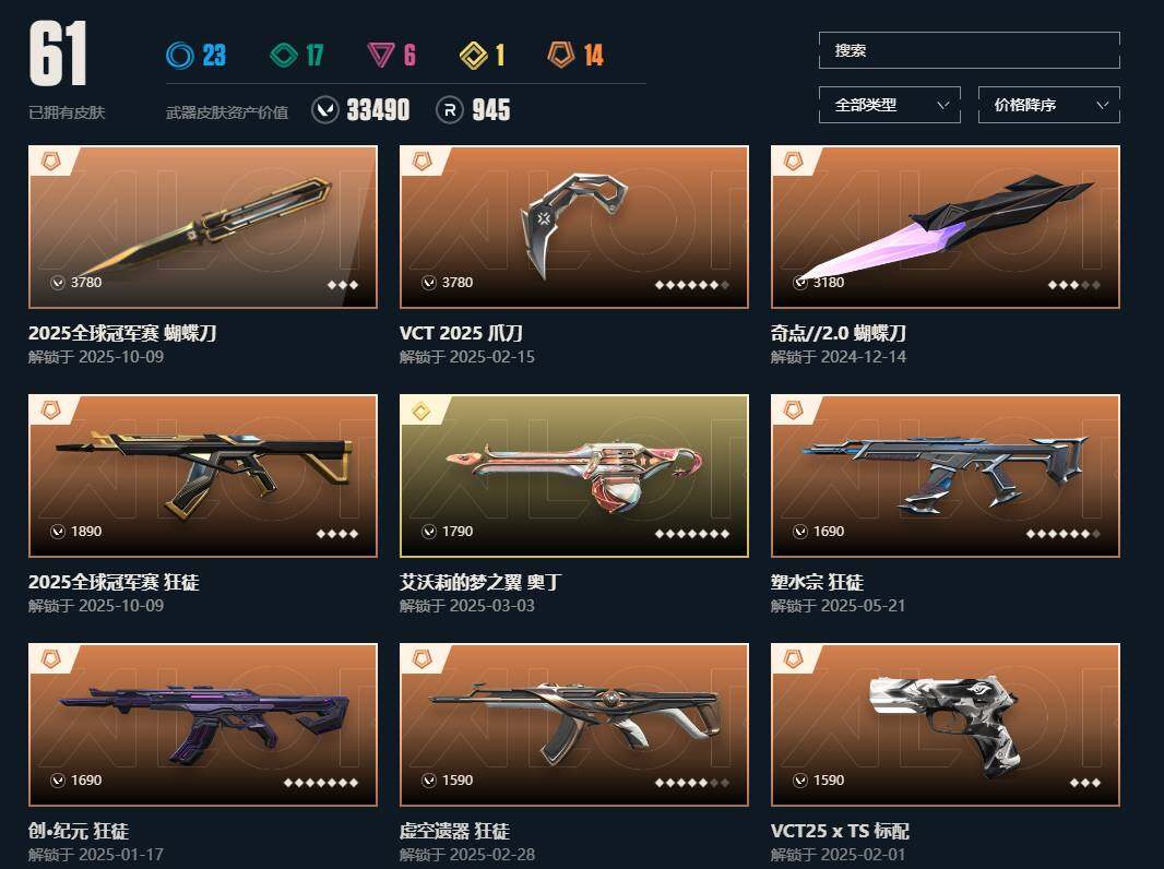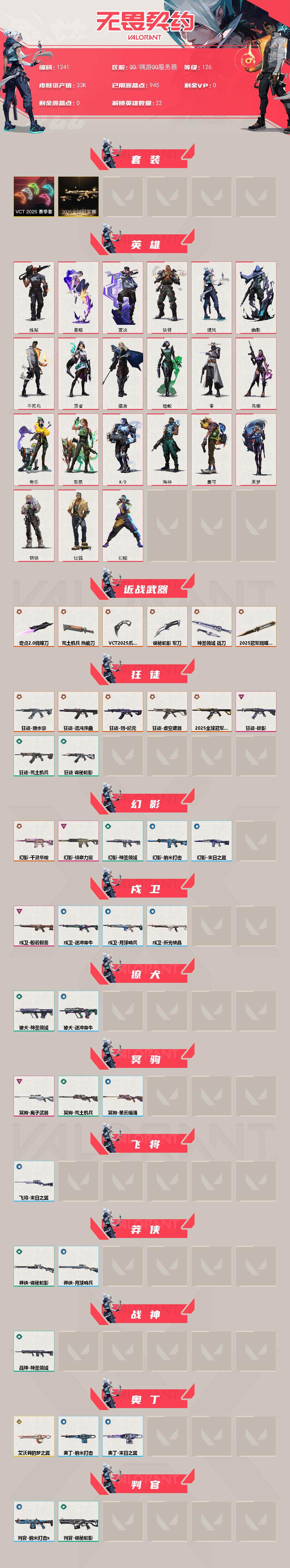 【1241】欢 358920【套装】:2025全球冠军赛套装,vct 2025 赛季套装 【英雄】:幻棱,炼狱,暮蝶,钛狐,壹决,铁臂,捷风,幽影,不死鸟,贤者,猎枭,蝰蛇,零,芮娜,奇乐,斯凯,k/o,海神,盖可,黑梦,钢锁 【近战 武器】:近战武器-2025全球冠军赛 蝴蝶刀,近战武器-奇点//2.0 蝴蝶刀,近战武器-vct 2025 爪刀,近战武器-荒土机兵 热能刀,近战武器-诡秘蛇影 军刀,近战武器-神圣领域 战刀 【狂徒】:狂徒-2025全球冠军赛,狂徒-混沌序曲,狂徒-塑水宗,狂徒-创·纪元,狂徒-虚空遗器,狂徒-掠影,狂徒-荒土机兵,狂徒-诡秘蛇影 【幻影】:幻影-千灵华绽,幻影-侦察力量,幻影-神圣领域,幻影-纳米打击,幻影-末日之翼 【戍卫】:戍卫-般若假面,戍卫-逆冲蛮牛,戍卫-月球哨兵,戍卫-折光棱晶 【獠犬】:獠犬-神圣领域,獠犬-逆冲蛮牛 【冥驹】:冥驹-离子武器,冥驹-荒土机兵,冥驹-星云暗涌 【飞将】:飞将-末日之翼 【莽侠】:莽侠-诡秘蛇影,莽侠-月球哨兵 【战神】:战神-神圣领域 【奥丁】:奥丁-艾沃莉的梦之翼,奥丁-纳米打击,奥丁-末日之翼 【判官】:判官-诡秘蛇影,判官-纳米打击x 【雄鹿】:雄鹿-逆冲蛮牛,雄鹿-月球哨兵 【骇灵】:骇灵-海洋之星,骇灵-荒土机兵,骇灵-无限竞技,骇灵-星云暗涌 【蜂刺】:蜂刺-星云暗涌,蜂刺-折光棱晶 【标配】:标配-荒土机兵,标配-折光棱晶 【vct手呛】:标配-vct25 x ts 【正义】:正义-西部未来,正义-纳米打击,正义-月球哨兵 【鬼魅】:鬼魅-盖世英雄,鬼魅-诡秘蛇影,鬼魅-星云暗涌 【狂怒】:狂怒-神圣领域,狂怒-逆冲蛮牛 【短炮】:短炮-末日之翼 【卡面】:终章:激斗汉堡 卡面,进入射程 卡面,分崩离析 卡面,纳米打击 卡面,抑制技术 卡面,激斗汉堡 卡面,瓦娃脸雪糕 p2 卡面,从黄昏到黎明 卡面,荒土机兵 卡面,银弹猎手 卡面,逆冲蛮牛 卡面,《双城之战》拥抱 卡面,精灵大战 卡面,欢迎来到底城 卡面,南瓜盛典 卡面,无畏契约:暮蝶 卡面,正义的化身 卡面,树懒大作战 卡面,clutch 卡面,流星兵团 卡面,无畏契约go!第一卷:芮娜 卡面,无畏契约go!第一卷:零 卡面,无垠星环 卡面,没有什么能逃过我的眼睛 卡面,无畏契约go!第一卷:贤者 卡面,钢锁vs盖可 卡面,代号红色 卡面,新兵报到 卡面,v契约 卡面,无畏契约 卡面 【喷漆】:小小心意 喷漆,战“素”兔 喷漆,宇宙的指引 喷漆,请求重启 喷漆,逆冲蛮牛 喷漆,纳米打击 喷漆,鼻尖上的蝴蝶 喷漆,简笔画黯兽 喷漆,独守蝰腹 喷漆,他们将落荒而逃 喷漆,通缉:战术企鹅 喷漆,荒土机兵 喷漆,别挡我吃球! 喷漆,嗨宝南瓜灯 喷漆,嘭! 喷漆,都算到了 喷漆,控场勿近 喷漆,伤心心 喷漆,双击点赞 喷漆,买装还是存钱 喷漆,关门放狗 喷漆,无畏契约go!第一卷:芮娜 喷漆,无畏契约go!第一卷:零 喷漆,松叶 喷漆,胜利属于无畏契约 喷漆,glhf 喷漆,无畏契约 喷漆 【挂饰】:终章:猫猫木乃伊 挂饰,荒土机兵 挂饰,悠闲鸡块 挂饰,猫猫木乃伊 挂饰,水壶 挂饰,纳米打击 挂饰,逆冲蛮牛 挂饰,可爱糖糖 挂饰,伞绳 挂饰,《双城之战》小蛋糕 挂饰,第九季//第三幕 纪念币 挂饰,无畏契约go!第一卷 芮娜 挂饰,无畏契约go!第一卷 零 挂饰,鱼骨头 挂饰,薰衣草之心 挂饰,z世代特饮 挂饰,天外飞客 挂饰,无畏契约 纪念币 挂饰