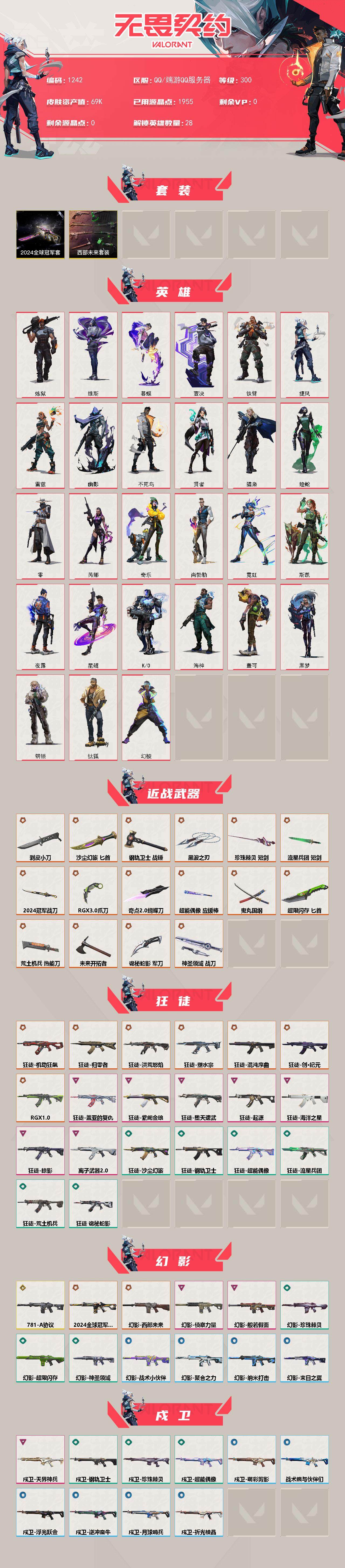 【1242】欢 338626【套装】:2024全球冠军赛套装,西部未来套装 【英雄】:幻棱,炼狱,维斯,暮蝶,钛狐,壹决,铁臂,捷风,雷兹,幽影,不死鸟,贤者,猎枭,蝰蛇,零,芮娜,奇乐,尚勃勒,霓虹,斯凯,夜露,星礈,k/o,海神,盖可,黑梦,钢锁 【近战 武器】:近战武器-2024全球冠军赛 战刀,近战武器-剥皮小刀,近战武器-奇点//2.0 蝴蝶刀,近战武器-rgx 11z pro//3.0 爪刀,近战武器-黑波之刃,近战武器-鬼丸国纲,近战武器-未来开拓者,近战武器-珍珠棘贝 短剑,近战武器-流星兵团 短剑,近战武器-超能偶像 应援棒,近战武器-超限闪存 匕首,近战武器-钢轨卫士 战锤,近战武器-荒土机兵 热能刀,近战武器-沙尘幻旅 匕首,近战武器-诡秘蛇影 军刀,近战武器-神圣领域 战刀 【狂徒】:狂徒-归零者,狂徒-洪荒怒焰,狂徒-混沌序曲,狂徒-机动狂飙,狂徒-塑水宗,狂徒-创·纪元,狂徒-rgx 11z pro,狂徒-堕天遗武,狂徒-掠影,狂徒-盖亚的复仇,狂徒-海洋之星,狂徒-起源,狂徒-紫阙金琅,狂徒-离子武器//2.0,狂徒-超能偶像,狂徒-钢轨卫士,狂徒-荒土机兵,狂徒-流星兵团,狂徒-沙尘幻旅,狂徒-诡秘蛇影 【幻影】:幻影-781-a协议,幻影-2024全球冠军赛,幻影-西部未来,幻影-般若假面,幻影-侦察力量,幻影-超限闪存,幻影-珍珠棘贝,幻影-神圣领域,幻影-聚合之力,幻影-纳米打击,幻影-战术小伙伴,幻影-末日之翼,幻影-西部未来 【戍卫】:戍卫-天界神兵,戍卫-超能偶像,戍卫-钢轨卫士,戍卫-珍珠棘贝,戍卫-浮光跃金,戍卫-萌彩剪影,戍卫-逆冲蛮牛,戍卫-战术熊与伙伴们,戍卫-月球哨兵,戍卫-折光棱晶 【獠犬】:獠犬-全息波普,獠犬-神圣领域,獠犬-采蜜小蜂队,獠犬-复古浪潮,獠犬-胡桃狂想,獠犬-模拟赫兹,獠犬-逆冲蛮牛,獠犬-战术小伙伴 【冥驹】:冥驹-堕天遗武,冥驹-盖世英雄,冥驹-荒土机兵,冥驹-复古浪潮,冥驹-胡桃狂想,冥驹-模拟赫兹,冥驹-星云暗涌 【飞将】:飞将-西部未来,飞将-沙尘幻旅,飞将-聚合之力,飞将-光导纤维,飞将-战术熊与伙伴们,飞将-末日之翼 【莽侠】:莽侠-rgx 11z pro//3.0,莽侠-超限闪存,莽侠-诡秘蛇影,莽侠-深海水族,莽侠-纤云弄巧,莽侠-月球哨兵 【战神】:战神-神圣领域,战神-采蜜小蜂队,战神-浮光跃金,战神-萌彩剪影,战神-深海水族 【奥丁】:奥丁-西部未来,奥丁-流星兵团,奥丁-纳米打击,奥丁-战术小伙伴,奥丁-末日之翼 【判官】:判官-超能偶像,判官-诡秘蛇影,判官-采蜜小蜂队,判官-萌彩剪影,判官-纳米打击x 【雄鹿】:雄鹿-复古浪潮,雄鹿-模拟赫兹,雄鹿-逆冲蛮牛,雄鹿-月球哨兵 【骇灵】:骇灵-荒土机兵,骇灵-流星兵团,骇灵-沙尘幻旅,骇灵-珍珠棘贝,骇灵-无限竞技,骇灵-浮光跃金,骇灵-光导纤维,骇灵-星云暗涌 【蜂刺】:蜂刺-超限闪存,蜂刺-胡桃狂想,蜂刺-聚合之力,蜂刺-深海水族,蜂刺-纤云弄巧,蜂刺-战术小伙伴,蜂刺-星云暗涌,蜂刺-折光棱晶 【标配】:标配-超能偶像,标配-荒土机兵,标配-浮光跃金,标配-光导纤维,标配-战术熊与伙伴们,标配-折光棱晶 【vct手呛】:标配-vct25 x blg 【正义】:正义-塑水宗,正义-西部未来,正义-离子武器,正义-超限闪存,正义-沙尘幻旅,正义-复古浪潮,正义-纳米打击,正义-纤云弄巧,正义-游戏结束,正义-月球哨兵 【鬼魅】:鬼魅-天界神兵,鬼魅-流星兵团,鬼魅-诡秘蛇影,鬼魅-采蜜小蜂队,鬼魅-光导纤维,鬼魅-胡桃狂想,鬼魅-模拟赫兹,鬼魅-星云暗涌 【狂怒】:狂怒-钢轨卫士,狂怒-珍珠棘贝,狂怒-神圣领域,狂怒-聚合之力,狂怒-萌彩剪影,狂怒-逆冲蛮牛,狂怒-战术熊与伙伴们 【短炮】:短炮-钢轨卫士,短炮-深海水族,短炮-纤云弄巧,短炮-末日之翼 【卡面】:终章:激斗汉堡 卡面,进入射程 卡面,分崩离析 卡面,纳米打击 卡面,抑制技术 卡面,激斗汉堡 卡面,瓦娃脸雪糕 p2 卡面,从黄昏到黎明 卡面,荒土机兵 卡面,银弹猎手 卡面,逆冲蛮牛 卡面,《双城之战》拥抱 卡面,精灵大战 卡面,欢迎来到底城 卡面,南瓜盛典 卡面,vct cn首冠 卡面,唱片的故事 卡面,钢弓与箭弦 卡面,无畏契约:暮蝶 卡面,排除故障 卡面,战术桌游 卡面,悠享食光 卡面,修车达人 卡面,热舞环节 卡面,模拟赫兹 卡面,浮光跃金 卡面,超限闪存 卡面,维斯工牌 卡面,正义的化身 卡面,终章:生意人麦宝 卡面,铁之华 卡面,2024全球冠军赛 卡面,失而复得 卡面,时间到 卡面,最高舞台 卡面,复活专家 卡面,归乡 // 蝰蛇 卡面,rgx 11z pro//3.0 卡面,超能偶像 卡面,生意人麦宝 卡面,音熊登场 卡面,树懒大作战 卡面,声感陷阱设计图 卡面,clutch 卡面,钢锁工牌 卡面,战术小伙伴的夏日 卡面,采蜜小蜂队 卡面,聚合之力 卡面,梦幻奶茶 卡面,终章:打造专属狂徒 卡面,趁热吃 卡面,西装暴徒 卡面,失控边缘 卡面,哨卫者之领域 卡面,无畏契约:尚勃勒 卡面,暮蝶工牌 卡面,战术熊与伙伴们 卡面,源能反应 卡面,流星兵团 卡面,纤云弄巧 卡面,暂别喧嚣 卡面,打造专属狂徒 卡面,零点嗅探设计图 卡面,终章:瓦娃脸雪糕 卡面,表象之下 卡面,虹吸式咖啡壶 卡面,源能者美容 卡面,脚踝终结者 卡面 ,夜班 卡面,瓦娃脸雪糕 卡面 ,沙雕爆能器 卡面,无畏契约go!第一卷:芮娜 卡面,深海水族 卡面,珍珠棘贝 卡面,复古浪潮 卡面,盖可工牌 卡面,清除名单 卡面,无畏契约go!第一卷:零 卡面,终章:同步耍酷 卡面,龍记 卡面,化茧成蝶 卡面,比比看谁快? 卡面,无垠星环 卡面,《双城之战》金克丝 卡面,蝰蛇vs幽影 卡面,势不可挡//盖可 卡面,逆向独行 卡面 ,同步耍酷 卡面,完美调谐 卡面 ,没有什么能逃过