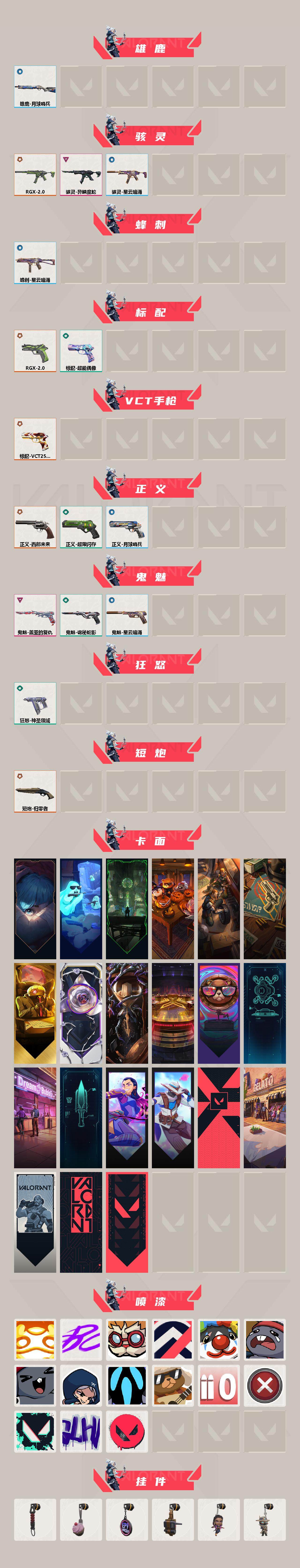 【1248】欢 343972【套装】:vct 2025 赛季套装,西部未来套装,rgx 11z pro//2.0套装 【英雄】:幻棱,炼狱,维斯,暮蝶,钛狐,壹决,铁臂,捷风,雷兹,幽影,不死鸟,贤者,猎枭,蝰蛇,零,芮娜,奇乐,尚勃勒,霓虹,斯凯,夜露,星礈,k/o,海神,盖可,黑梦,钢锁 【近战 武器】:近战武器-rgx 11z pro//2.0 蝴蝶刀,近战武器-奇点//2.0 蝴蝶刀,近战武器-vct 2025 爪刀,近战武器-鬼丸国纲,近战武器-未来开拓者,近战武器-巨神铁甲 短剑,近战武器-夜刃诡镰,近战武器-神圣领域 战刀 【狂徒】:狂徒-洪荒怒焰,狂徒-混沌序曲,狂徒-掠影 【幻影】:幻影-rgx 11z pro//2.0,幻影-西部未来,幻影-侦察力量,幻影-神圣领域,幻影-西部未来 【戍卫】:戍卫-掠影,戍卫-月球哨兵 【獠犬】:獠犬-日冕雄师,獠犬-神圣领域 【冥驹】:冥驹-rgx 11z pro//2.0,冥驹-起源,冥驹-星云暗涌 【飞将】:飞将-西部未来 【莽侠】:莽侠-月球哨兵 【战神】:战神-神圣领域 【奥丁】:奥丁-西部未来 【雄鹿】:雄鹿-月球哨兵 【骇灵】:骇灵-rgx 11z pro//2.0,骇灵-异鳞魔蛇,骇灵-星云暗涌 【蜂刺】:蜂刺-星云暗涌 【标配】:标配-rgx 11z pro//2.0,标配-超能偶像 【vct手呛】:标配-vct25 x edg 【正义】:正义-西部未来,正义-超限闪存,正义-月球哨兵 【鬼魅】:鬼魅-盖亚的复仇,鬼魅-诡秘蛇影,鬼魅-星云暗涌 【狂怒】:狂怒-神圣领域 【短炮】:短炮-归零者 【卡面】:《双城之战》拥抱 卡面,精灵大战 卡面,欢迎来到底城 卡面,南瓜盛典 卡面,修车达人 卡面,正义的化身 卡面,终章:生意人麦宝 卡面,铁之华 卡面,时间到 卡面,最高舞台 卡面,音熊登场 卡面,声感陷阱设计图 卡面,梦幻奶茶 卡面,零点嗅探设计图 卡面,无畏契约go!第一卷:芮娜 卡面,无畏契约go!第一卷:零 卡面,代号红色 卡面,冰淇淋店 卡面,新兵报到 卡面,v契约 卡面,无畏契约 卡面 【喷漆】:嗨宝南瓜灯 喷漆,嘭! 喷漆,都算到了 喷漆,控场勿近 喷漆,小丑猫 喷漆,熊抱 喷漆,超级粉丝 喷漆,捷风差距 喷漆,惊声尖叫 喷漆,战术熊的巴拉莱卡琴 喷漆,拼一呛 喷漆,买装还是存钱 喷漆,胜利属于无畏契约 喷漆,glhf 喷漆,无畏契约 喷漆 【挂饰】:伞绳 挂饰,《双城之战》小蛋糕 挂饰,第九季//第三幕 纪念币 挂饰,工具腰带 挂饰,无畏契约go!第一卷 芮娜 挂饰,无畏契约go!第一卷 零 挂饰,暗藏猫腻 挂饰,熔岩灯 挂饰,第九季//第二幕 纪念币 挂饰,终章:这瓜保熟 挂饰,糖葫芦 挂饰,袖珍捷风 挂饰,丢麦 挂饰,迷你浓缩 挂饰,尤克里里 挂饰,第九季//第一幕 纪念币 挂饰,vct x edg 挂饰,第八季//第三幕 纪念币 挂饰,天外飞客 挂饰,斑点小姐 挂饰,无畏契约 纪念币 挂饰