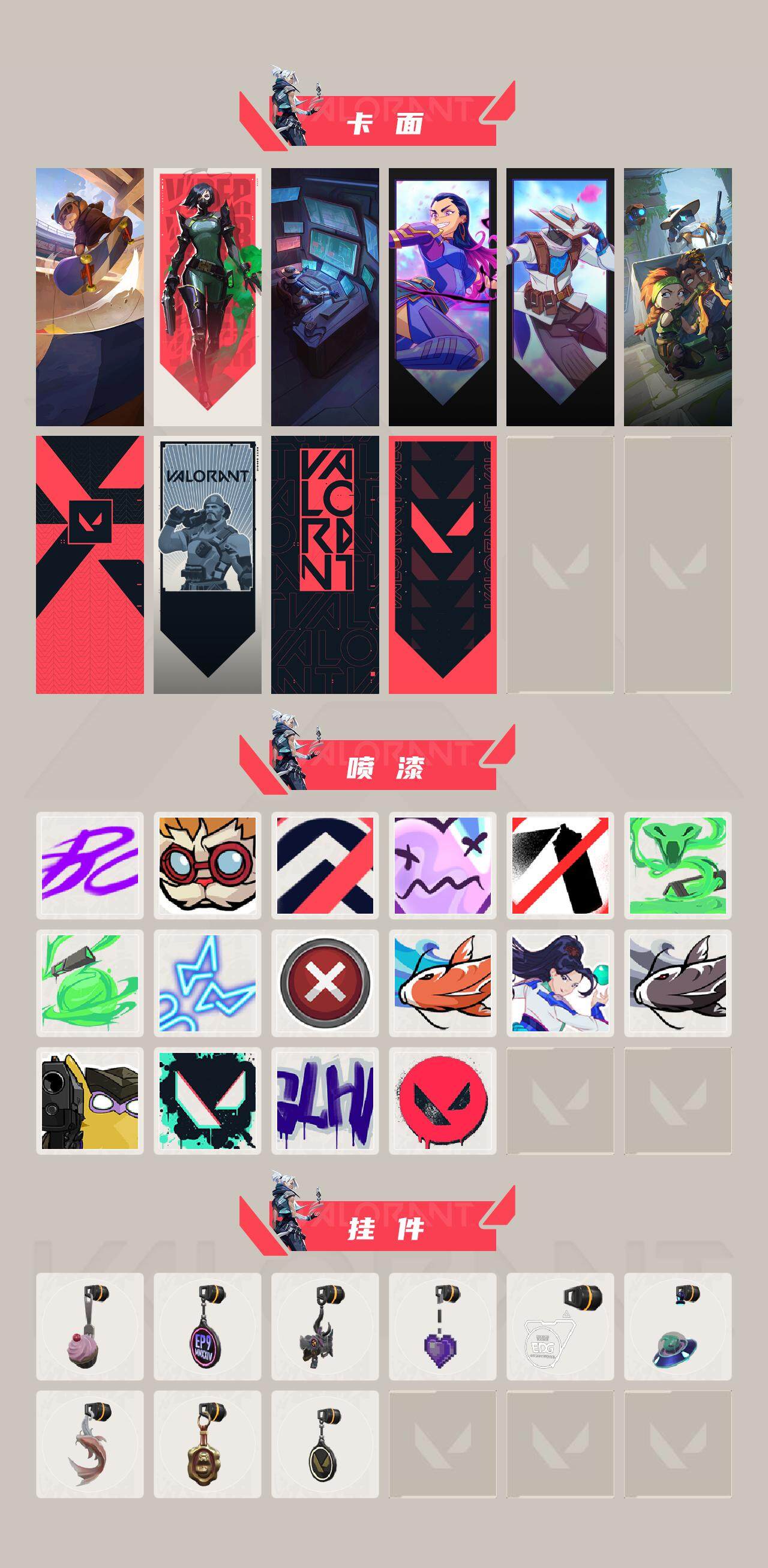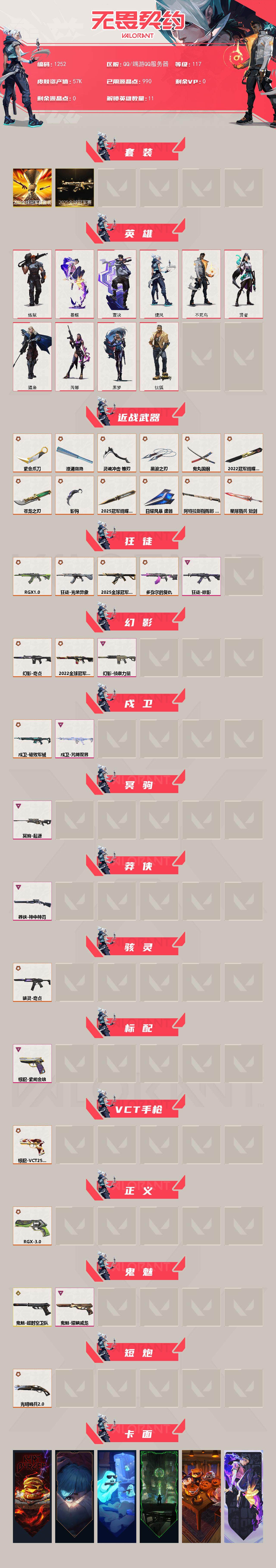 【1252】欢 182939【套装】:2025全球冠军赛套装,2022全球冠军赛套装 【英雄】:炼狱,暮蝶,钛狐,壹决,捷风,不死鸟,贤者,猎枭,芮娜,黑梦 【近战 武器】:近战武器-2025全球冠军赛 蝴蝶刀,近战武器-2022全球冠军赛 蝴蝶刀,近战武器-影钩,近战武器-5周年//公测重制版 苍龙之刃,近战武器-紫金爪刀,近战武器-黑波之刃,近战武器-澄湖潋滟,近战武器-鬼丸国纲,近战武器-灵魂冲击 镰刃,近战武器-日耀风暴 遗器,近战武器-阿特拉斯指挥部 甩棍,近战武器-星际猎兵 短剑 【狂徒】:狂徒-2025全球冠军赛,狂徒-rgx 11z pro,狂徒-光荣异象,狂徒-多弥尔的复仇,狂徒-掠影 【幻影】:幻影-2022全球冠军赛,幻影-奇点,幻影-侦察力量 【戍卫】:戍卫-破败军械,戍卫-咒缚双界 【冥驹】:冥驹-起源 【莽侠】:莽侠-神中神罚 【骇灵】:骇灵-奇点 【标配】:标配-紫阙金琅 【vct手呛】:标配-vct25 x edg 【正义】:正义-rgx 11z pro//3.0 【鬼魅】:鬼魅-超时空卫队,鬼魅-耀鳞威龙 【短炮】:短炮-光明哨兵//2.0 【卡面】:激斗汉堡 卡面,《双城之战》拥抱 卡面,精灵大战 卡面,欢迎来到底城 卡面,南瓜盛典 卡面,无畏契约:暮蝶 卡面,clutch 卡面,无畏契约:蝰蛇 卡面,夜班 卡面,无畏契约go!第一卷:芮娜 卡面,无畏契约go!第一卷:零 卡面,别冒尖 卡面,代号红色 卡面,新兵报到 卡面,v契约 卡面,无畏契约 卡面 【喷漆】:嘭! 喷漆,都算到了 喷漆,控场勿近 喷漆,伤心心 喷漆,禁止喷漆 喷漆,致命毒素 喷漆,喜欢哪种毒? 喷漆,霓光四射 喷漆,买装还是存钱 喷漆,红鳞 喷漆,无畏契约go!第一卷:贤者 喷漆,松叶 喷漆,放下武器 喷漆,胜利属于无畏契约 喷漆,glhf 喷漆,无畏契约 喷漆 【挂饰】:《双城之战》小蛋糕 挂饰,第九季//第三幕 纪念币 挂饰,鱼骨头 挂饰,薰衣草之心 挂饰,vct x edg 挂饰,天外飞客 挂饰,红鳞松叶 挂饰,海豹的认可 挂饰,无畏契约 纪念币 挂饰