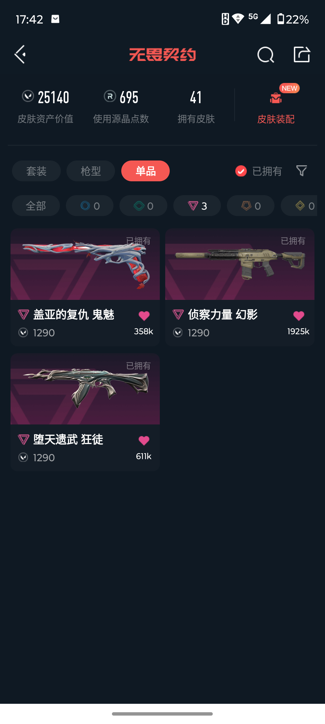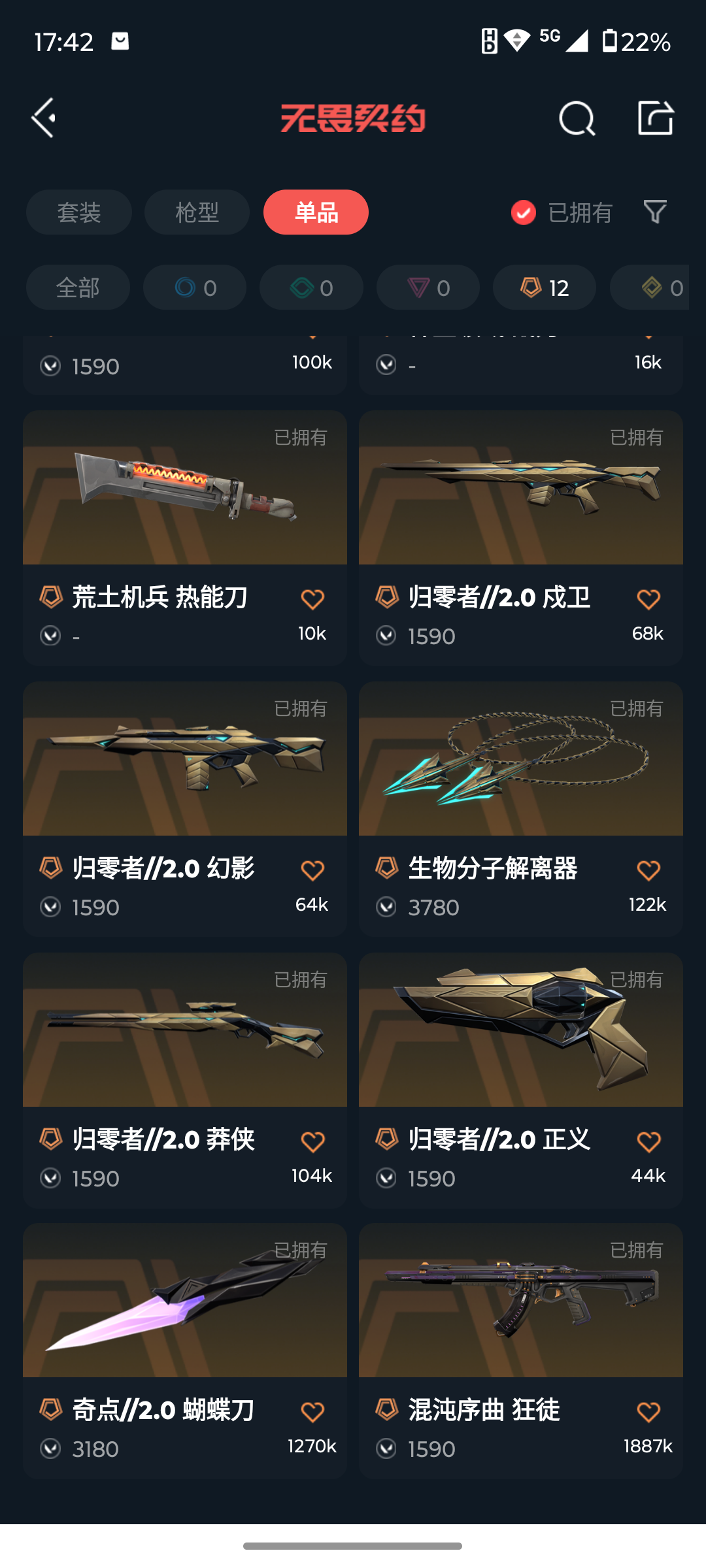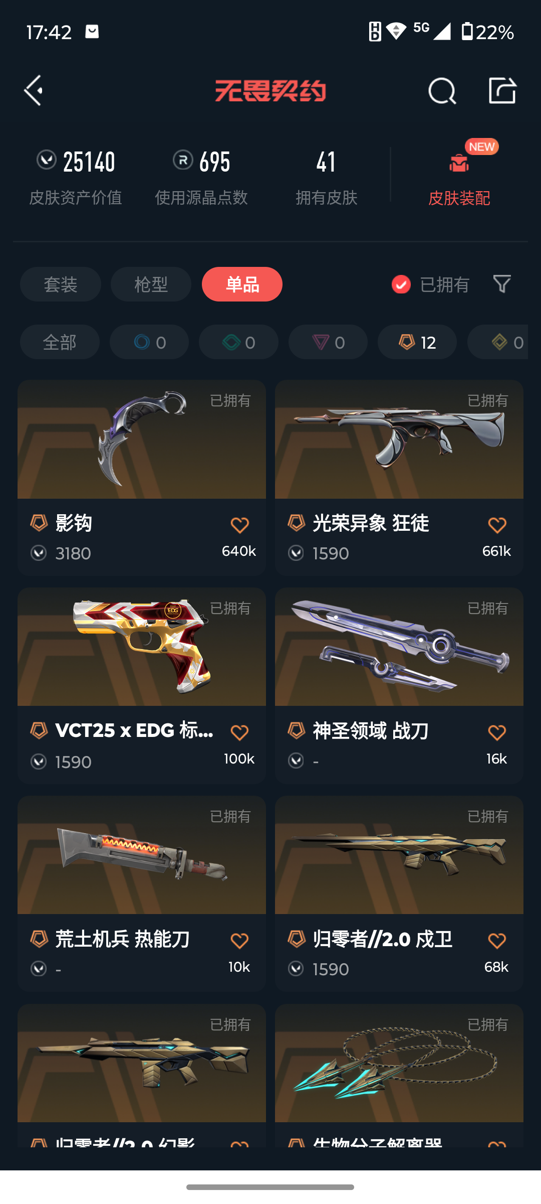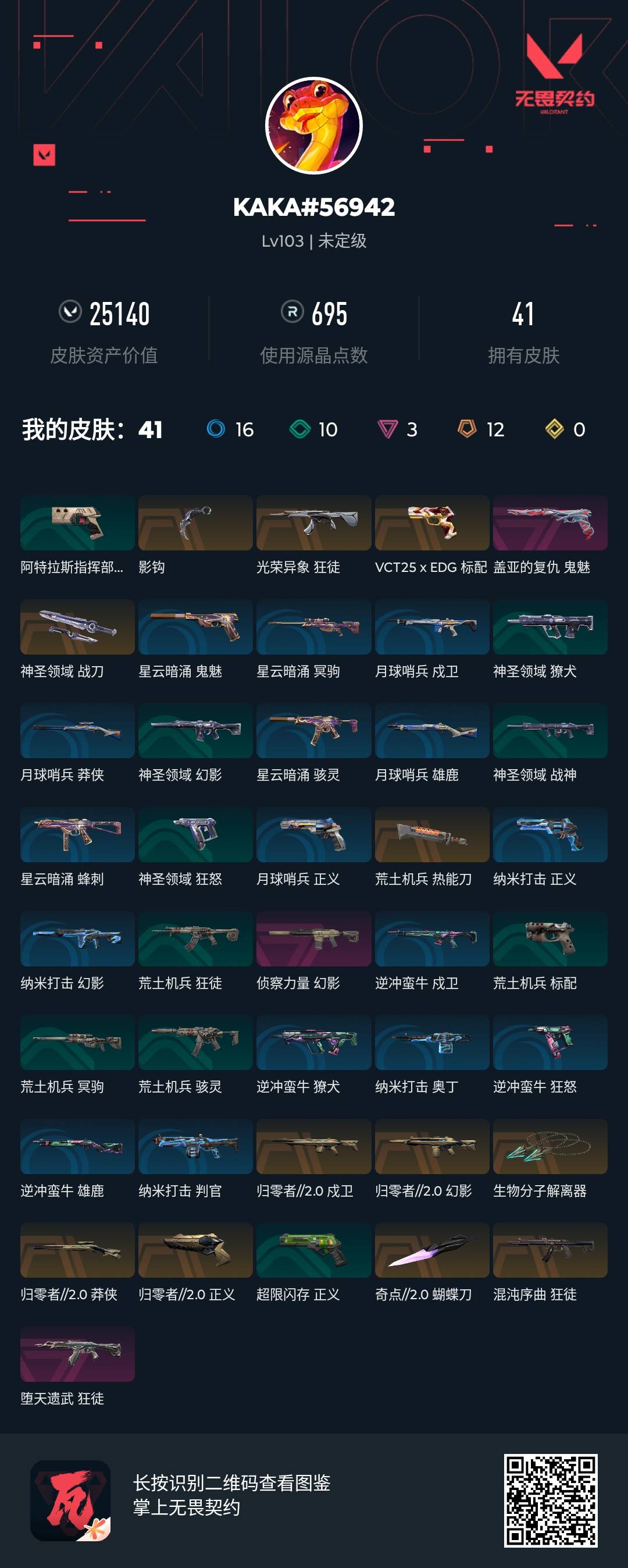 [14702615]b189336 (归零者2.0套装)无畏契约/103等级/未定级/25英雄/41皮肤/25140资产/已使用r点695/剩余r点125/归零者//2.0-幻影,归零者//2.0-戍卫,归零者//2.0-莽侠,归零者//2.0-正义,生物分子解离器,神圣领域-战刀,荒土机兵-热能刀,影钩,奇点//2.0-蝴蝶刀,光荣异象-狂徒,混沌序曲-狂徒,堕天遗武-狂徒,侦察力量-幻影,vct25-x-edg-标配,盖亚的复仇-鬼魅