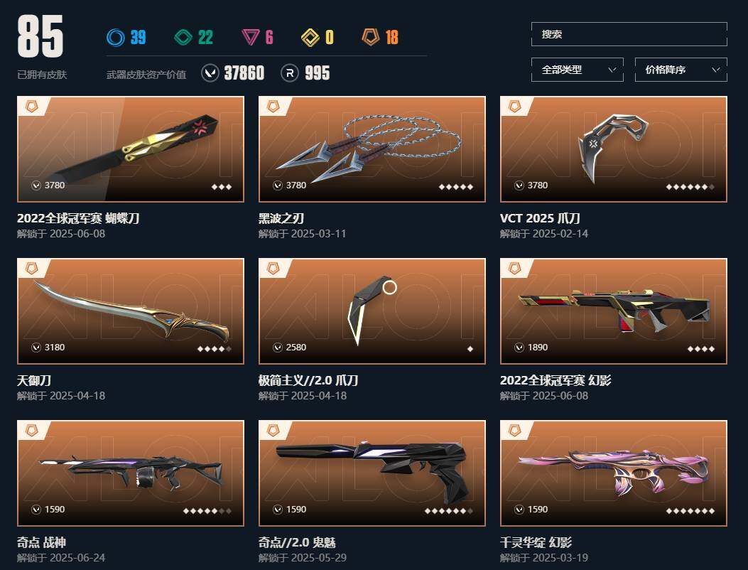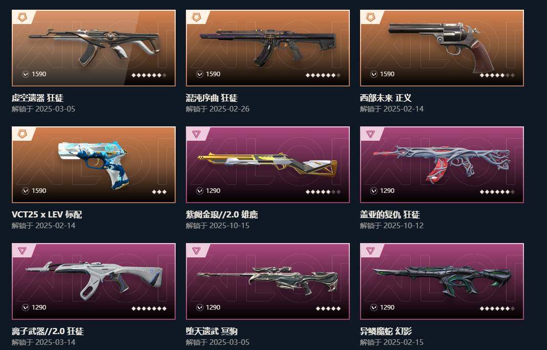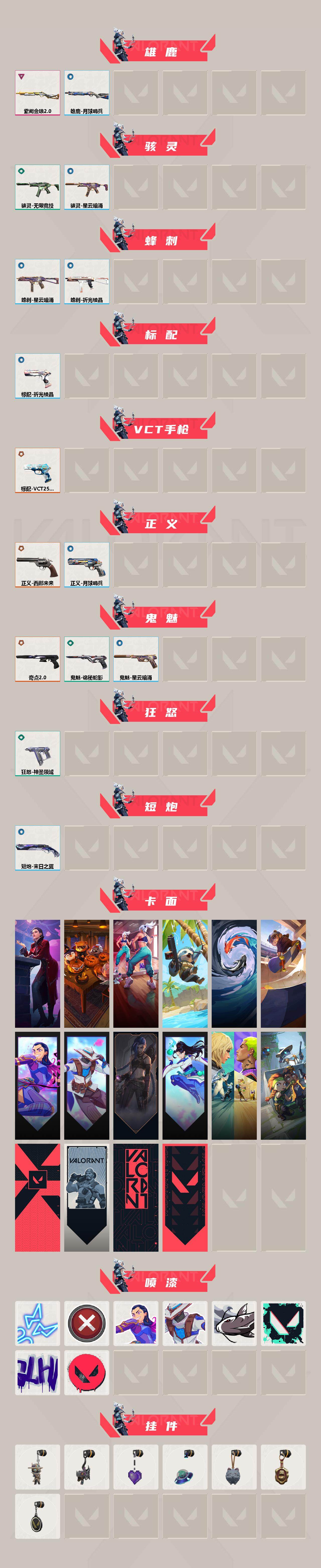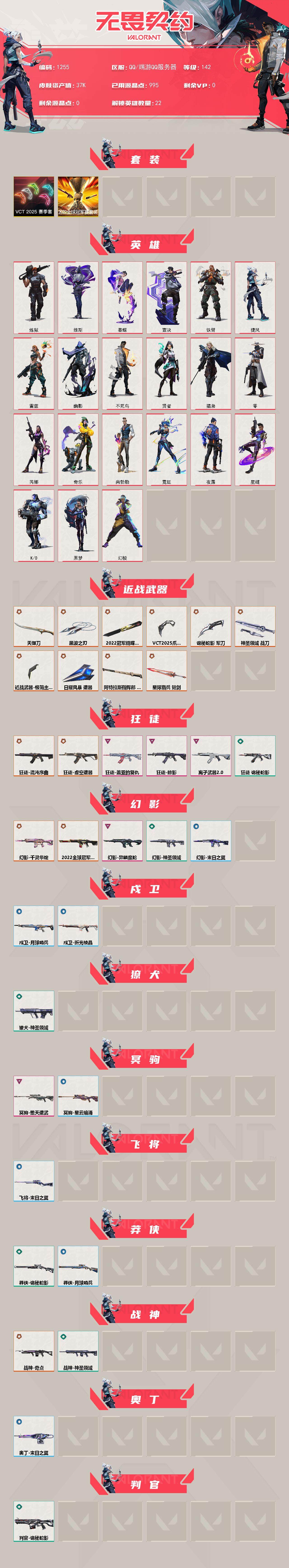 【1255】欢 385716【套装】:2022全球冠军赛套装,vct 2025 赛季套装 【英雄】:幻棱,炼狱,维斯,暮蝶,壹决,铁臂,捷风,雷兹,幽影,不死鸟,贤者,猎枭,零,芮娜,奇乐,尚勃勒,霓虹,夜露,星礈,k/o,黑梦 【近战 武器】:近战武器-2022全球冠军赛 蝴蝶刀,近战武器-vct 2025 爪刀,近战武器-黑波之刃,近战武器-极简主义//2.0 爪刀,近战武器-天御刀,近战武器-诡秘蛇影 军刀,近战武器-神圣领域 战刀,近战武器-日耀风暴 遗器,近战武器-阿特拉斯指挥部 甩棍,近战武器-星际猎兵 短剑 【狂徒】:狂徒-混沌序曲,狂徒-虚空遗器,狂徒-掠影,狂徒-盖亚的复仇,狂徒-离子武器//2.0,狂徒-诡秘蛇影 【幻影】:幻影-2022全球冠军赛,幻影-千灵华绽,幻影-异鳞魔蛇,幻影-神圣领域,幻影-末日之翼 【戍卫】:戍卫-月球哨兵,戍卫-折光棱晶 【獠犬】:獠犬-神圣领域 【冥驹】:冥驹-堕天遗武,冥驹-星云暗涌 【飞将】:飞将-末日之翼 【莽侠】:莽侠-诡秘蛇影,莽侠-月球哨兵 【战神】:战神-奇点,战神-神圣领域 【奥丁】:奥丁-末日之翼 【判官】:判官-诡秘蛇影 【雄鹿】:雄鹿-紫阙金琅//2.0,雄鹿-月球哨兵 【骇灵】:骇灵-无限竞技,骇灵-星云暗涌 【蜂刺】:蜂刺-星云暗涌,蜂刺-折光棱晶 【标配】:标配-折光棱晶 【vct手呛】:标配-vct25 x lev 【正义】:正义-西部未来,正义-月球哨兵 【鬼魅】:鬼魅-奇点//2.0,鬼魅-诡秘蛇影,鬼魅-星云暗涌 【狂怒】:狂怒-神圣领域 【短炮】:短炮-末日之翼 【卡面】:从黄昏到黎明 卡面,南瓜盛典 卡面,热舞环节 卡面,树懒大作战 卡面,红鳞松叶 卡面,clutch 卡面,无畏契约go!第一卷:芮娜 卡面,无畏契约go!第一卷:零 卡面,《双城之战》金克丝 卡面,无畏契约go!第一卷:贤者 卡面,钢锁vs盖可 卡面,别冒尖 卡面,代号红色 卡面,新兵报到 卡面,v契约 卡面,无畏契约 卡面 【喷漆】:霓光四射 喷漆,买装还是存钱 喷漆,无畏契约go!第一卷:芮娜 喷漆,无畏契约go!第一卷:零 喷漆,松叶 喷漆,胜利属于无畏契约 喷漆,glhf 喷漆,无畏契约 喷漆 【挂饰】:无畏契约go!第一卷 零 挂饰,鱼骨头 挂饰,薰衣草之心 挂饰,天外飞客 挂饰,《双城之战》魄罗 挂饰,海豹的认可 挂饰,无畏契约 纪念币 挂饰