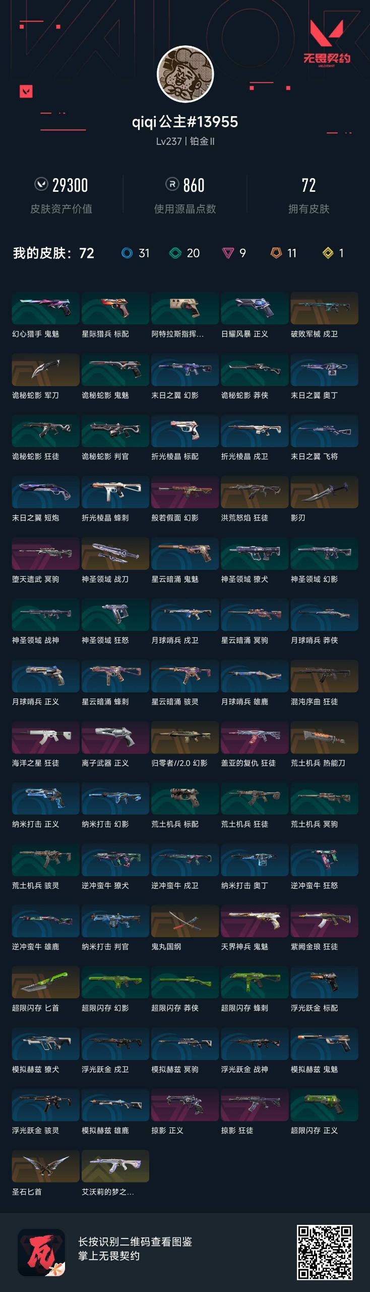 11橙皮 1金皮 9紫皮 72皮肤 28英雄 126卡面 860已用源晶 铂金段位 【近战武器皮肤】诡秘蛇影圣石匕首鬼丸国纲神圣领域 战刀匕首-超限闪存荒土机兵热能刀影刃 【佩呛皮肤】正义-离子武器鬼魅-天界神兵正义-掠影 【步呛皮肤】幻影-归零者//2.0狂徒-盖亚的复仇