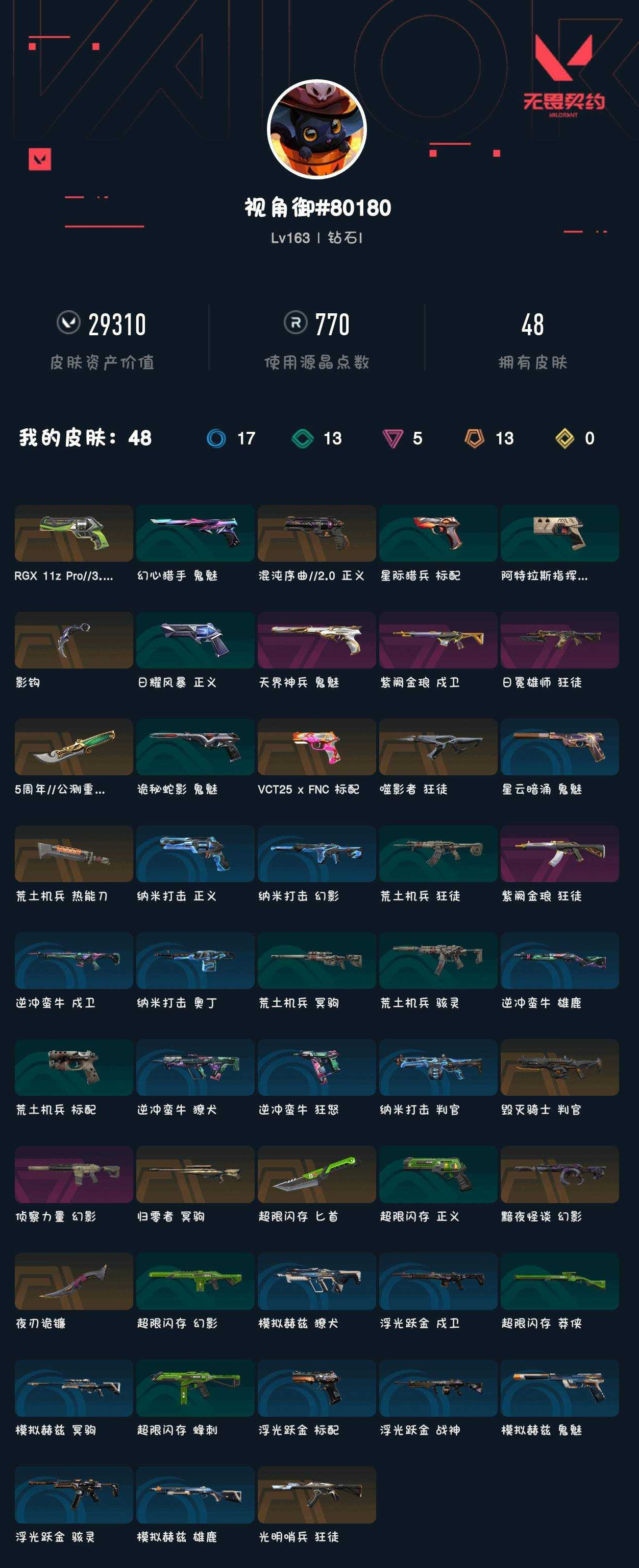 【无畏契约】【yhwww7282】等级:163,已用无畏点29310,已用源晶点770,橙皮:幻影-黯夜怪谈|近战-超限闪存 匕首|近战-夜刃诡镰|狂徒-光明哨兵|正义-rgx 11z pro3.0|冥驹-归零者|近战-荒土机兵 热能刀|判官-毁灭骑士|标配-vct25 x fnc|狂徒-噬影者|近战-5周年公测重制版 苍龙之刃|近战-影钩|正义-混沌序曲2.0__紫皮:鬼魅-天界神兵|狂徒-日冕雄师|幻影-侦察力量|狂徒-紫阙金琅|戍卫-紫阙金琅__段位:钻石__蓝皮:判官-纳米打击|正义-纳米打击|奥丁-纳米打击|幻影-纳米打击|雄鹿-逆冲蛮牛|狂怒-逆冲蛮牛|戍卫-逆冲蛮牛|獠犬-逆冲蛮牛|鬼魅-星云暗涌|骇灵-浮光跃金|标配-浮光跃金|戍卫-浮光跃金|战神-浮光跃金|鬼魅-模拟赫兹|獠犬-模拟赫兹|冥驹-模拟赫兹|雄鹿-模拟赫兹|标配-阿特拉斯指挥部__绿皮:狂徒-荒土机兵|标配-荒土机兵|骇灵-荒土机兵|冥驹-荒土机兵|正义-超限闪存|莽侠-超限闪存|幻影-超限闪存|蜂刺-超限闪存|鬼魅-诡秘蛇影|正义-日耀风暴|标配-星际猎兵|鬼魅-幻心猎手__英雄:尚勃勒|维斯|黑梦|斯凯|暮蝶|盖可|霓虹|壹决|k/o|幽影|夜露|钢锁|海神|奇乐|炼狱|铁臂|贤者|猎枭|钛狐|芮娜|零|捷风|蝰蛇|不死鸟|幻棱|雷兹|禁灭库存29310aaa/五周年龙刀/影钩/热门皮肤多