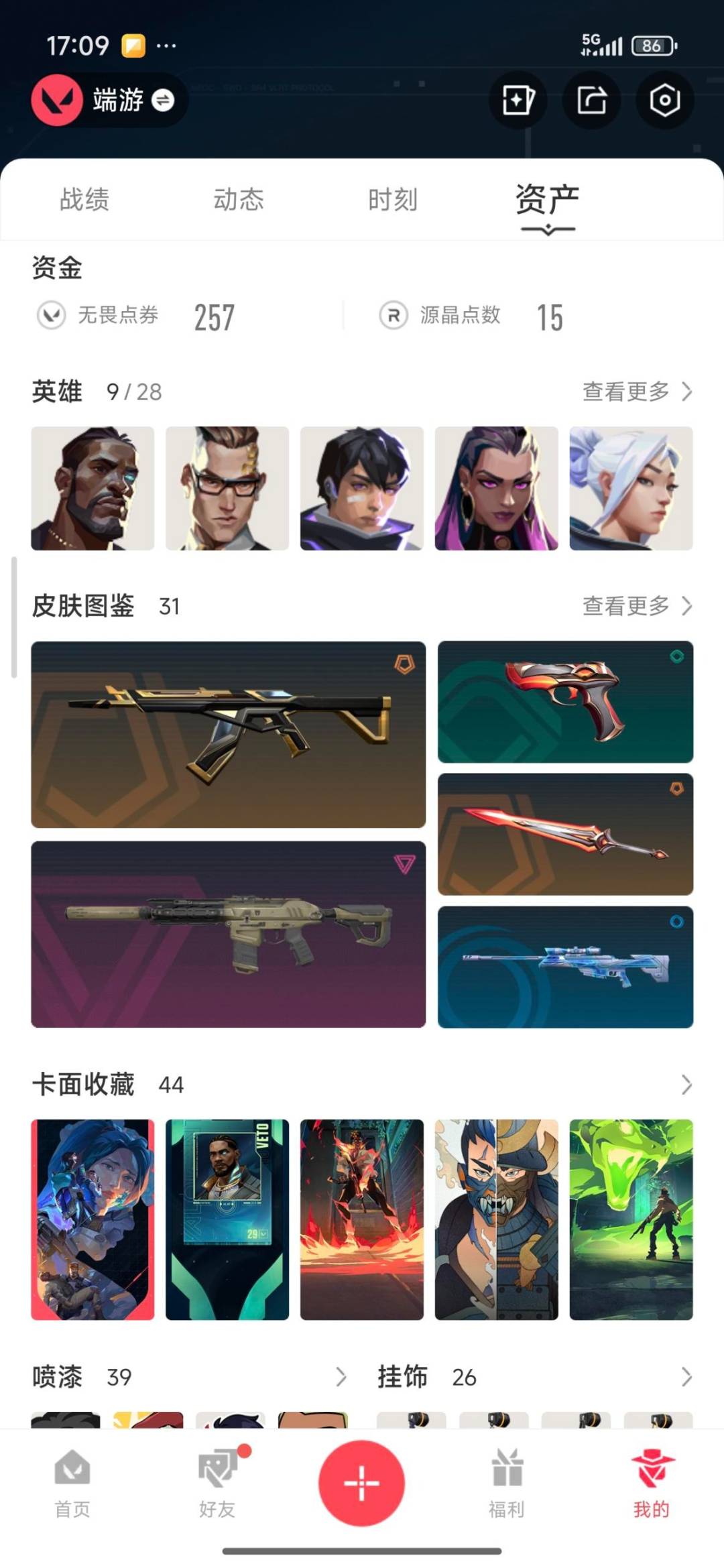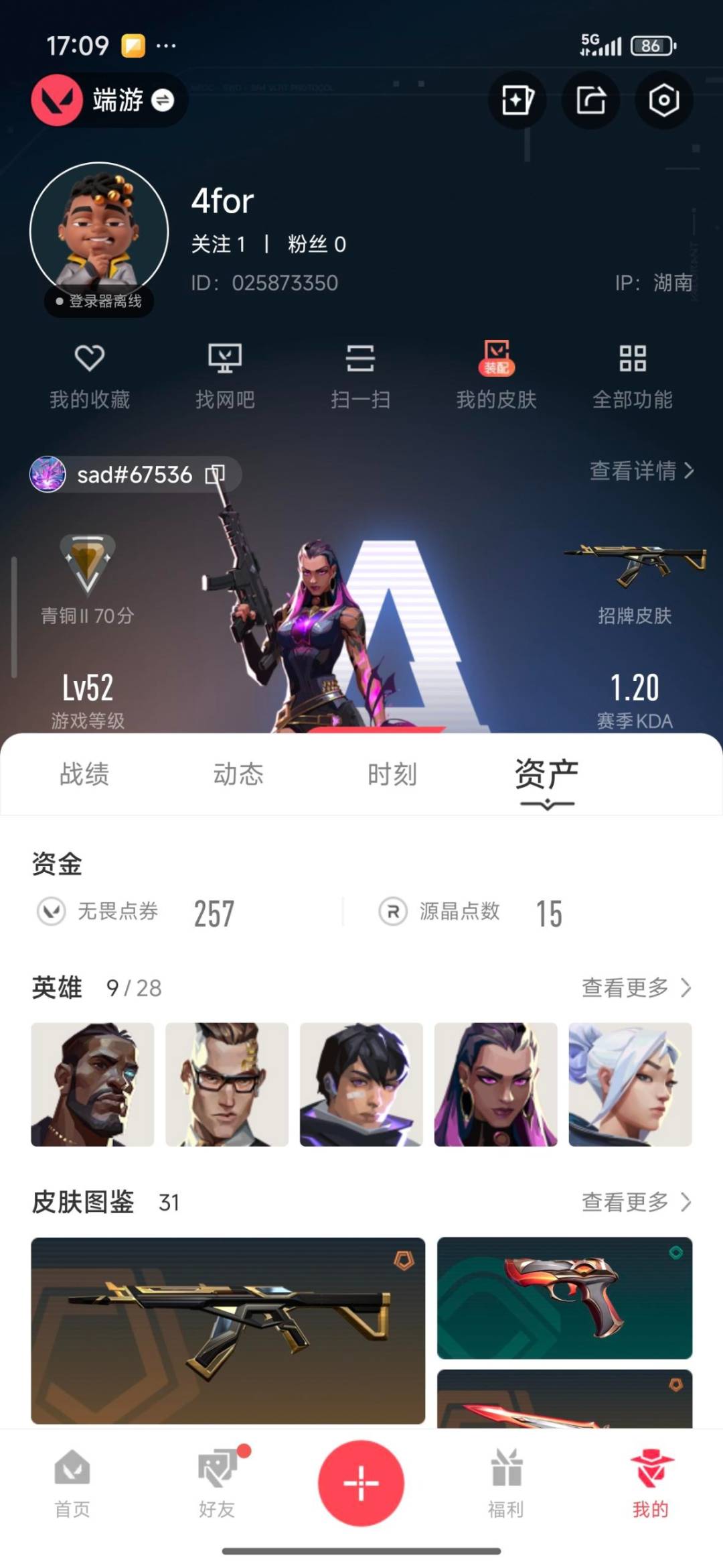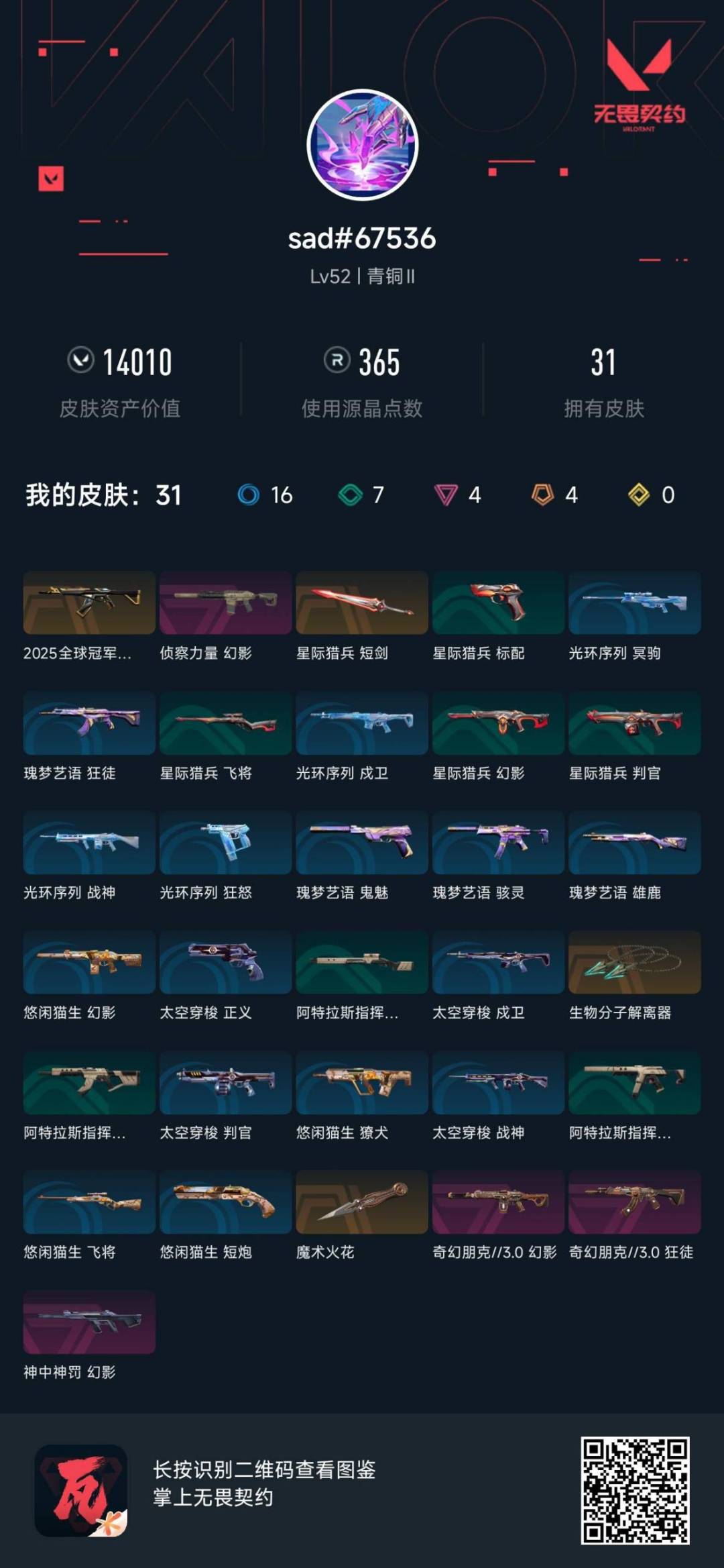 4橙皮 4紫皮 31皮肤 9英雄 44卡面 365已用源晶 青铜段位 【近战武器皮肤】:生物分子解离器星际猎兵 短剑魔术火花 【步呛皮肤】:幻影-神中神罚幻影-奇幻朋克3.02025全球冠军赛 狂徒奇幻朋克3.0狂徒幻影-侦察力量