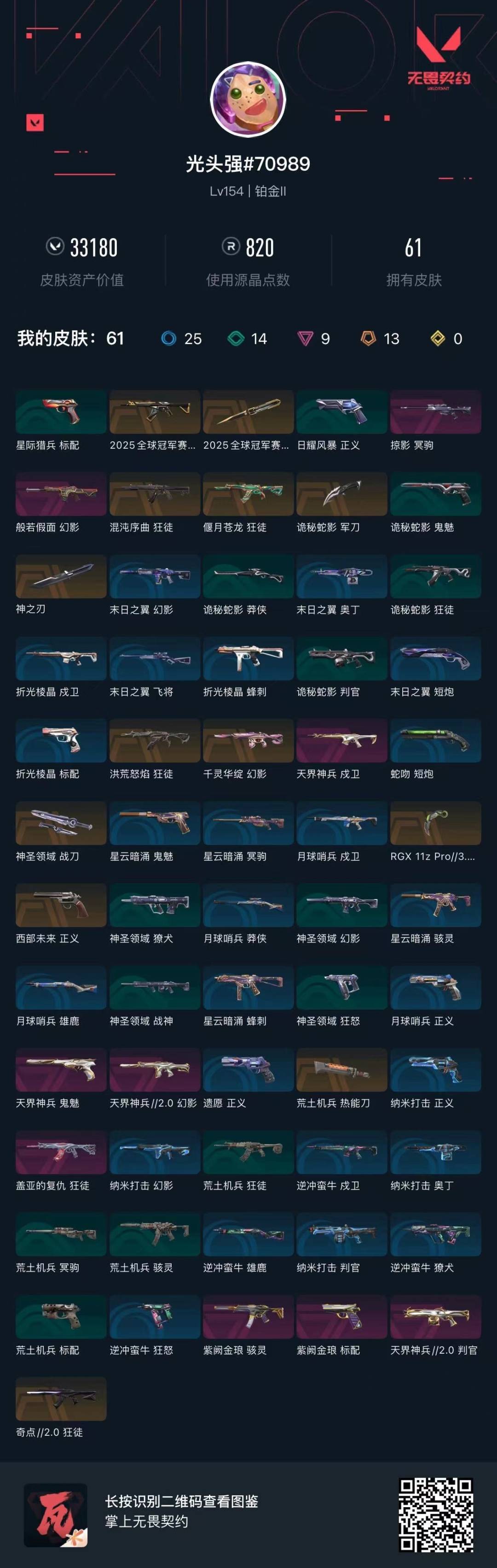 13橙皮 9紫皮 61皮肤 20英雄 90卡面 820已用源晶 铂金段位 【亮点皮肤】:幻影-2024全球冠军赛 【套装】:2025全球冠军赛 【近战武器皮肤】:神之刃神圣领域 战刀荒土机兵热能刀诡秘蛇影2025全球冠军赛 蝴蝶刀爪刀-rgx 11z pro 3.0 【佩呛皮肤】:正义-