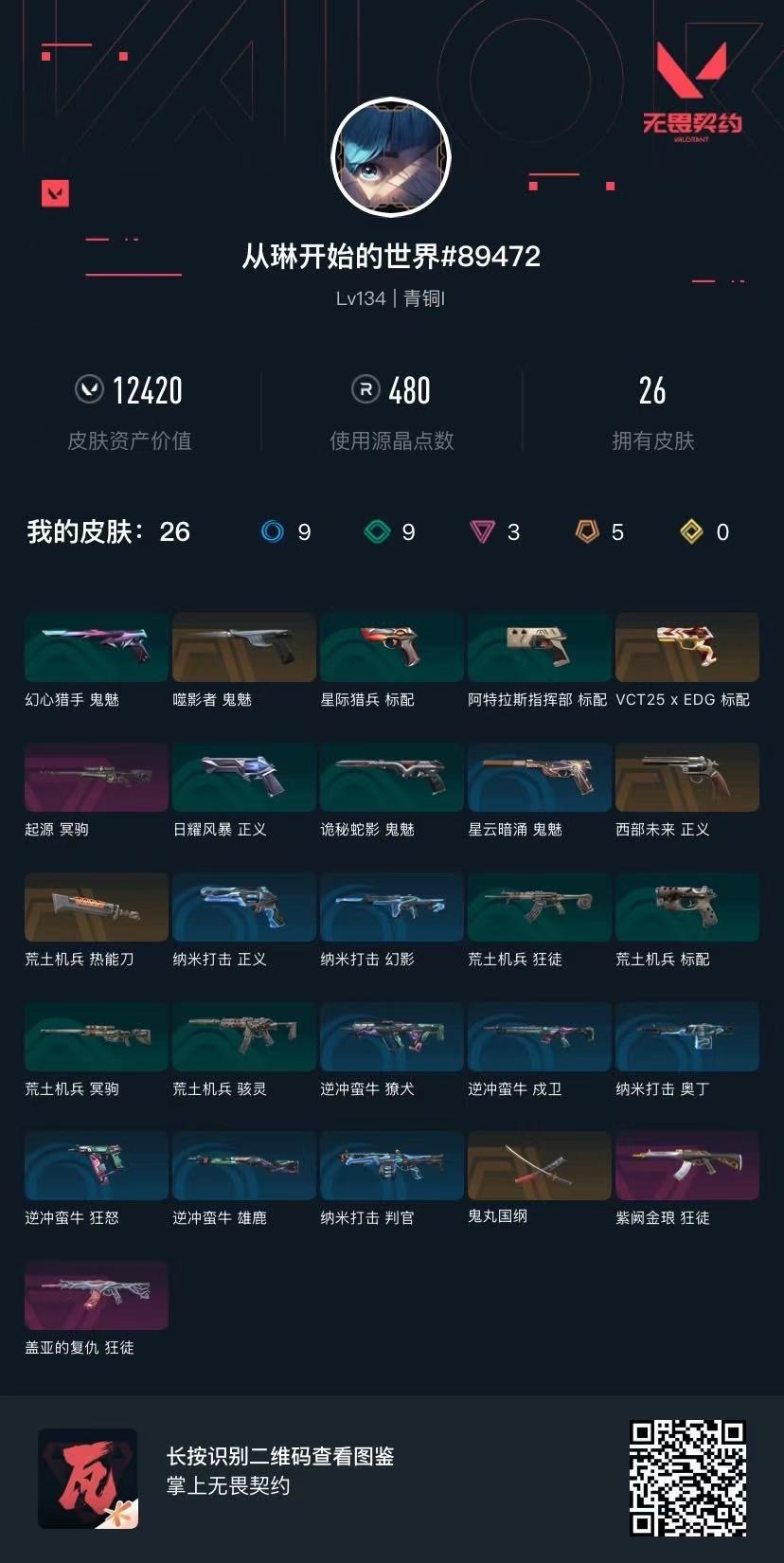 5橙皮 3紫皮 26皮肤 28英雄 77卡面 480已用源晶 青铜段位 【近战武器皮肤】:鬼丸国纲荒土机兵热能刀 【佩呛皮肤】:标配-vct25xedg正义-西部未来鬼魅-噬影者 【步呛皮肤】:狂徒-紫阙金琅狂徒-盖亚的复仇 【狙击呛皮肤】:冥驹-起源 【挂饰】:神中神挂饰双城之战小蛋糕