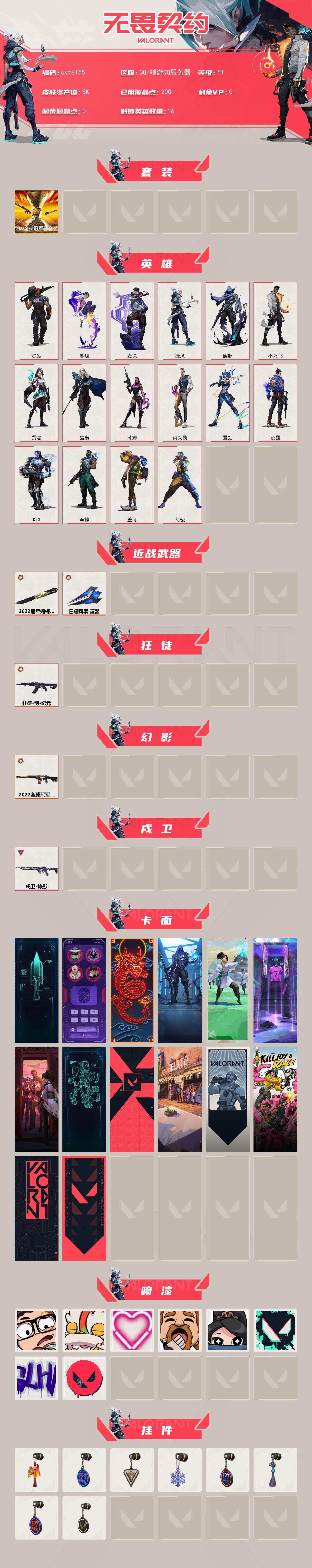 22套装-纪元ak-qyz8155-亮点皮肤:-幻影-2022全球冠军赛蝴蝶刀-2022全球冠军赛-套装:-2022全球冠军赛-步呛皮肤:-戍卫-掠影狂徒-创纪元-亮点:-【qyz8155】【套装】:2022全球冠军赛套装【英雄】:幻棱,炼狱,暮蝶,壹决,捷风,幽影,不死鸟,贤者,猎枭,芮娜,尚勃勒,霓虹,夜露,k/o,海神,盖可【近战-武器】:近战武器-2022全球冠军赛-蝴蝶刀,近战武器-日耀风暴-遗器【狂徒】:狂徒-创纪元【幻影】:幻影-2022全球冠军赛【戍卫】:戍卫-掠影【卡面】:零点嗅探设计图-卡面,清除名单-卡面,龍记-卡面,暗呛-卡面,夯实根基-卡面,"luie"-卡面,热烈欢迎-卡面,铁臂设计图-卡面,代号红色-卡面,冰淇淋店-卡面,新兵报到-卡面,友军火力-卡面,v契约-卡面,无畏契约-卡面【喷漆】:新潮流-喷漆,醒狮贺春-喷漆,蕊形灯-喷漆,老铁困了-喷漆,口袋贤者-喷漆,胜利属于无畏契约-喷漆,glhf-喷漆,无畏契约-喷漆【挂饰】:好运福爪-挂饰,第八季//第一幕-纪念币-挂饰,第七季:青铜-挂饰,冬日絮语-挂饰,第七季//第三幕-纪念币-挂饰,幸运中国结-挂饰,第七季//第二幕-纪念币-挂饰,无畏契约-纪念币-挂饰