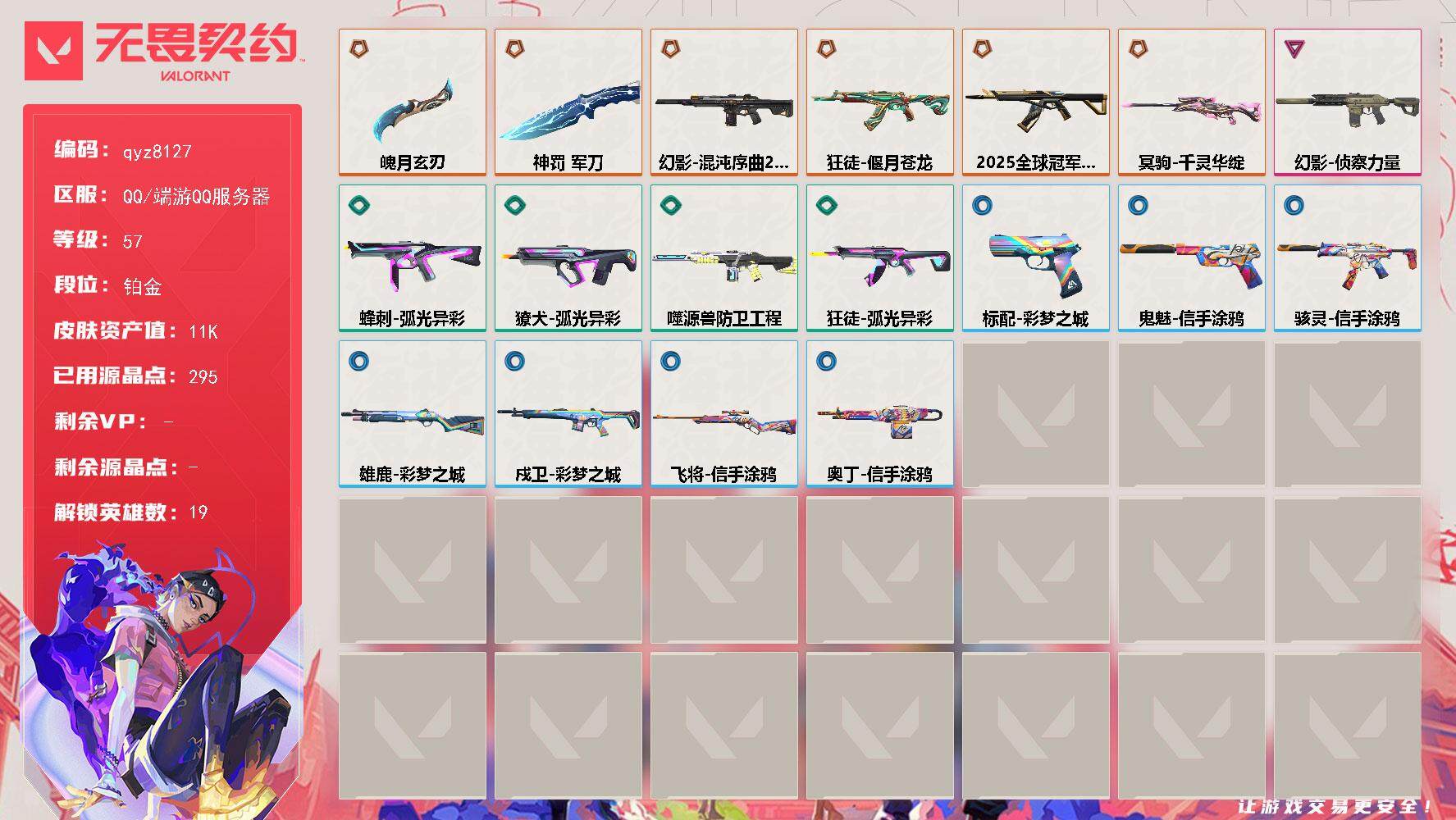 【qyz8127】25冠军呛-侦查力量-幻影-千灵鞘队华绽-冥驹-qyz8127-近战武器皮肤:-军刀-神罚魄月玄刃-步呛皮肤:-狂徒-偃月苍龙幻影-侦察力量2025全球冠军赛-狂徒幻影-混沌序曲20-狙击呛皮肤:-冥驹-千灵华绽-亮点:-【qyz8127】【英雄】:炼狱,暮蝶,铁臂,捷风,雷兹,幽影,不死鸟,贤者,猎枭,蝰蛇,零,芮娜,尚勃勒,霓虹,斯凯,k/o,盖可,黑梦【近战-武器】:近战武器-魄月玄刃,近战武器-神罚-军刀【狂徒】:狂徒-2025全球冠军赛,狂徒-偃月苍龙,狂徒-弧光异彩【幻影】:幻影-混沌序曲//20,幻影-侦察力量,幻影-噬源兽防卫工程【戍卫】:戍卫-彩梦之城【獠犬】:獠犬-弧光异彩【冥驹】:冥驹-千灵华绽【飞将】:飞将-信手涂鸦【奥丁】:奥丁-信手涂鸦【雄鹿】:雄鹿-彩梦之城【骇灵】:骇灵-信手涂鸦【蜂刺】:蜂刺-弧光异彩【标配】:标配-彩梦之城【鬼魅】:鬼魅-信手涂鸦【卡面】:南瓜盛典-卡面,正义的化身-卡面,梦幻奶茶-卡面,源能反应-卡面,零点嗅探设计图-卡面,沙雕爆能器-卡面,清除名单-卡面,龍记-卡面,完美调谐-卡面-,暗呛-卡面,铁臂设计图-卡面,代号红色-卡面,冰淇淋店-卡面,新兵报到-卡面,友军火力-卡面,v契约-卡面,无畏契约-卡面【喷漆】:捷风差距-喷漆,我的刀呢?-喷漆,双击点赞-喷漆,醒狮贺春-喷漆,蕊形灯-喷漆,老铁困了-喷漆,口袋贤者-喷漆,胜利属于无畏契约-喷漆,glhf-喷漆,无畏契约-喷漆【挂饰】:第九季//第二幕-纪念币-挂饰,第八季//第三幕-纪念币-挂饰,传世莲华-挂饰,第八季//第二幕-纪念币-挂饰-,好运福爪-挂饰,第八季//第一幕-纪念币-挂饰,第七季//第三幕-纪念币-挂饰,幸运中国结-挂饰,第七季//第二幕-纪念币-挂饰,无畏契约-纪念币-挂饰