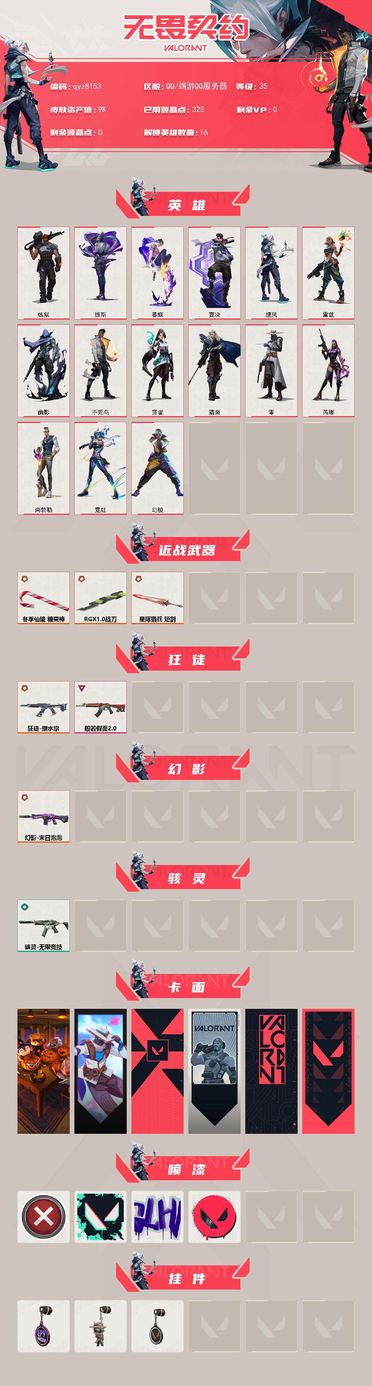 糖果棒-显卡战刀-塑水ak-qyz8153-近战武器皮肤:-冬季仙境糖果棒rgx-11z-pro-战刀-步呛皮肤:-狂徒-塑水宗狂徒-般若假面//20幻影-末日泡泡-亮点:-【qyz8153】【英雄】:幻棱,炼狱,维斯,暮蝶,壹决,捷风,雷兹,幽影,不死鸟,贤者,猎枭,零,芮娜,尚勃勒,霓虹【近战-武器】:近战武器-rgx-11z-pro-战刀,近战武器-冬季仙境-糖果棒,近战武器-星际猎兵-短剑【狂徒】:狂徒-塑水宗,狂徒-般若假面//20【幻影】:幻影-末日泡泡【骇灵】:骇灵-无限竞技【卡面】:南瓜盛典-卡面,无畏契约go!第一卷:零-卡面,代号红色-卡面,新兵报到-卡面,v契约-卡面,无畏契约-卡面【喷漆】:买装还是存钱-喷漆,胜利属于无畏契约-喷漆,glhf-喷漆,无畏契约-喷漆【挂饰】:第九季//第三幕-纪念币-挂饰,无畏契约go!第一卷-零-挂饰,无畏契约-纪念币-挂饰