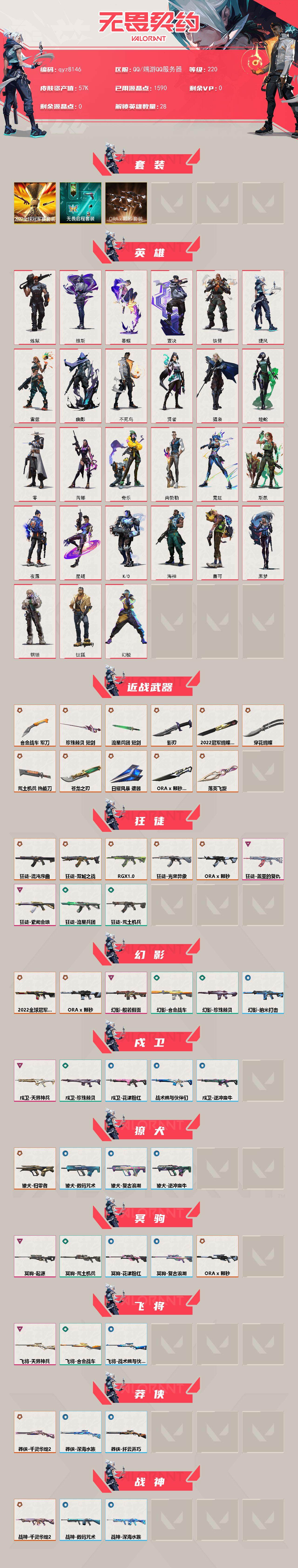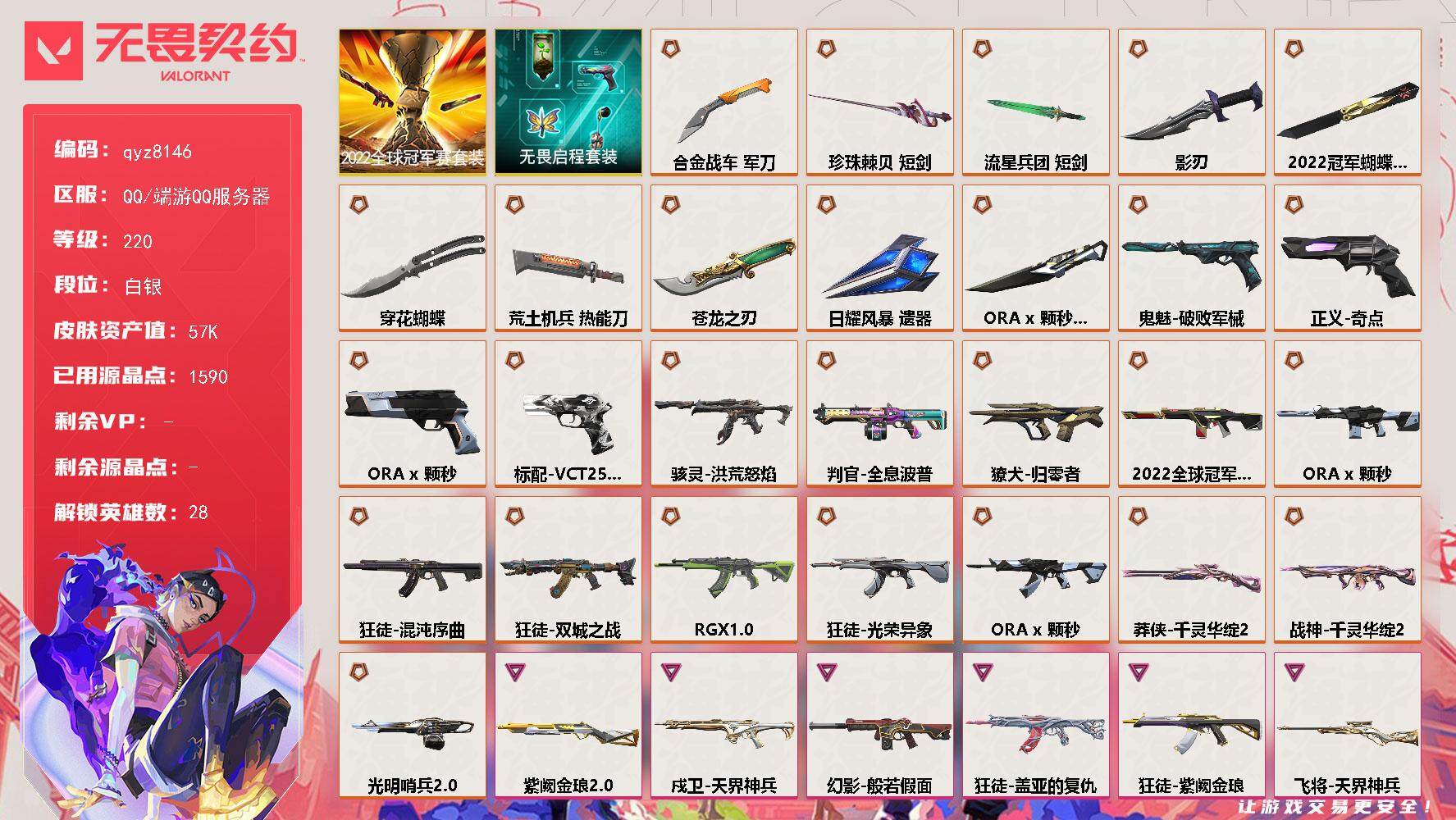 22冠军套-ax颗秒套-多热门白银号-qyz8146-亮点皮肤:-幻影-2022全球冠军赛蝴蝶刀-2022全球冠军赛-套装:-2022全球冠军赛-近战武器皮肤:-军刀-合金战车短剑-珍珠棘贝落英飞旋短剑-流星兵团影刃荒土机兵热能刀穿花蝴蝶苍龙之刃-步呛皮肤:-狂徒-紫阙金琅狂徒-盖亚的复仇獠犬-归零者戍卫-天界神兵幻影-般若假面狂徒-混沌序曲狂徒-双城之战狂徒-rgx-11z-pro狂徒-光荣异象-佩呛皮肤:-正义-奇点鬼魅-破败军械标配-vct25xts-狙击呛皮肤:-冥驹-起源飞将-天界神兵莽侠-千灵华绽//20-冲锋呛皮肤:-骇灵-洪荒怒焰-霰弹呛皮肤:-雄鹿-紫阙金琅20判官-全息波普-机呛皮肤:-奥丁-光明哨兵20战神-千灵华绽//20-亮点:-【qyz8146】【套装】:2022全球冠军赛套装,a-x-颗秒套装,无畏启程套装【英雄】:幻棱,炼狱,维斯,暮蝶,钛狐,壹决,铁臂,捷风,雷兹,幽影,不死鸟,贤者,猎枭,蝰蛇,零,芮娜,奇乐,尚勃勒,霓虹,斯凯,夜露,星礈,k/o,海神,盖可,黑梦,钢锁【近战-武器】:近战武器-2022全球冠军赛-蝴蝶刀,近战武器-a-x-颗秒-军刀,近战武器-5周年//公测重制版-苍龙之刃,近战武器-穿花蝴蝶,近战武器-落英飞旋,近战武器-珍珠棘贝-短剑,近战武器-流星兵团-短剑,近战武器-合金战车-军刀,近战武器-荒土机兵-热能刀,近战武器-影刃,近战武器-日耀风暴-遗器【狂徒】:狂徒-混沌序曲,狂徒-双城之战,狂徒-rgx-11z-pro,狂徒-光荣异象,狂徒-a-x-颗秒,狂徒-盖亚的复仇,狂徒-紫阙金琅,狂徒-荒土机兵,狂徒-流星兵团【幻影】:幻影-2022全球冠军赛,幻影-a-x-颗秒,幻影-般若假面,幻影-合金战车,幻影-珍珠棘贝,幻影-纳米打击【戍卫】:戍卫-天界神兵,戍卫-珍珠棘贝,戍卫-花漾粉红,戍卫-逆冲蛮牛,戍卫-战术熊与伙伴们【獠犬】:獠犬-归零者,獠犬-复古浪潮,獠犬-逆冲蛮牛,獠犬-数码咒术【冥驹】:冥驹-a-x-颗秒,冥驹-起源,冥驹-荒土机兵,冥驹-复古浪潮,冥驹-花漾粉红【飞将】:飞将-天界神兵,飞将-合金战车,飞将-战术熊与伙伴们【莽侠】:莽侠-千灵华绽//20,莽侠-深海水族,莽侠-纤云弄巧【战神】:战神-千灵华绽//20,战神-深海水族,战神-数码咒术