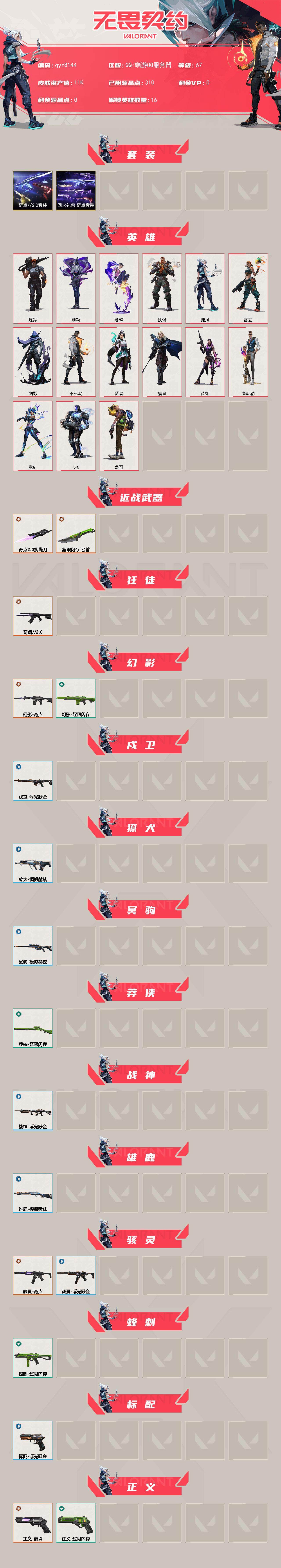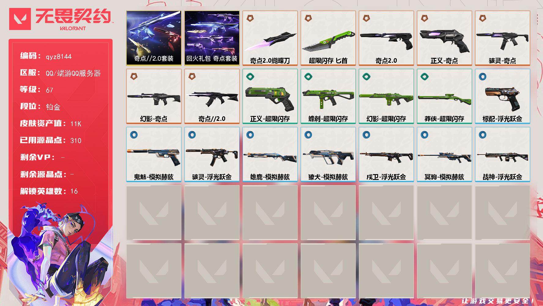lv67-铂金iii-起点全家桶精品小号-奇点-幻影-奇点//20-狂徒-奇点//20-蝴蝶刀-奇点/20-鬼魅-奇点-正义-奇点-骇灵-qyz8144-套装:-奇点套装奇点//20套装-近战武器皮肤:-匕首-超限闪存蝴蝶刀-奇点//20-步呛皮肤:-幻影-奇点狂徒-奇点//20-佩呛皮肤:-正义-奇点鬼魅-奇点//20-冲锋呛皮肤:-骇灵-奇点-亮点:-【qyz8144】【套装】:奇点//20套装,回火礼包:奇点套装【英雄】:炼狱,维斯,暮蝶,铁臂,捷风,雷兹,幽影,不死鸟,贤者,猎枭,芮娜,尚勃勒,霓虹,k/o,盖可【近战-武器】:近战武器-奇点//20-蝴蝶刀,近战武器-超限闪存-匕首【狂徒】:狂徒-奇点//20【幻影】:幻影-奇点,幻影-超限闪存【戍卫】:戍卫-浮光跃金【獠犬】:獠犬-模拟赫兹【冥驹】:冥驹-模拟赫兹【莽侠】:莽侠-超限闪存【战神】:战神-浮光跃金【雄鹿】:雄鹿-模拟赫兹【骇灵】:骇灵-奇点,骇灵-浮光跃金【蜂刺】:蜂刺-超限闪存【标配】:标配-浮光跃金【正义】:正义-奇点,正义-超限闪存【鬼魅】:鬼魅-奇点//20,鬼魅-模拟赫兹【卡面】:《双城之战》拥抱-卡面,精灵大战-卡面,欢迎来到底城-卡面,南瓜盛典-卡面,vct-cn首冠-卡面,唱片的故事-卡面,钢弓与箭弦-卡面,排除故障-卡面,奇点//20-卡面,战术桌游-卡面,悠享食光-卡面,修车达人-卡面,热舞环节-卡面,模拟赫兹-卡面,浮光跃金-卡面,超限闪存-卡面,维斯工牌-卡面,正义的化身-卡面,失而复得-卡面,无畏契约go!第一卷:芮娜-卡面,清除名单-卡面,无畏契约go!第一卷:零-卡面,暗呛-卡面,"luie"-卡面,代号红色-卡面,冰淇淋店-卡面,新兵报到-卡面,友军火力-卡面,v契约-卡面,无畏契约-卡面【喷漆】:嗨宝南瓜灯-喷漆,嘭!-喷漆,都算到了-喷漆,控场勿近-喷漆,皮蛋呼呼-喷漆,像素星礈-喷漆,图谋不轨的零-喷漆,小丑猫-喷漆,模拟赫兹-喷漆,高丽风情小熊-喷漆,奇点//20-喷漆,蹲到一个-喷漆,全力集中-喷漆,超限闪存-喷漆,rua一下-喷漆,熊抱-喷漆,蛋糕还是爆能器?-喷漆,高丽风情小虎-喷漆,记在小本本-喷漆,防弹企鹅-喷漆,高丽风情小蛙-喷漆,双击点赞-喷漆,买装还是存钱-喷漆,红鳞-喷漆,胜利属于