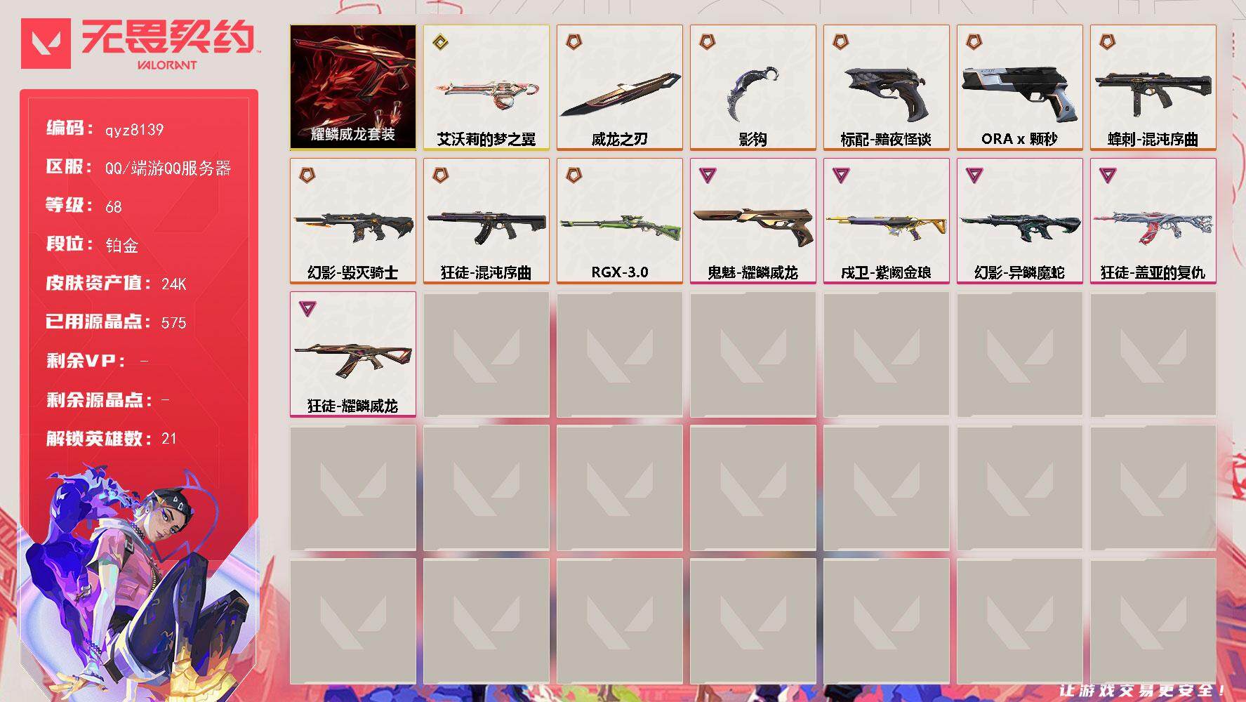 威龙小刀/掠夺爪/盖亚威龙ak-qyz8139-套装:-耀鳞威龙套装-近战武器皮肤:-威龙之刃影钩-步呛皮肤:-戍卫-紫阙金琅狂徒-盖亚的复仇狂徒-耀鳞威龙狂徒-混沌序曲幻影-毁灭骑士幻影-异鳞魔蛇-佩呛皮肤:-鬼魅-耀鳞威龙标配-黯夜怪谈-狙击呛皮肤:-莽侠-rgx-11z-pro-30-冲锋呛皮肤:-蜂刺-混沌序曲-机呛皮肤:-奥丁-艾沃莉的梦之翼-亮点:-【qyz8139】【套装】:耀鳞威龙套装【英雄】:炼狱,维斯,暮蝶,壹决,铁臂,捷风,雷兹,幽影,不死鸟,贤者,猎枭,零,芮娜,尚勃勒,霓虹,斯凯,夜露,k/o,黑梦,钢锁【近战-武器】:近战武器-影钩,近战武器-威龙之刃【狂徒】:狂徒-混沌序曲,狂徒-盖亚的复仇,狂徒-耀鳞威龙【幻影】:幻影-毁灭骑士,幻影-异鳞魔蛇【戍卫】:戍卫-紫阙金琅【莽侠】:莽侠-rgx-11z-pro//30【奥丁】:奥丁-艾沃莉的梦之翼【蜂刺】:蜂刺-混沌序曲【标配】:标配-黯夜怪谈【正义】:正义-a-x-颗秒【鬼魅】:鬼魅-耀鳞威龙【卡面】:《双城之战》拥抱-卡面,欢迎来到底城-卡面,南瓜盛典-卡面,时间到-卡面,最高舞台-卡面,梦幻奶茶-卡面,无畏契约go!第一卷:芮娜-卡面,清除名单-卡面,无畏契约go!第一卷:零-卡面,龍记-卡面,《双城之战》金克丝-卡面,完美调谐-卡面-,暗呛-卡面,代号红色-卡面,新兵报到-卡面,v契约-卡面,无畏契约-卡面【喷漆】:嘭!-喷漆,都算到了-喷漆,控场勿近-喷漆,超级粉丝-喷漆,捷风差距-喷漆,买装还是存钱-喷漆,醒狮贺春-喷漆,无畏契约go!第一卷:芮娜-喷漆,红鳞-喷漆,无畏契约go!第一卷:零-喷漆,无畏契约go!第一卷:捷风-喷漆,无畏契约go!第一卷:贤者-喷漆,暴走萝莉-喷漆,松叶-喷漆,无畏契约go!第一卷:奇乐-喷漆,蕊形灯-喷漆,胜利属于无畏契约-喷漆,glhf-喷漆,无畏契约-喷漆【挂饰】:《双城之战》小蛋糕-挂饰,第九季//第三幕-纪念币-挂饰,鱼骨头-挂饰,袖珍捷风-挂饰,第九季//第一幕-纪念币-挂饰,第八季//第二幕-纪念币-挂饰-,天外飞客-挂饰,好运福爪-挂饰,红鳞松叶-挂饰,《双城之战》魄罗-挂饰,瞄这里-挂饰,第八季//第一幕-纪念币-挂饰,无畏契约-纪念币-挂饰