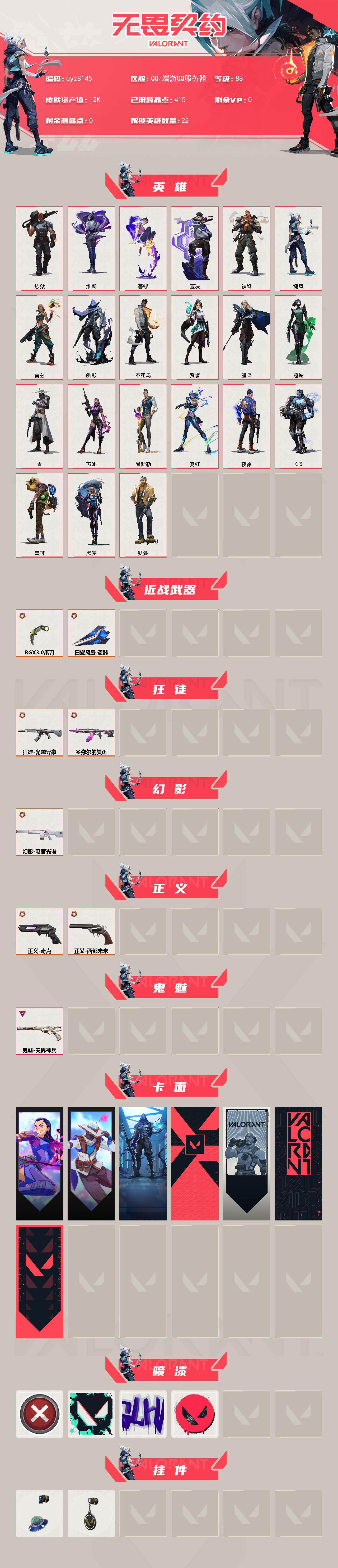 光荣异象-狂徒lv88-钻石i-奇点-正义-多弥尔的复仇-狂徒-显卡爪-天界神兵-鬼魅-电音光谱-幻影-西部未来-正义-多组合精品小号-qyz8145-近战武器皮肤:-爪刀-rgx-11z-pro-30-步呛皮肤:-幻影-电音光谱狂徒-光荣异象-佩呛皮肤:-正义-奇点鬼魅-天界神兵正义-西部未来-亮点:-【qyz8145】【英雄】:炼狱,维斯,暮蝶,钛狐,壹决,铁臂,捷风,雷兹,幽影,不死鸟,贤者,猎枭,蝰蛇,零,芮娜,尚勃勒,霓虹,夜露,k/o,盖可,黑梦【近战-武器】:近战武器-rgx-11z-pro//30-爪刀,近战武器-日耀风暴-遗器【狂徒】:狂徒-光荣异象,狂徒-多弥尔的复仇【幻影】:幻影-电音光谱,幻影-电音光谱【正义】:正义-奇点,正义-西部未来【鬼魅】:鬼魅-天界神兵【卡面】:无畏契约go!第一卷:芮娜-卡面,无畏契约go!第一卷:零-卡面,暗呛-卡面,代号红色-卡面,新兵报到-卡面,v契约-卡面,无畏契约-卡面【喷漆】:买装还是存钱-喷漆,胜利属于无畏契约-喷漆,glhf-喷漆,无畏契约-喷漆【挂饰】:天外飞客-挂饰,无畏契约-纪念币-挂饰