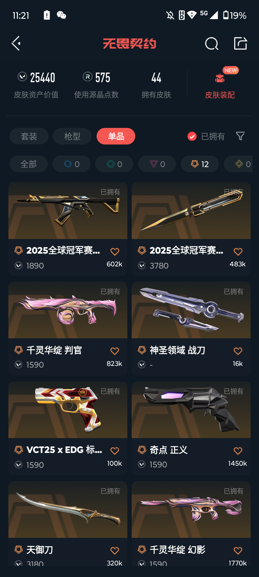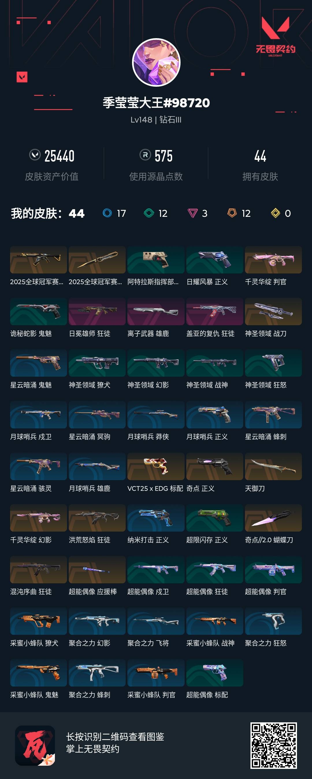 [14724651]s192184 (2025全球冠军赛套装)无畏契约/148等级/钻石段位/27英雄/44皮肤/资产25440/已使用r点575/剩余r点285/ 2025全球冠军赛-狂徒2025全球冠军赛-蝴蝶刀,混沌序曲-狂徒,千灵华绽-幻影,洪荒怒焰-狂徒,盖亚的复仇-狂徒,日冕雄师-狂徒,神圣领域-战刀,超能偶像-应援棒,奇点//2.0-蝴蝶刀,天御刀,千灵华绽-判官,离子武器-雄鹿,vct25-x-edg-标配,奇点-正义