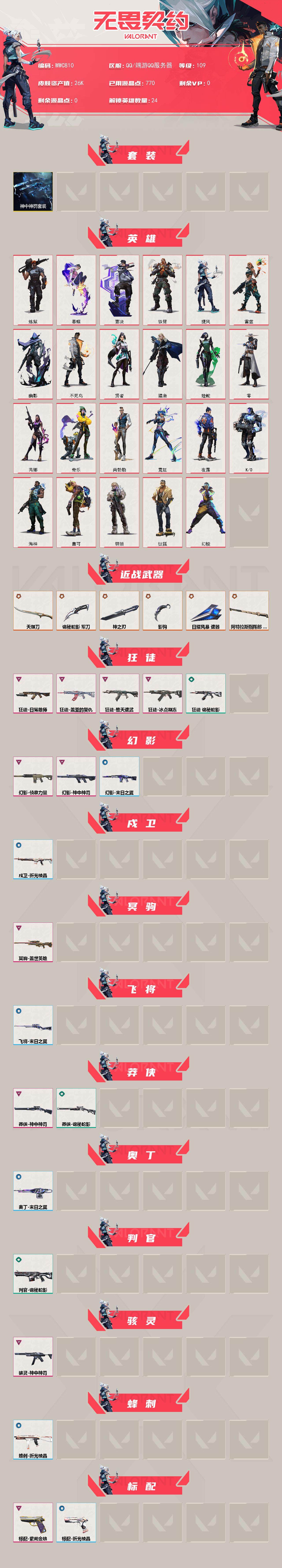 【wwc810】终极7/卓越12/皮肤56/等级109/段位:铂金/神中神罚套装/幻棱/炼狱/暮蝶/钛狐/壹决/铁臂/捷风/雷兹/幽影/不死鸟/贤者/猎枭/蝰蛇/零/芮娜/奇乐/尚勃勒/霓虹/夜露/k/o/海神/盖可/钢锁/近战武器-影钩/近战武器-神之刃/近战武器-天御刀/近战武器-诡秘蛇影 军刀/近战武器-日耀风暴 遗器/近战武器-阿特拉斯指挥部 甩棍/狂徒-冰点凝冻/狂徒-堕天遗武/狂徒-盖亚的复仇/狂徒-日冕雄师/狂徒-诡秘蛇影/幻影-侦察力量/幻影-神中神罚/幻影-末日之翼/戍卫-折光棱晶/冥驹-盖世英雄/飞将-末日之翼/莽侠-神中神罚/莽侠-诡秘蛇影/奥丁-末日之翼/判官-诡秘蛇影/骇灵-神中神罚/蜂刺-折光棱晶/标配-紫阙金琅/标配-折光棱晶/正义-奇点/鬼魅-耀鳞威龙/鬼魅-诡秘蛇影/狂怒-神中神罚/短炮-好搭档/短炮-末日之翼/树懒大作战 卡面/无畏契约go!第一卷:芮娜 卡面/无畏契约go!第一卷:零 卡面/无垠星环 卡面/《双城之战》金克丝 卡面/代号红色 卡面/新兵报到 卡面/v契约 卡面/无畏契约 卡面/买装还是存钱 喷漆/放下武器 喷漆/胜利属于无畏契约 喷漆/glhf 喷漆/无畏契约 喷漆/无畏契约go!第一卷 芮娜 挂饰/z世代特饮 挂饰/动力机箱 挂饰/天外飞客 挂饰/无畏契约 纪念币 挂饰