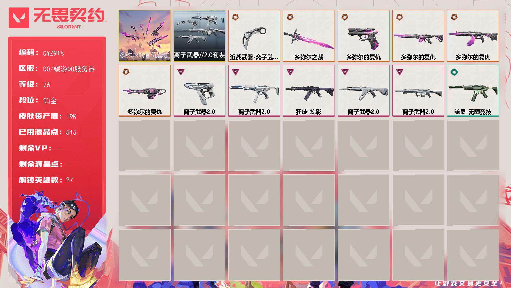 【qyz918】终极7/卓越5/皮肤26/等级76/段位:铂金/多弥尔的复仇套装/离子武器2.0/幻棱/炼狱/暮蝶/钛狐/壹决/铁臂/捷风/雷兹/幽影/不死鸟/贤者/猎枭/蝰蛇/零/芮娜/奇乐/尚勃勒/霓虹/斯凯/夜露/星礈/k/o/海神/盖可/黑梦/钢锁/近战武器-多弥尔之裁/离子武器2.0爪刀/狂徒-多弥尔的复仇/掠影-狂徒/狂徒-离子武器//2.0/戍卫-多弥尔的复仇/战神-离子