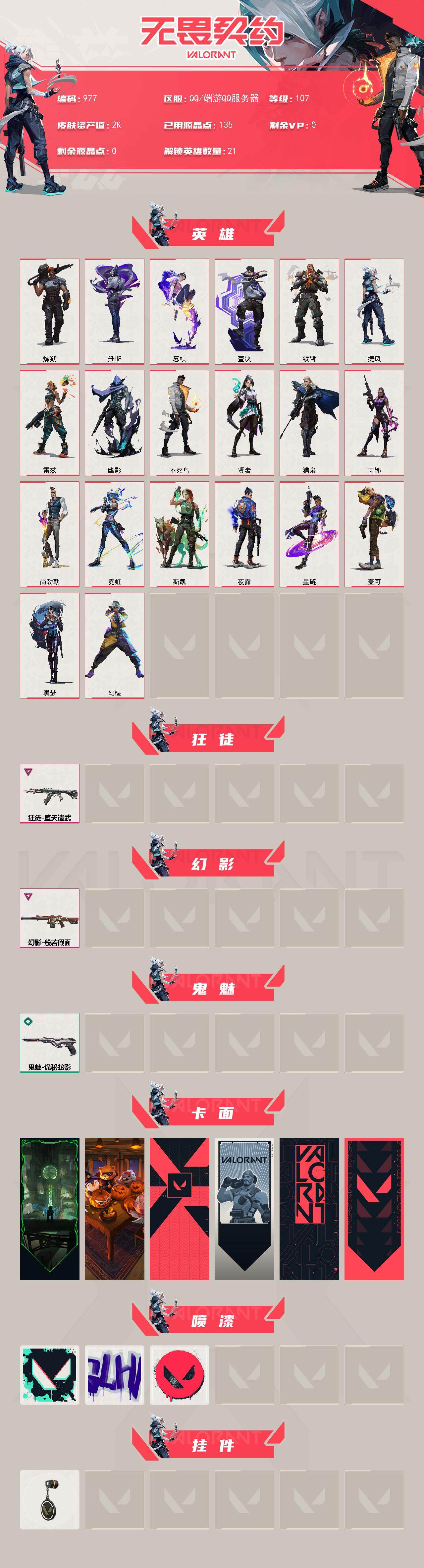 [14738328]【英雄】:幻棱,炼狱,维斯,暮蝶,壹决,铁臂,捷风,雷兹,幽影,不死鸟,贤者,猎枭,芮娜,尚勃勒,霓虹,斯凯,夜露,星礈,盖可,黑梦 【狂徒】:狂徒-堕天遗武 【幻影】:幻影-般若假面 【鬼魅】:鬼魅-诡秘蛇影 【卡面】:欢迎来到底城 卡面,南瓜盛典 卡面,代号红色 卡面,新兵报到 卡面,v契约 卡面,无畏契约 卡面 【喷漆】:胜利属于无畏契约 喷漆,glhf 喷漆,无畏契约 喷漆 【挂饰】:无畏契约 纪念币 挂饰