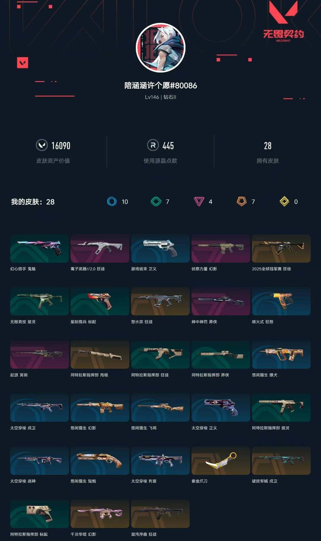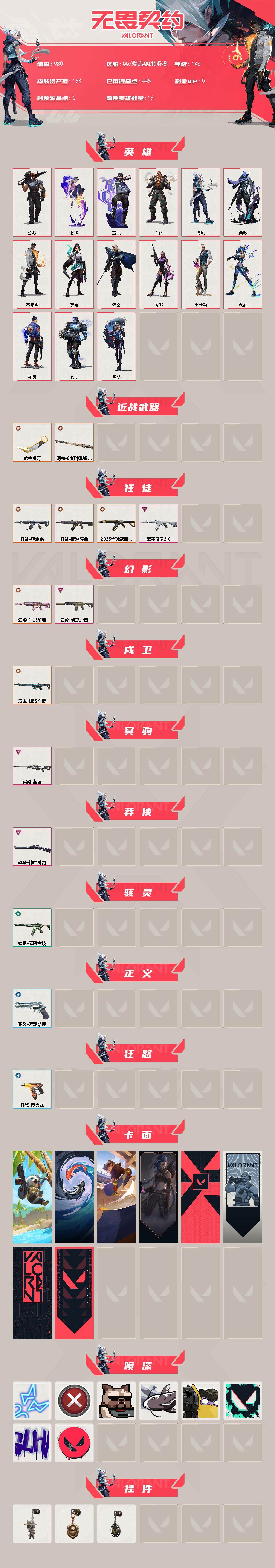 [14739272]【英雄】:炼狱,暮蝶,壹决,铁臂,捷风,幽影,不死鸟,贤者,猎枭,芮娜,尚勃勒,霓虹,夜露,k/o,黑梦 【近战 武器】:近战武器-紫金爪刀,近战武器-阿特拉斯指挥部 甩棍 【狂徒】:狂徒-2025全球冠军赛,狂徒-混沌序曲,狂徒-塑水宗,狂徒-离子武器//2.0 【幻影】:幻影-千灵华绽,幻影-侦察力量 【戍卫】:戍卫-破败军械 【冥驹】:冥驹-起源 【莽侠】:莽侠-神中神罚 【骇灵】:骇灵-无限竞技 【正义】:正义-游戏结束 【狂怒】:狂怒-喷火式 【卡面】:树懒大作战 卡面,红鳞松叶 卡面,clutch 卡面,《双城之战》金克丝 卡面,代号红色 卡面,新兵报到 卡面,v契约 卡面,无畏契约 卡面 【喷漆】:霓光四射 喷漆,买装还是存钱 喷漆,关门放狗 喷漆,松叶 喷漆,放下武器 喷漆,胜利属于无畏契约 喷漆,glhf 喷漆,无畏契约 喷漆 【挂饰】:无畏契约go!第一卷 零 挂饰,海豹的认可 挂饰,无畏契约 纪念币 挂饰