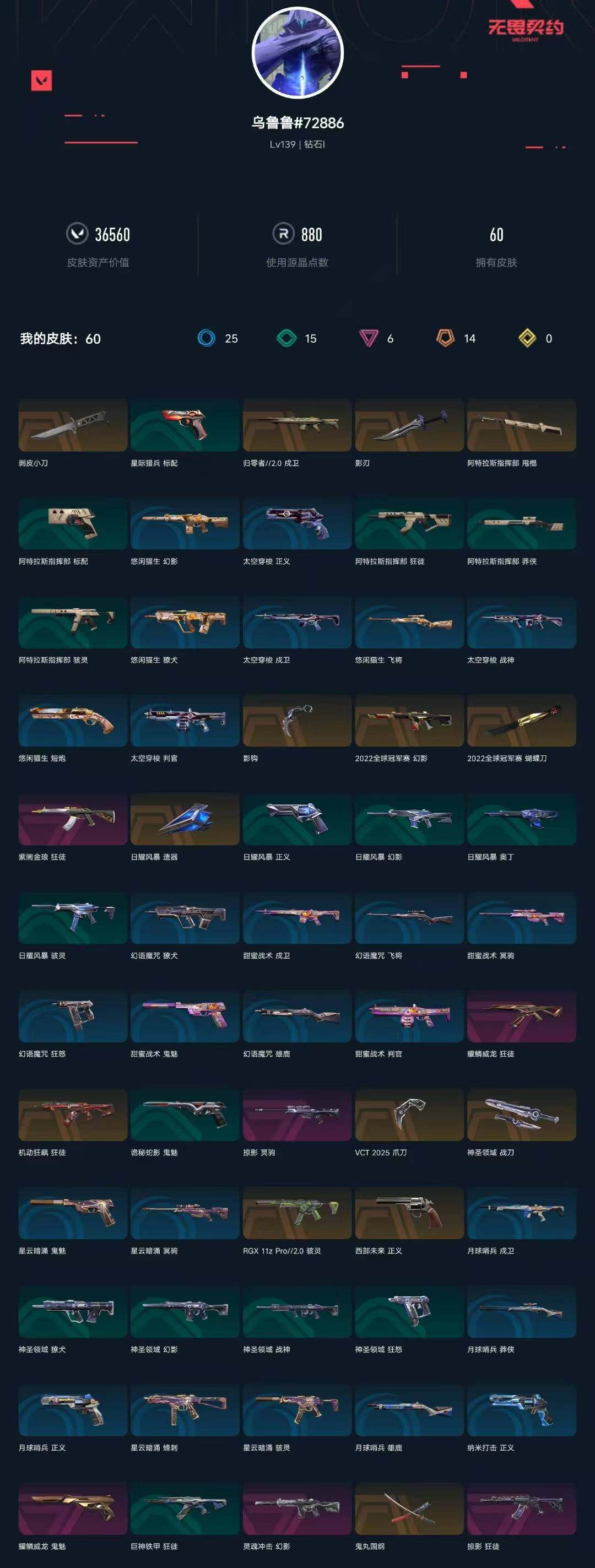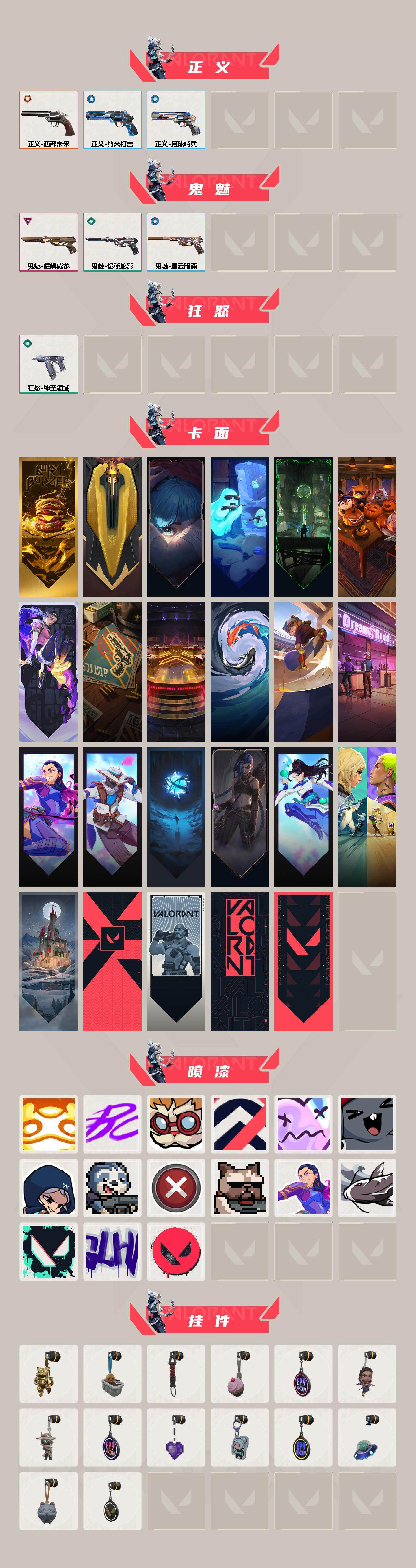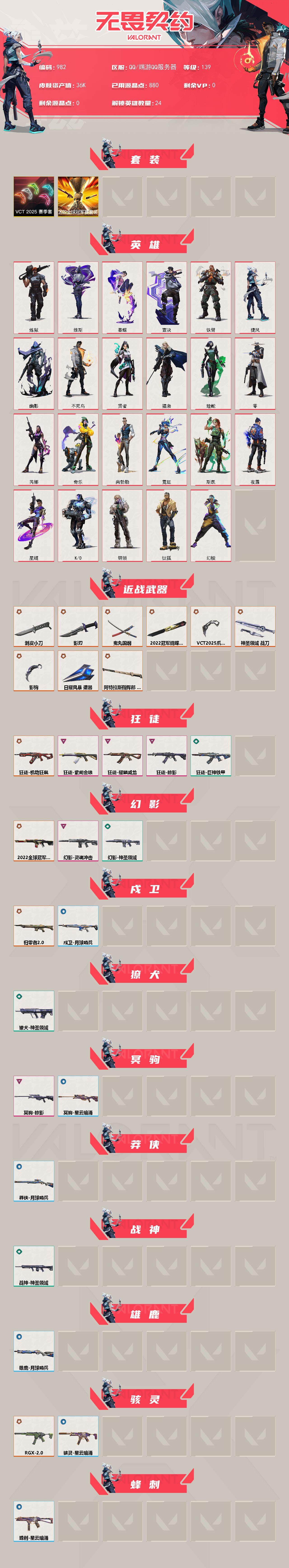 [14739538]【套装】:2022全球冠军赛套装,vct 2025 赛季套装 【英雄】:幻棱,炼狱,维斯,暮蝶,钛狐,壹决,铁臂,捷风,幽影,不死鸟,贤者,猎枭,蝰蛇,零,芮娜,奇乐,尚勃勒,霓虹,斯凯,夜露,星礈,k/o,钢锁 【近战 武器】:近战武器-2022全球冠军赛 蝴蝶刀,近战武器-影钩,近战武器-剥皮小刀,近战武器-vct 2025 爪刀,近战武器-鬼丸国纲,近战武器-影刃,近战武器-神圣领域 战刀,近战武器-日耀风暴 遗器,近战武器-阿特拉斯指挥部 甩棍 【狂徒】:狂徒-机动狂飙,狂徒-掠影,狂徒-耀鳞威龙,狂徒-紫阙金琅,狂徒-巨神铁甲 【幻影】:幻影-2022全球冠军赛,幻影-灵魂冲击,幻影-神圣领域 【戍卫】:戍卫-归零者//2.0,戍卫-月球哨兵 【獠犬】:獠犬-神圣领域 【冥驹】:冥驹-掠影,冥驹-星云暗涌 【莽侠】:莽侠-月球哨兵 【战神】:战神-神圣领域 【雄鹿】:雄鹿-月球哨兵 【骇灵】:骇灵-rgx 11z pro//2.0,骇灵-星云暗涌 【蜂刺】:蜂刺-星云暗涌 【正义】:正义-西部未来,正义-纳米打击,正义-月球哨兵 【鬼魅】:鬼魅-耀鳞威龙,鬼魅-诡秘蛇影,鬼魅-星云暗涌 【狂怒】:狂怒-神圣领域 【卡面】:终章:激斗汉堡 卡面,进入射程 卡面,《双城之战》拥抱 卡面,精灵大战 卡面,欢迎来到底城 卡面,南瓜盛典 卡面,无畏契约:暮蝶 卡面,正义的化身 卡面,最高舞台 卡面,红鳞松叶 卡面,clutch 卡面,梦幻奶茶 卡面,无畏契约go!第一卷:芮娜 卡面,无畏契约go!第一卷:零 卡面,无垠星环 卡面,《双城之战》金克丝 卡面,无畏契约go!第一卷:贤者 卡面,钢锁vs盖可 卡面,胡桃狂想 卡面,代号红色 卡面,新兵报到 卡面,v契约 卡面,无畏契约 卡面 【喷漆】:嗨宝南瓜灯 喷漆,嘭! 喷漆,都算到了 喷漆,控场勿近 喷漆,伤心心 喷漆,超级粉丝 喷漆,捷风差距 喷漆,审判之爪 喷漆,买装还是存钱 喷漆,关门放狗 喷漆,无畏契约go!第一卷:芮娜 喷漆,松叶 喷漆,胜利属于无畏契约 喷漆,glhf 喷漆,无畏契约 喷漆 【挂饰】:终章:猫猫木乃伊 挂饰,悠闲鸡块 挂饰,伞绳 挂饰,《双城之战》小蛋糕 挂饰,第九季//第三幕 纪念币 挂饰,无畏契约go!第一卷 芮娜 挂饰,无畏契约go!第一卷 零 挂饰,第九季//第二幕 纪念币 挂饰