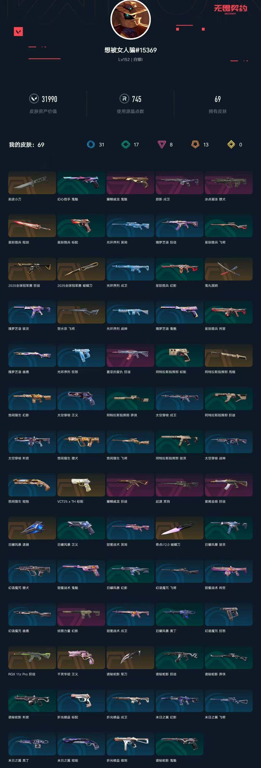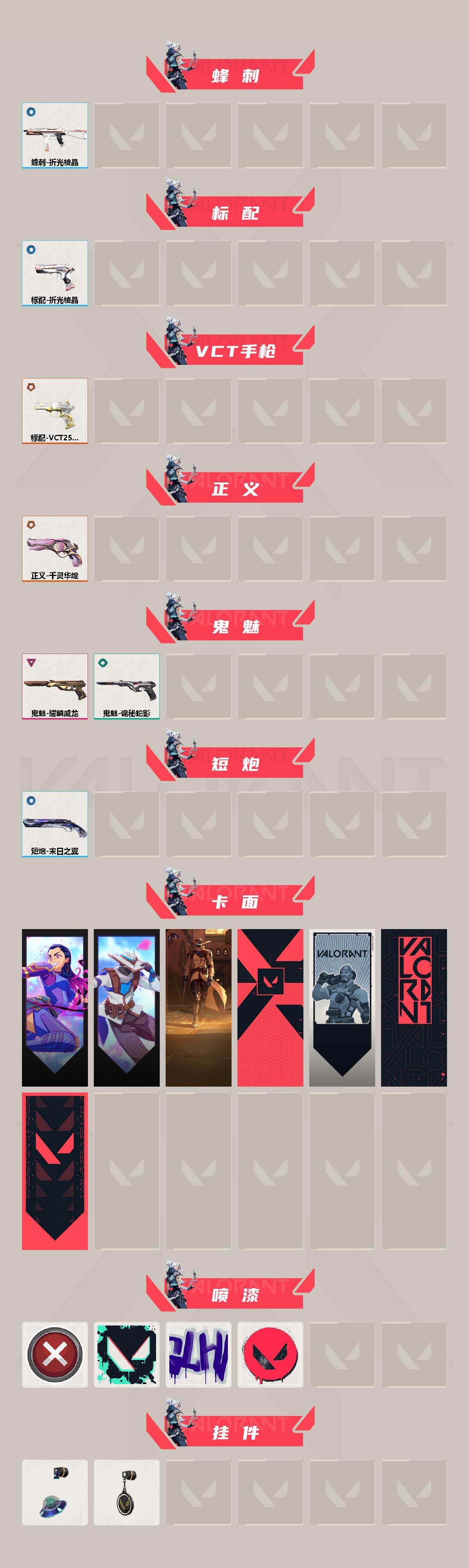 [14739840]【套装】:2025全球冠军赛套装 【英雄】:幻棱,炼狱,维斯,暮蝶,钛狐,壹决,铁臂,捷风,雷兹,幽影,不死鸟,贤者,猎枭,蝰蛇,零,芮娜,奇乐,尚勃勒,霓虹,斯凯,夜露,星礈,k/o,海神,盖可,黑梦,钢锁 【近战 武器】:近战武器-2025全球冠军赛 蝴蝶刀,近战武器-剥皮小刀,近战武器-奇点//2.0 蝴蝶刀,近战武器-鬼丸国纲,近战武器-诡秘蛇影 军刀,近战武器-日耀风暴 遗器,近战武器-阿特拉斯指挥部 甩棍,近战武器-星际猎兵 短剑 【狂徒】:狂徒-2025全球冠军赛,狂徒-rgx 11z pro,狂徒-盖亚的复仇,狂徒-耀鳞威龙,狂徒-紫阙金琅,狂徒-诡秘蛇影 【幻影】:幻影-侦察力量,幻影-末日之翼 【戍卫】:戍卫-掠影,戍卫-折光棱晶 【獠犬】:獠犬-冰点凝冻 【冥驹】:冥驹-起源 【飞将】:飞将-塑水宗,飞将-末日之翼 【莽侠】:莽侠-诡秘蛇影 【奥丁】:奥丁-末日之翼 【判官】:判官-诡秘蛇影 【蜂刺】:蜂刺-折光棱晶 【标配】:标配-折光棱晶 【vct手呛】:标配-vct25 x th 【正义】:正义-千灵华绽 【鬼魅】:鬼魅-耀鳞威龙,鬼魅-诡秘蛇影 【短炮】:短炮-末日之翼 【卡面】:无畏契约go!第一卷:芮娜 卡面,无畏契约go!第一卷:零 卡面,没有什么能逃过我的眼睛 卡面,代号红色 卡面,新兵报到 卡面,v契约 卡面,无畏契约 卡面 【喷漆】:买装还是存钱 喷漆,胜利属于无畏契约 喷漆,glhf 喷漆,无畏契约 喷漆 【挂饰】:天外飞客 挂饰,无畏契约 纪念币 挂饰