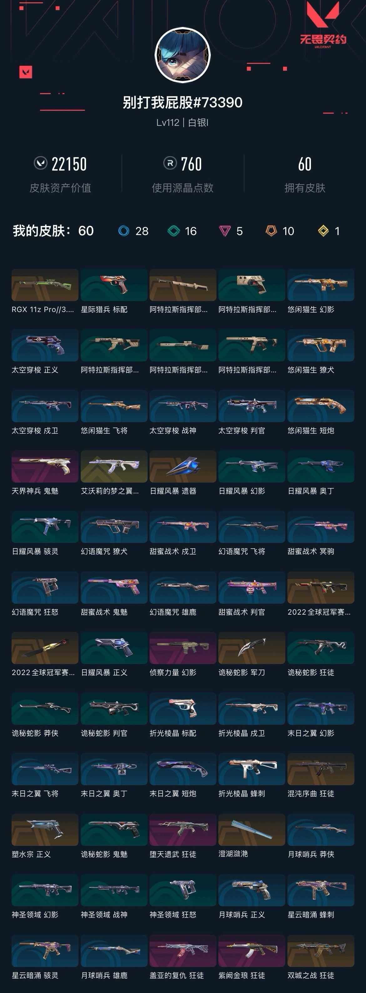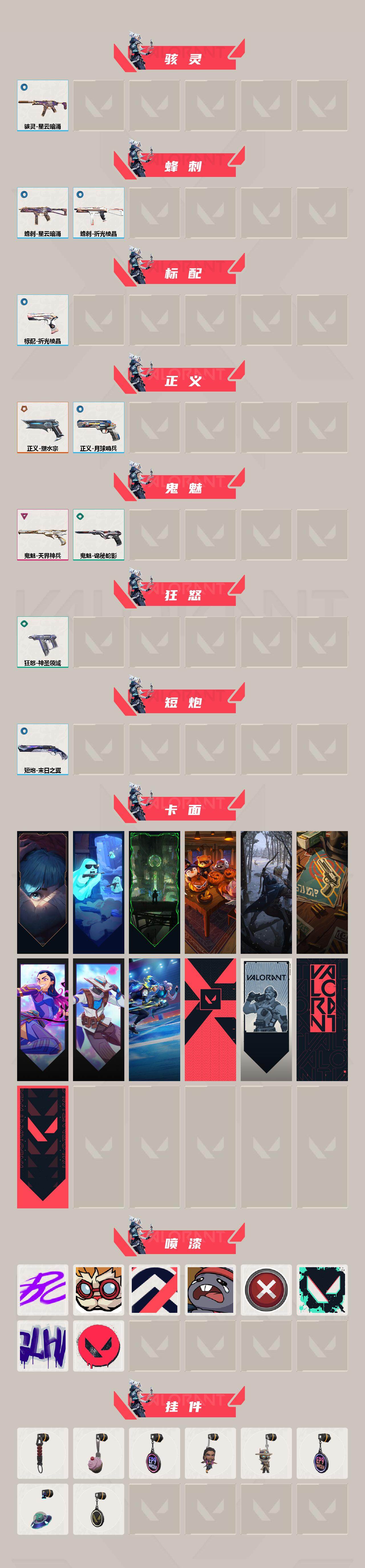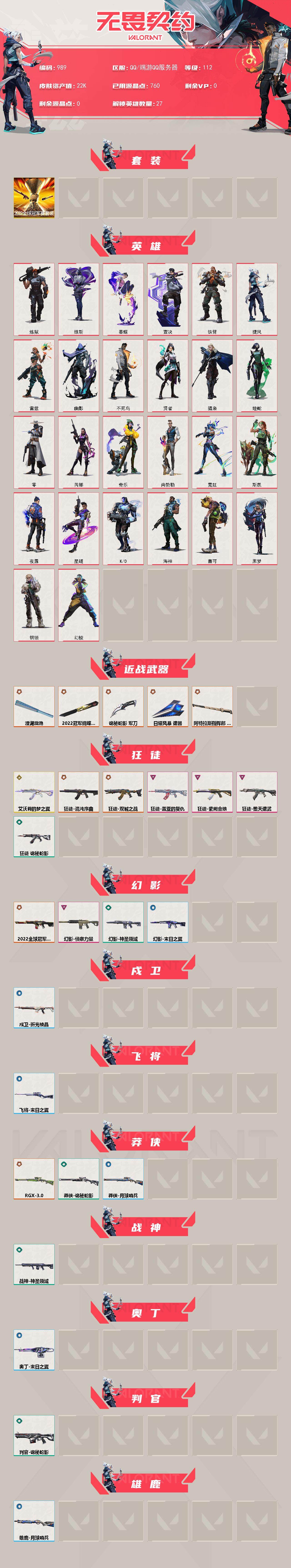 [14740011]【套装】:2022全球冠军赛套装 【英雄】:幻棱,炼狱,维斯,暮蝶,壹决,铁臂,捷风,雷兹,幽影,不死鸟,贤者,猎枭,蝰蛇,零,芮娜,奇乐,尚勃勒,霓虹,斯凯,夜露,星礈,k/o,海神,盖可,黑梦,钢锁 【近战 武器】:近战武器-2022全球冠军赛 蝴蝶刀,近战武器-澄湖潋滟,近战武器-诡秘蛇影 军刀,近战武器-日耀风暴 遗器,近战武器-阿特拉斯指挥部 甩棍 【狂徒】:狂徒-艾沃莉的梦之翼,狂徒-混沌序曲,狂徒-双城之战,狂徒-堕天遗武,狂徒-盖亚的复仇,狂徒-紫阙金琅,狂徒-诡秘蛇影 【幻影】:幻影-2022全球冠军赛,幻影-侦察力量,幻影-神圣领域,幻影-末日之翼 【戍卫】:戍卫-折光棱晶 【飞将】:飞将-末日之翼 【莽侠】:莽侠-rgx 11z pro//3.0,莽侠-诡秘蛇影,莽侠-月球哨兵 【战神】:战神-神圣领域 【奥丁】:奥丁-末日之翼 【判官】:判官-诡秘蛇影 【雄鹿】:雄鹿-月球哨兵 【骇灵】:骇灵-星云暗涌 【蜂刺】:蜂刺-星云暗涌,蜂刺-折光棱晶 【标配】:标配-折光棱晶 【正义】:正义-塑水宗,正义-月球哨兵 【鬼魅】:鬼魅-天界神兵,鬼魅-诡秘蛇影 【狂怒】:狂怒-神圣领域 【短炮】:短炮-末日之翼 【卡面】:《双城之战》拥抱 卡面,精灵大战 卡面,欢迎来到底城 卡面,南瓜盛典 卡面,钢弓与箭弦 卡面,正义的化身 卡面,无畏契约go!第一卷:芮娜 卡面,无畏契约go!第一卷:零 卡面,比比看谁快? 卡面,代号红色 卡面,新兵报到 卡面,v契约 卡面,无畏契约 卡面 【喷漆】:嘭! 喷漆,都算到了 喷漆,控场勿近 喷漆,熊抱 喷漆,买装还是存钱 喷漆,胜利属于无畏契约 喷漆,glhf 喷漆,无畏契约 喷漆 【挂饰】:伞绳 挂饰,《双城之战》小蛋糕 挂饰,第九季//第三幕 纪念币 挂饰,无畏契约go!第一卷 芮娜 挂饰,无畏契约go!第一卷 零 挂饰,第九季//第二幕 纪念币 挂饰,天外飞客 挂饰,无畏契约 纪念币 挂饰