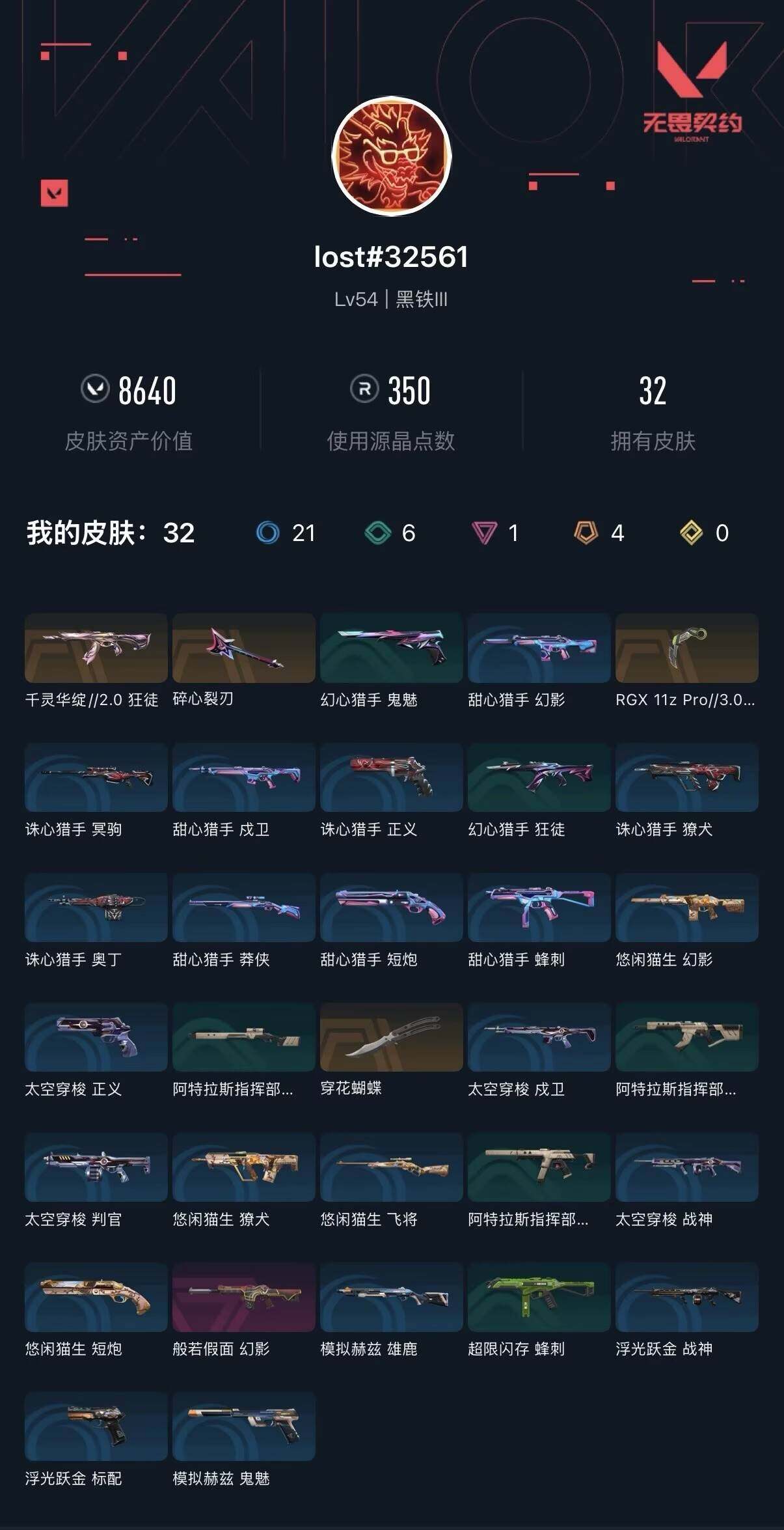 【wwqh57】终极4/卓越1/皮肤32/等级54/段位:黑铁/幻棱/炼狱/维斯/暮蝶/捷风/幽影/不死鸟/贤者/猎枭/零/尚勃勒/霓虹/斯凯/夜露/星礈/盖可/黑梦/钢锁/穿花蝴蝶/rgx-11z-pro//3.0-爪刀/狂徒-千灵华绽//2.0/般若假面-幻影/战神-浮光跃金/雄鹿-模拟赫兹/蜂刺-超限闪存/标配-浮光跃金/鬼魅-模拟赫兹/模拟赫兹 卡面/浮光跃金 卡面/超限闪存