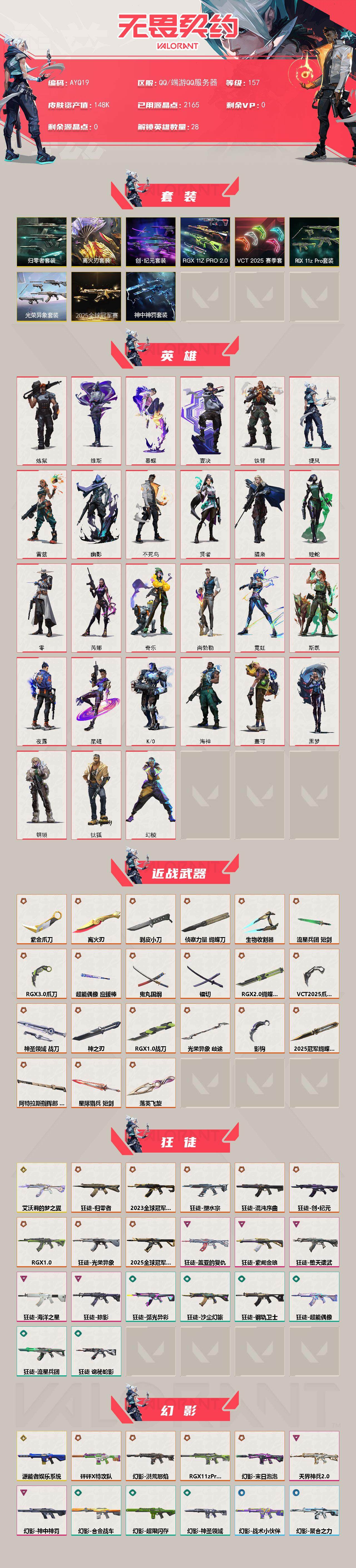 [14740328]【店主推荐捡漏号!可直接换绑】【套装】:2025全球冠军赛套装,光荣异象套装,rgx 11z pro套装,vct 2025 赛季套装,rgx 11z pro//2.0套装,创·纪元套装,离火刃套装,归零者套装,神中神罚套装,离火刃套装 【英雄】:幻棱,炼狱,维斯,暮蝶,钛狐,壹决,铁臂,捷风,雷兹,幽影,不死鸟,贤者,猎枭,蝰蛇,零,芮娜,奇乐,尚勃勒,霓虹,斯凯,夜露,星礈,k/o,海神,盖可,黑梦,钢锁 【近战 武器】:近战武器-2025全球冠军赛 蝴蝶刀,近战武器-影钩,近战武器-光荣异象 歧途,近战武器-rgx 11z pro 战刀,近战武器-神之刃,近战武器-rgx 11z pro//2.0 蝴蝶刀,近战武器-侦察力量 蝴蝶刀,近战武器-剥皮小刀,近战武器-vct 2025 爪刀,近战武器-紫金爪刀,近战武器-rgx 11z pro//3.0 爪刀,近战武器-离火刃,近战武器-落英飞旋,近战武器-镭切,近战武器-鬼丸国纲,近战武器-流星兵团 短剑,近战武器-超能偶像 应援棒,近战武器-生物收割器,近战武器-神圣领域 战刀,近战武器-阿特拉斯指挥部 甩棍,近战武器-星际猎兵 短剑 【狂徒】:狂徒-艾沃莉的梦之翼,狂徒-2025全球冠军赛,狂徒-2023全球冠军赛,狂徒-归零者,狂徒-混沌序曲,狂徒-塑水宗,狂徒-创·纪元,狂徒-rgx 11z pro,狂徒-光荣异象,狂徒-堕天遗武,狂徒-掠影,狂徒-盖亚的复仇,狂徒-海洋之星,狂徒-紫阙金琅,狂徒-超能偶像,狂徒-钢轨卫士,狂徒-弧光异彩,狂徒-流星兵团,狂徒-沙尘幻旅,狂徒-诡秘蛇影 【幻影】:幻影-源能者娱乐系统,幻影-洪荒怒焰,幻影-砰砰x特攻队,幻影-rgx 11z pro//2.0,幻影-末日泡泡,幻影-天界神兵//2.0,幻影-神中神罚,幻影-超限闪存,幻影-合金战车,幻影-神圣领域,幻影-聚合之力,幻影-战术小伙伴 【戍卫】:戍卫-破败军械,戍卫-rgx 11z pro,戍卫-天界神兵,戍卫-超能偶像,戍卫-钢轨卫士,戍卫-彩梦之城,戍卫-浮光跃金,戍卫-花漾粉红,戍卫-萌彩剪影,戍卫-战术熊与伙伴们,戍卫-月球哨兵,戍卫-折光棱晶 【獠犬】:獠犬-归零者,獠犬-弧光异彩,獠犬-神圣领域,獠犬-采蜜小蜂队,獠犬-胡桃狂想,獠犬-模拟赫兹,獠犬-数码咒术,獠犬-战术小伙伴 【冥驹】:冥驹-归零