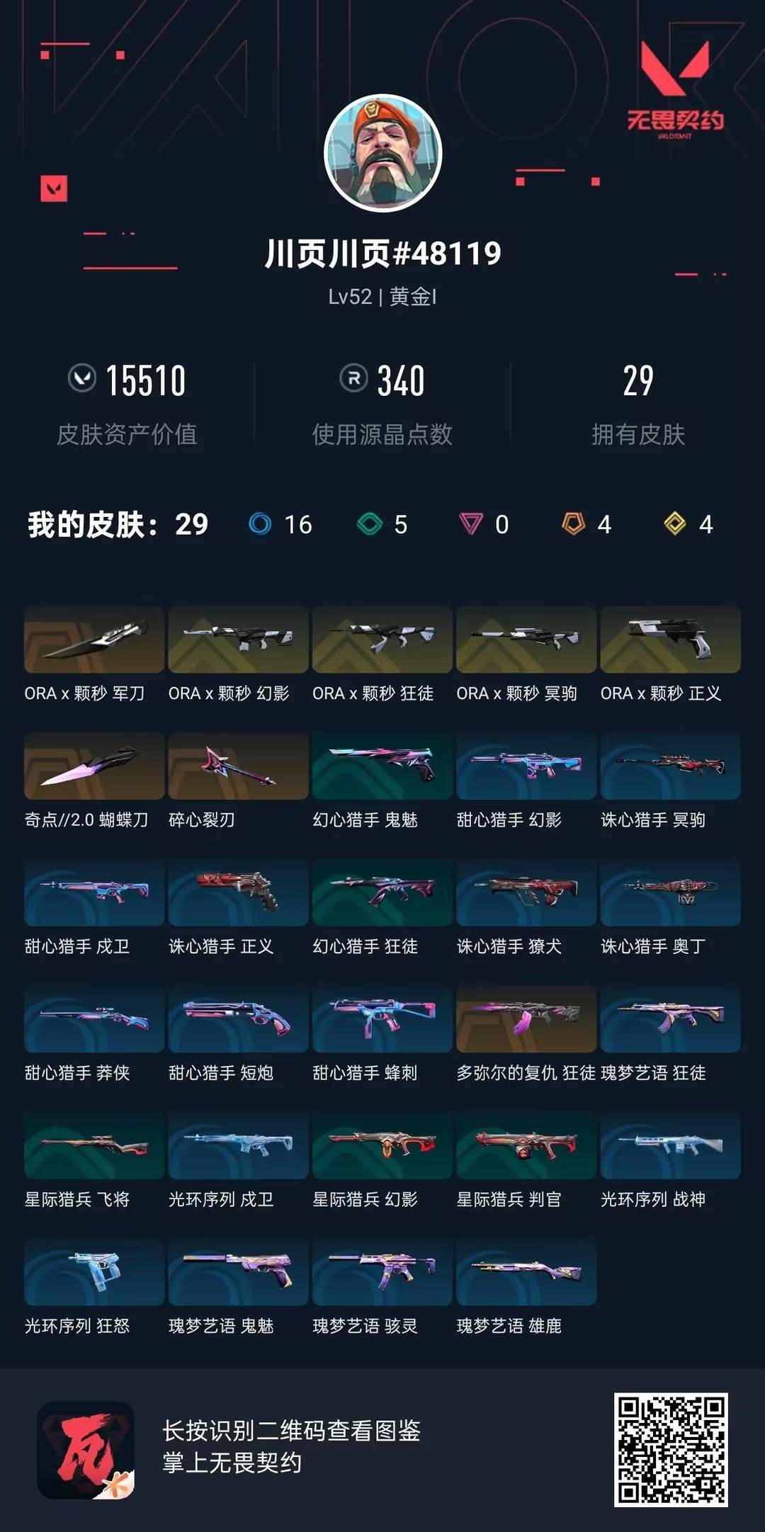 4橙皮 4金皮 29皮肤 8英雄 32卡面 340已用源晶 黄金段位 【套装】:ax颗秒 【近战武器皮肤】:蝴蝶刀-奇点//2.0碎心裂刃ax颗秒 军刀 【佩呛皮肤】:正义-ax颗秒 【步呛皮肤】:狂徒-ax颗秒幻影-ax颗秒多弥尔的复仇 狂徒 【狙击呛皮肤】:冥驹-o