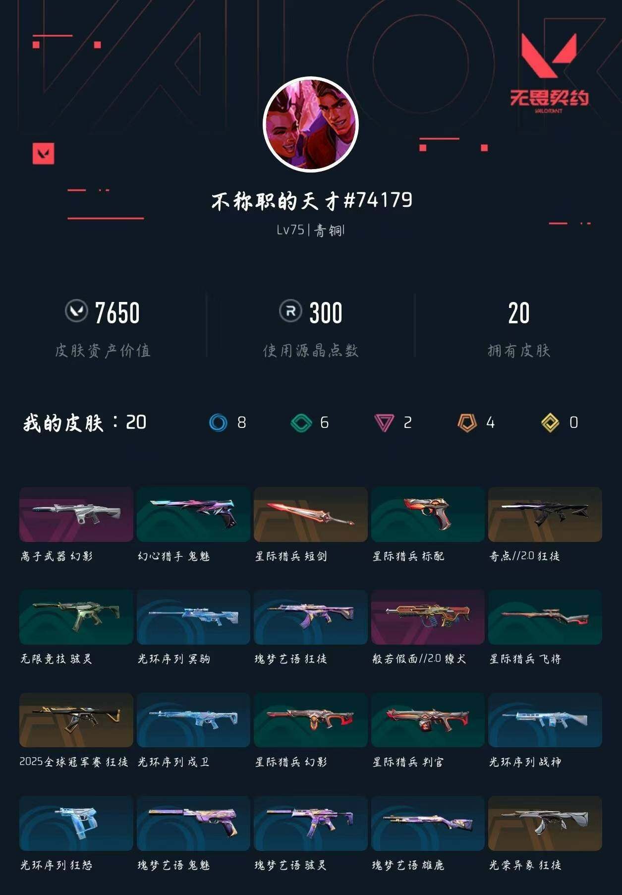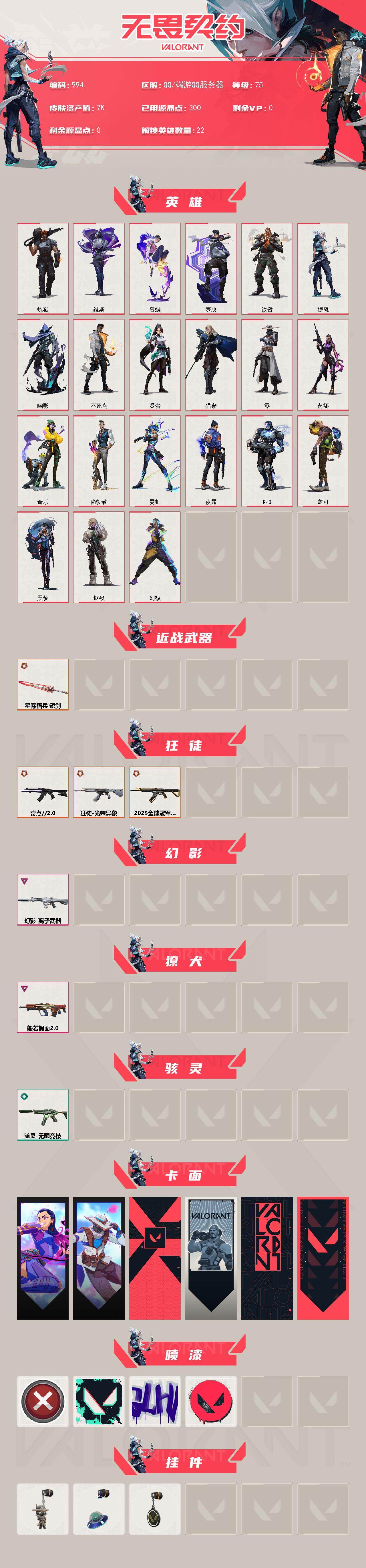 [14746415]【英雄】:幻棱,炼狱,维斯,暮蝶,壹决,铁臂,捷风,幽影,不死鸟,贤者,猎枭,零,芮娜,奇乐,尚勃勒,霓虹,夜露,k/o,盖可,黑梦,钢锁 【近战 武器】:近战武器-星际猎兵 短剑 【狂徒】:狂徒-2025全球冠军赛,狂徒-奇点//2.0,狂徒-光荣异象 【幻影】:幻影-离子武器 【獠犬】:獠犬-般若假面//2.0 【骇灵】:骇灵-无限竞技 【卡面】:无畏契约go!第一卷:芮娜 卡面,无畏契约go!第一卷:零 卡面,代号红色 卡面,新兵报到 卡面,v契约 卡面,无畏契约 卡面 【喷漆】:买装还是存钱 喷漆,胜利属于无畏契约 喷漆,glhf 喷漆,无畏契约 喷漆 【挂饰】:无畏契约go!第一卷 零 挂饰,天外飞客 挂饰,无畏契约 纪念币 挂饰