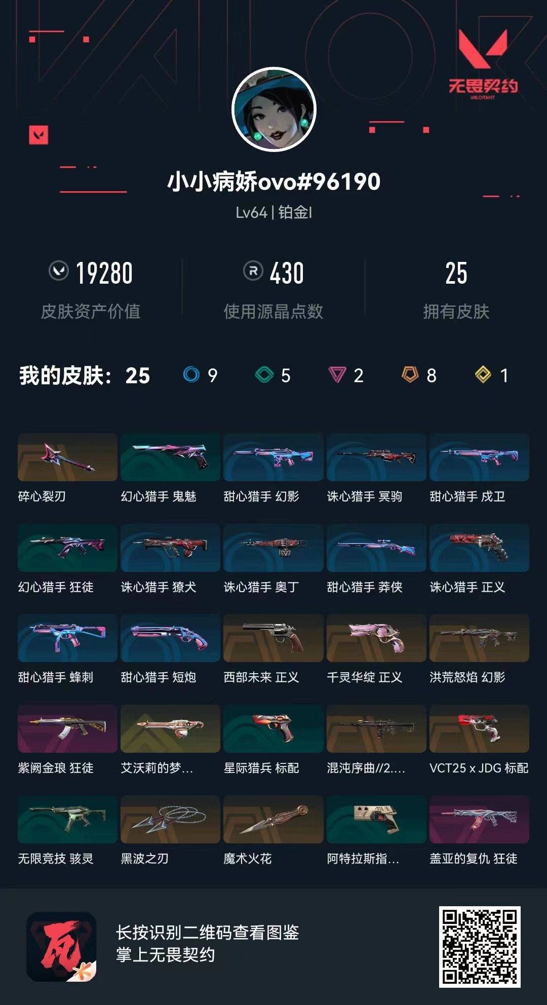 [14746737]8橙皮 1金皮 2紫皮 25皮肤 19英雄 47卡面 430已用源晶 铂金段位 【近战武器皮肤】:碎心裂刃魔术火花黑波之刃 【佩呛皮肤】:标配-vct25xjdg正义-西部未来正义-千灵华绽 【步呛皮肤】:幻影-混沌序曲2.0狂徒-紫阙金琅狂徒-盖亚的复仇幻影-洪荒怒焰 【机呛皮肤】:奥丁-艾沃莉的梦之翼 【挂饰】:双城之战魄罗挂饰vctxjdg挂饰
