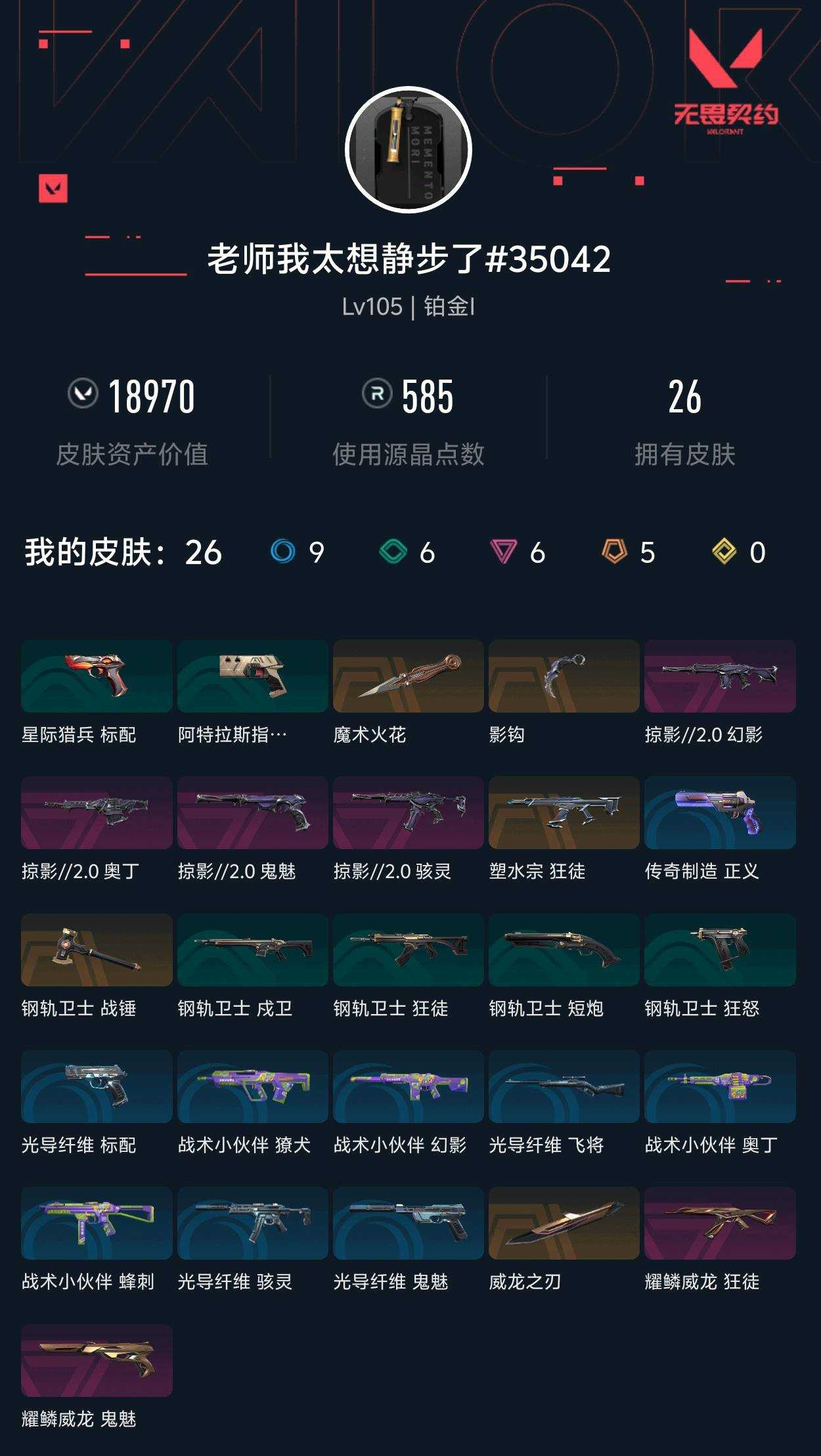 【无畏契约】【yhwww7330】等级:105,已用无畏点18970,已用源晶点585,橙皮:近战-钢轨卫士 战锤|近战-威龙之刃|狂徒-塑水宗|近战-魔术火花|近战-影钩__紫皮:鬼魅-耀鳞威龙|狂徒-耀鳞威龙|骇灵-掠影2.0|奥丁-掠影2.0|鬼魅-掠影2.0|幻影-掠影2.0__绿皮:短炮-钢轨卫士|狂怒-钢轨卫士|狂徒-钢轨卫士|戍卫-钢轨卫士|标配-星际猎兵__蓝皮:鬼魅-光导纤维|飞将-光导纤维|标配-光导纤维|骇灵-光导纤维|正义-传奇制造|蜂刺-战术小伙伴|幻影-战术小伙伴|獠犬-战术小伙伴|奥丁-战术小伙伴|标配-阿特拉斯指挥部__段位:铂金__英雄:尚勃勒|维斯|黑梦|暮蝶|盖可|壹决|夜露|炼狱|贤者|猎枭|芮娜|捷风|蝰蛇|不死鸟|幻棱|禁灭无畏点18970/魔术火花/掠影2.0套装/塑水ak/威龙套装