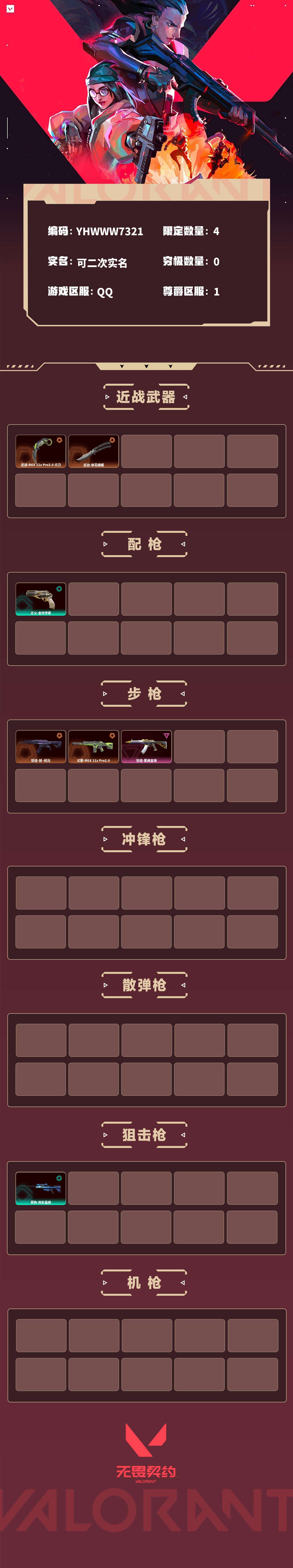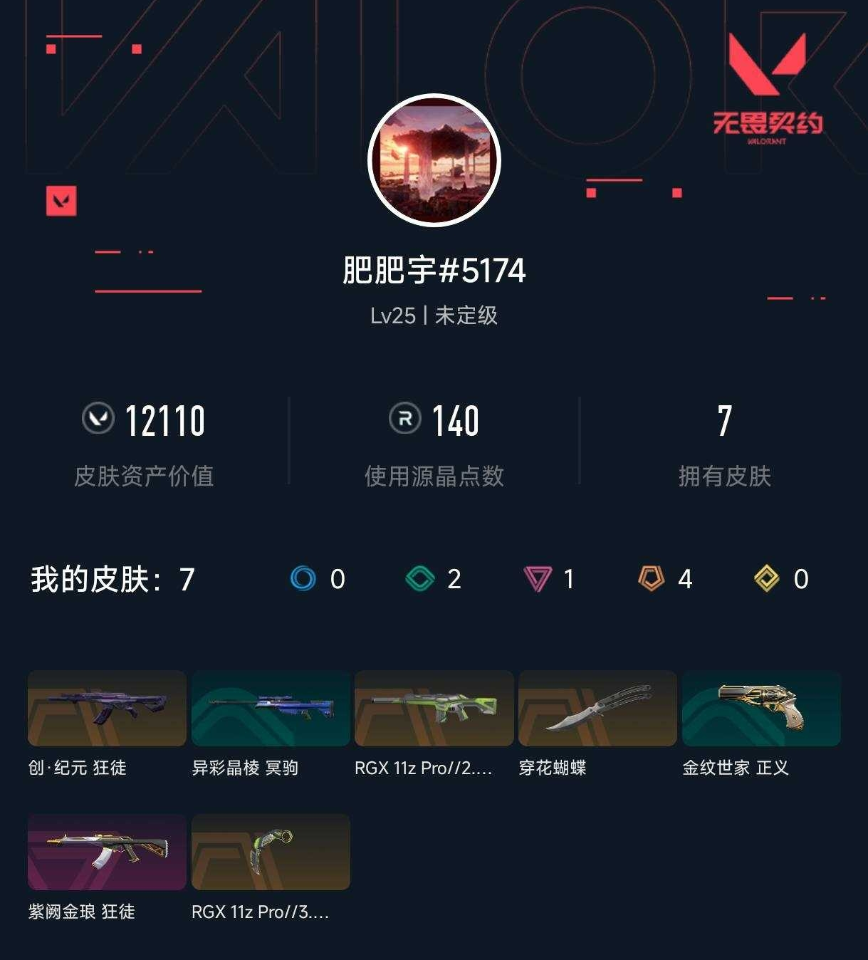 【无畏契约】【yhwww7321】等级:25,已用无畏点12110,已用源晶点140,橙皮:近战-rgx 11z pro3.0 爪刀|近战-穿花蝴蝶|狂徒-创·纪元|幻影-rgx 11z pro2.0__紫皮:狂徒-紫阙金琅__段位:未定级__绿皮:正义-金纹世家|冥驹-异彩晶棱__英雄:尚勃勒|盖可|霓虹|炼狱|贤者|猎枭|钛狐|芮娜|捷风|不死鸟无畏点12110/纪元ak/显卡m4/穿花蝴蝶/紫金ak/显卡爪刀