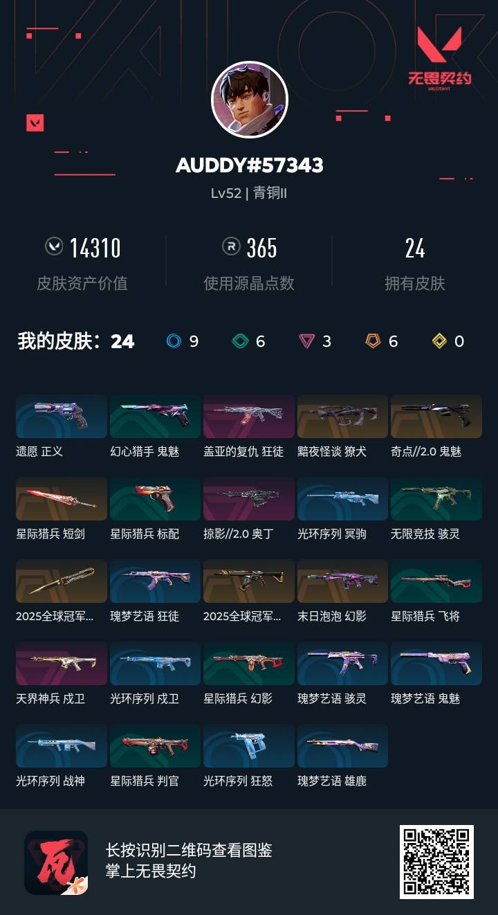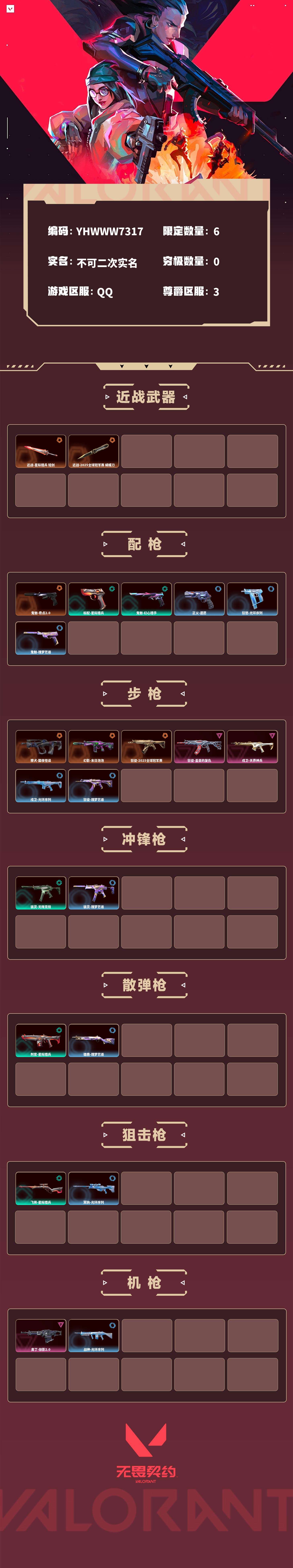 【无畏契约】【yhwww7317】等级:52,已用无畏点14310,已用源晶点365,橙皮:獠犬-黯夜怪谈|鬼魅-奇点2.0|近战-星际猎兵 短剑|幻影-末日泡泡|狂徒-2025全球冠军赛|近战-2025全球冠军赛 蝴蝶刀__紫皮:狂徒-盖亚的复仇|戍卫-天界神兵|奥丁-掠影2.0__段位:青铜__绿皮:骇灵-无限竞技|判官-星际猎兵|飞将-星际猎兵|标配-星际猎兵|鬼魅-幻心猎手__蓝皮:正义-遗愿|狂怒-光环序列|戍卫-光环序列|冥驹-光环序列|战神-光环序列|狂徒-瑰梦艺语|鬼魅-瑰梦艺语|骇灵-瑰梦艺语|雄鹿-瑰梦艺语__英雄:斯凯|暮蝶|k/o|夜露|海神|炼狱|贤者|猎枭|钛狐|芮娜|捷风|不死鸟库存14310/盖亚狂徒/25冠军套/天界戍卫