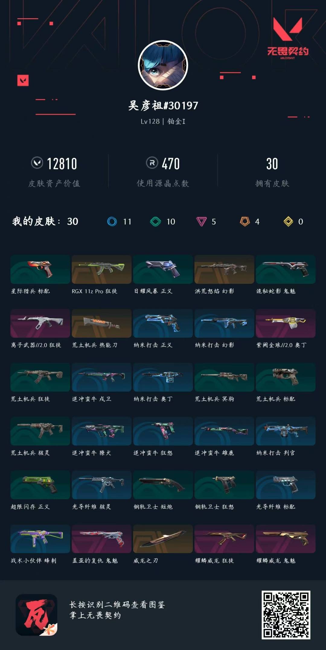 4橙皮 5紫皮 30皮肤 28英雄 78卡面 470已用源晶 铂金段位 【套装】:耀鳞威龙套装 【近战武器皮肤】:荒土机兵热能刀威龙之刃 【佩呛皮肤】:鬼魅-盖亚的复仇鬼魅-耀鳞威龙 【步呛皮肤】:狂徒-离子武器2.0狂徒-rgx 11z pro狂徒-耀鳞威龙幻影-洪荒怒焰 【机呛皮肤】