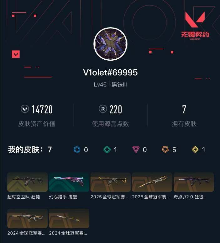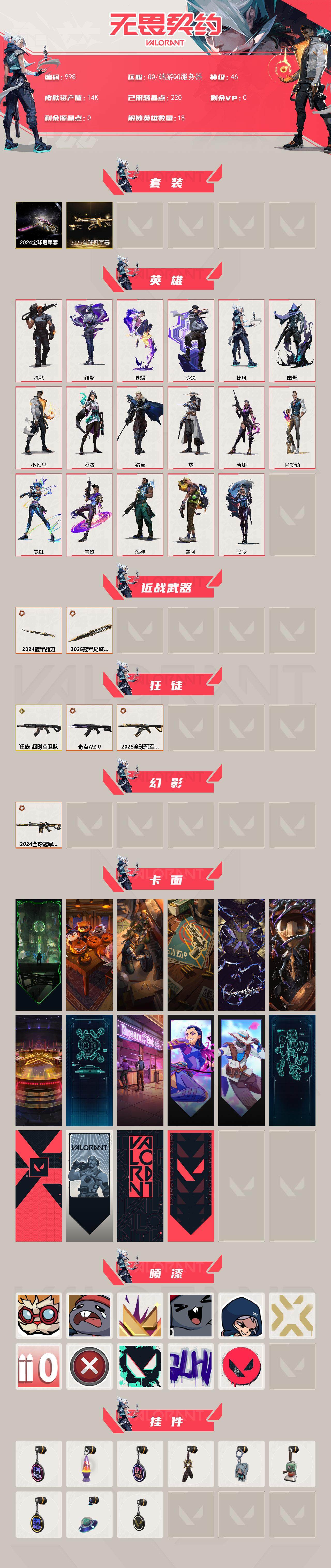 [14747880]【套装】:2025全球冠军赛套装,2024全球冠军赛套装 【英雄】:炼狱,维斯,暮蝶,壹决,捷风,幽影,不死鸟,贤者,猎枭,零,芮娜,尚勃勒,霓虹,星礈,海神,盖可,黑梦 【近战 武器】:近战武器-2025全球冠军赛 蝴蝶刀,近战武器-2024全球冠军赛 战刀 【狂徒】:狂徒-超时空卫队,狂徒-2025全球冠军赛,狂徒-奇点//2.0 【幻影】:幻影-2024全球冠军赛 【卡面】:欢迎来到底城 卡面,南瓜盛典 卡面,修车达人 卡面,正义的化身 卡面,2024全球冠军赛 卡面,时间到 卡面,最高舞台 卡面,声感陷阱设计图 卡面,梦幻奶茶 卡面,无畏契约go!第一卷:芮娜 卡面,无畏契约go!第一卷:零 卡面,铁臂设计图 卡面,代号红色 卡面,新兵报到 卡面,v契约 卡面,无畏契约 卡面 【喷漆】:都算到了 喷漆,熊抱 喷漆,2024全球冠军赛 喷漆,超级粉丝 喷漆,捷风差距 喷漆,2021冠军巡回赛花火 喷漆,拼一呛 喷漆,买装还是存钱 喷漆,胜利属于无畏契约 喷漆,glhf 喷漆,无畏契约 喷漆 【挂饰】:第九季//第三幕 纪念币 挂饰,熔岩灯 挂饰,第九季//第二幕 纪念币 挂饰,2024全球冠军赛 挂饰,袖珍捷风 挂饰,迷你浓缩 挂饰,第九季//第一幕 纪念币 挂饰,天外飞客 挂饰,无畏契约 纪念币 挂饰
