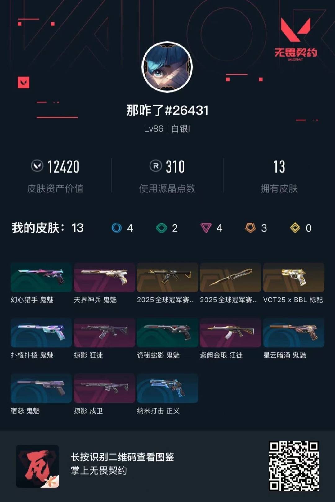 3橙皮 4紫皮 13皮肤 16英雄 51卡面 310已用源晶 白银段位 【套装】:2025全球冠军赛 【近战武器皮肤】:2025全球冠军赛 蝴蝶刀 【佩呛皮肤】:标配-vct25xbbl鬼魅-天界神兵 【步呛皮肤】:戍卫-掠影狂徒-掠影2025全球冠军赛 狂徒狂徒-紫阙金琅 【挂饰】:神中