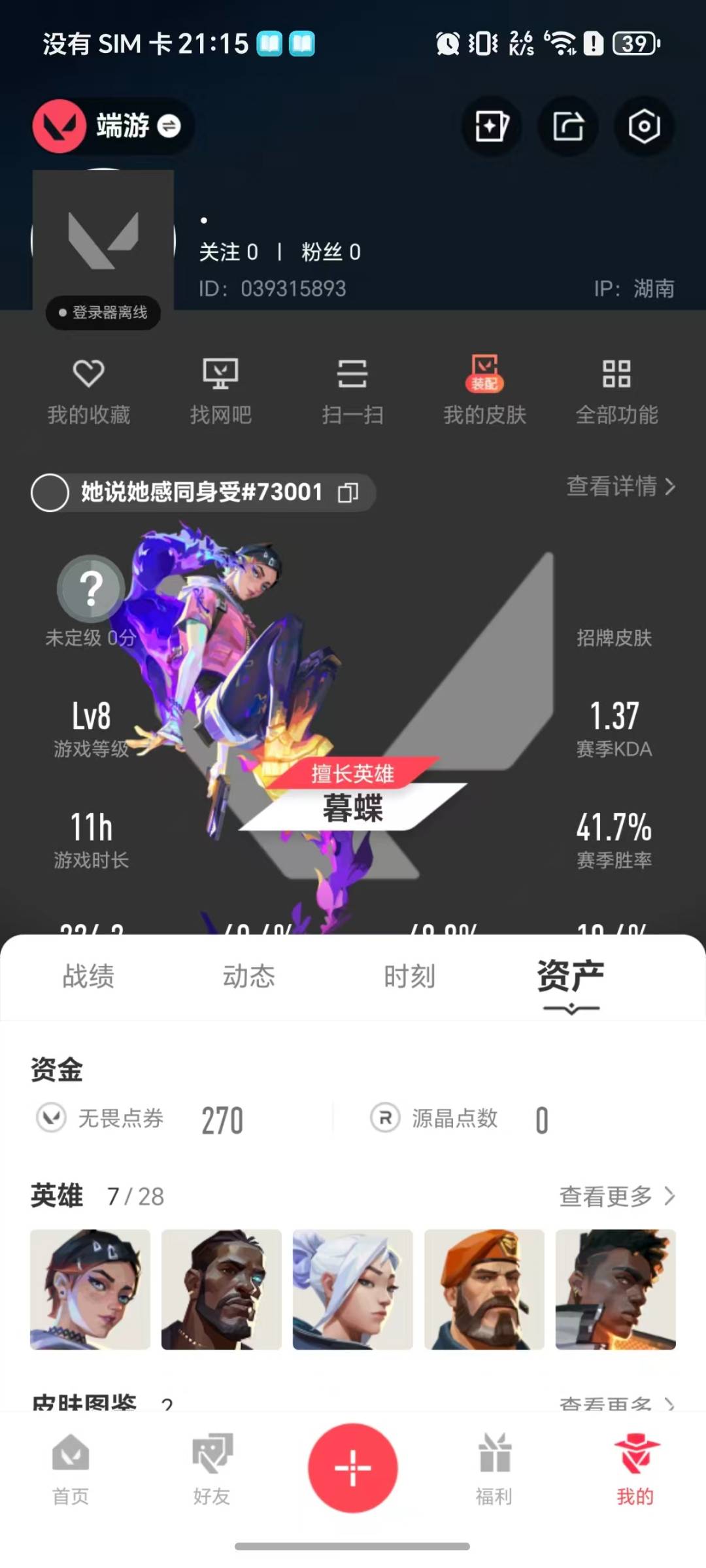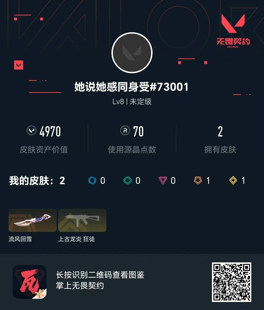 1橙皮 1金皮 2皮肤 7英雄 7卡面 70已用源晶 未定级段位 【近战武器皮肤】:流风回雪 【步呛皮肤】:狂徒-上古龙炎