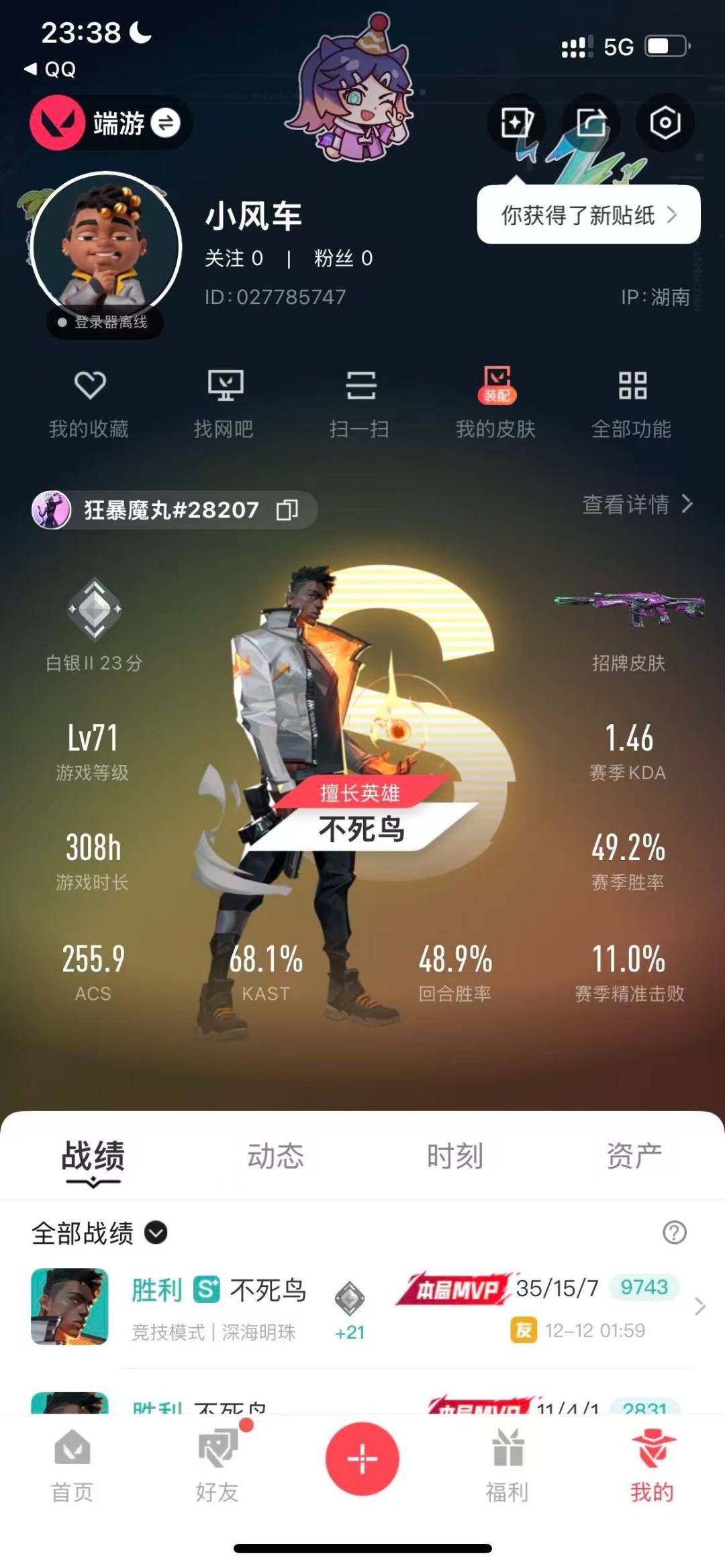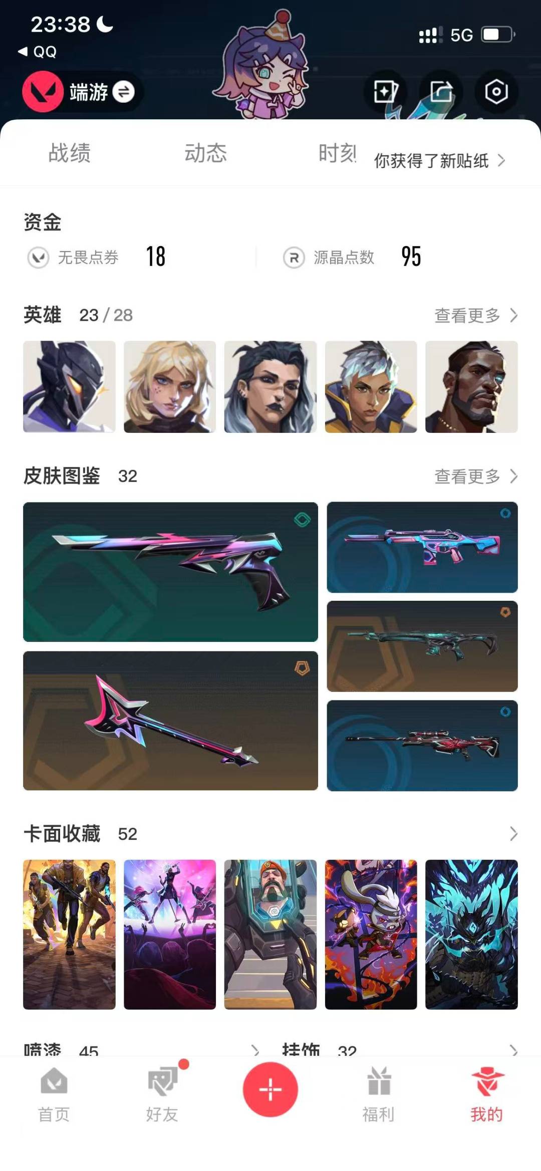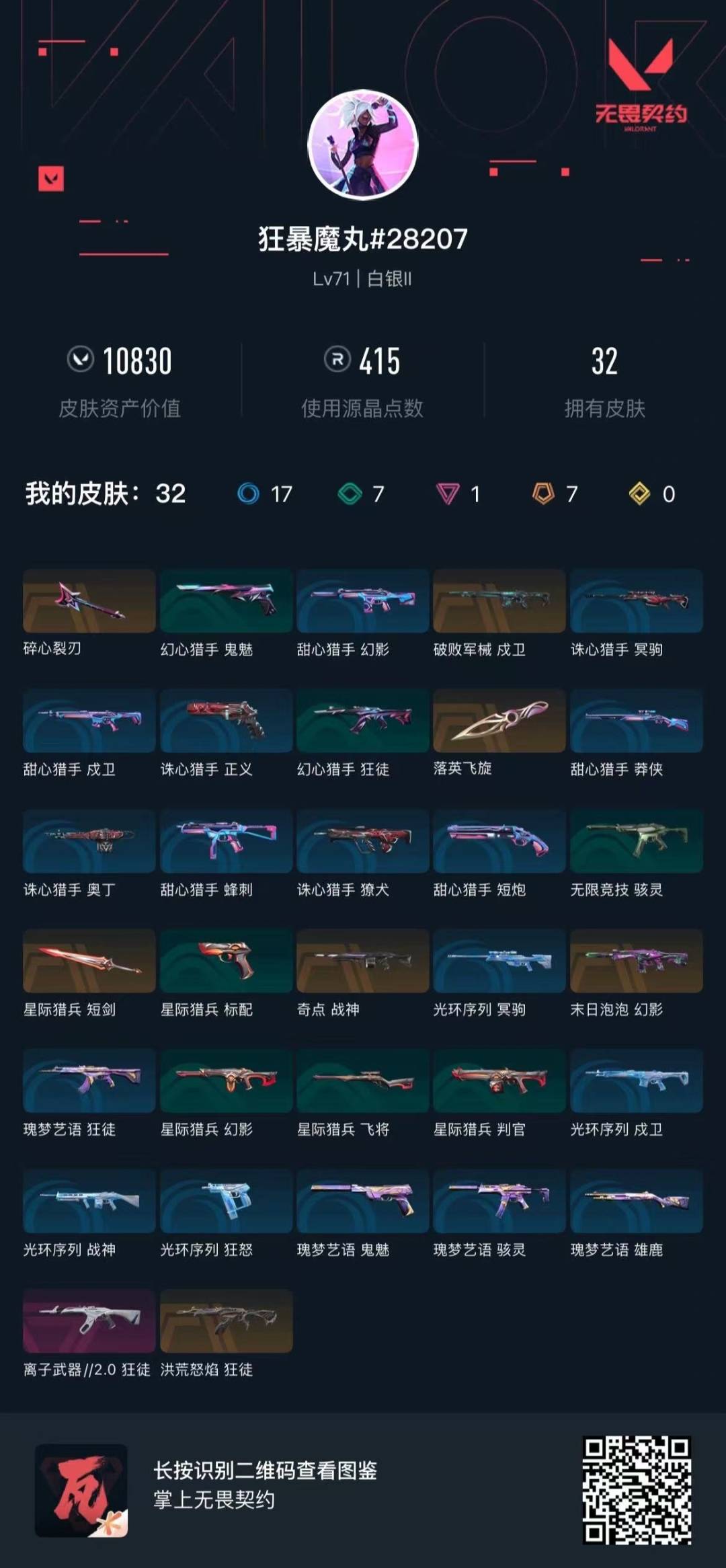 7橙皮 1紫皮 32皮肤 23英雄 52卡面 415已用源晶 白银段位 【近战武器皮肤】碎心裂刃落英飞旋星际猎兵 短剑 【步呛皮肤】戍卫-破败军械狂徒-离子武器2.0狂徒-洪荒怒焰幻影-末日泡泡 【机呛皮肤】战神-奇点 【挂饰】薰衣草之心挂饰