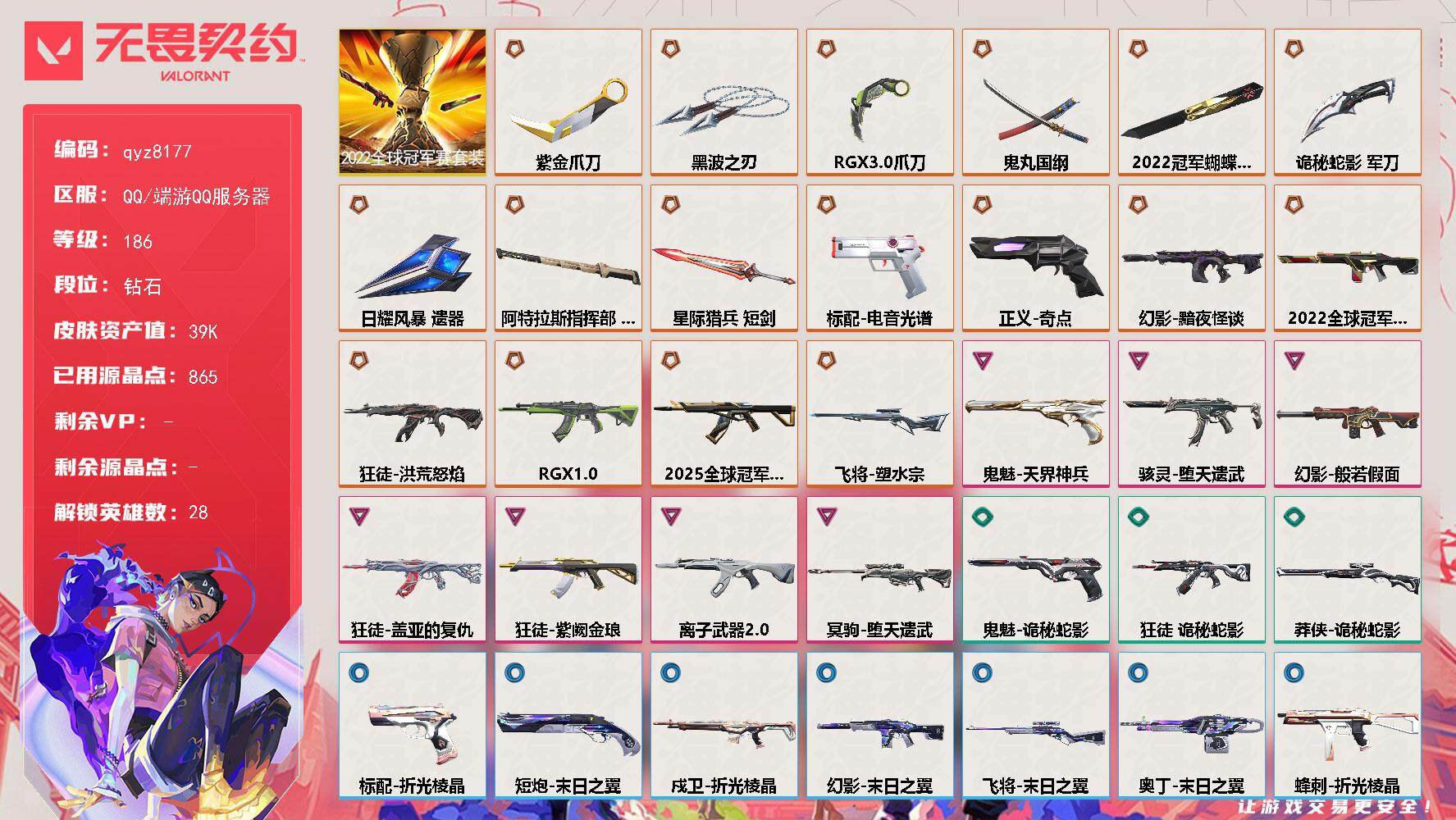 【qyz8177】25狂徒22套-爪刀-鬼丸国纲-rgx爪刀-黑波之刃-qyz8177-亮点皮肤:-幻影-2022全球冠军赛蝴蝶刀-2022全球冠军赛-套装:-2022全球冠军赛-近战武器皮肤:-紫金爪刀黑波之刃爪刀-rgx-11z-pro-30鬼丸国纲诡秘蛇影-步呛皮肤:-狂徒-紫阙金琅狂徒-盖亚的复仇狂徒-洪荒怒焰幻影-般若假面幻影-黯夜怪谈狂徒-离子武器20狂徒-rgx-11z-pro2025全球冠军赛-狂徒-佩呛皮肤:-正义-奇点鬼魅-天界神兵标配-电音光谱-狙击呛皮肤:-飞将-塑水宗冥驹-堕天遗武-冲锋呛皮肤:-骇灵-堕天遗武-亮点:-【qyz8177】【套装】:2022全球冠军赛套装【英雄】:幻棱,炼狱,维斯,暮蝶,钛狐,壹决,铁臂,捷风,雷兹,幽影,不死鸟,贤者,猎枭,蝰蛇,零,芮娜,奇乐,尚勃勒,霓虹,斯凯,夜露,星礈,k/o,海神,盖可,黑梦,钢锁【近战-武器】:近战武器-2022全球冠军赛-蝴蝶刀,近战武器-紫金爪刀,近战武器-rgx-11z-pro//30-爪刀,近战武器-黑波之刃,近战武器-鬼丸国纲,近战武器-诡秘蛇影-军刀,近战武器-日耀风暴-遗器,近战武器-阿特拉斯指挥部-甩棍,近战武器-星际猎兵-短剑【狂徒】:狂徒-2025全球冠军赛,狂徒-洪荒怒焰,狂徒-rgx-11z-pro,狂徒-盖亚的复仇,狂徒-紫阙金琅,狂徒-离子武器//20,狂徒-诡秘蛇影【幻影】:幻影-2022全球冠军赛,幻影-黯夜怪谈,幻影-般若假面,幻影-末日之翼【戍卫】:戍卫-折光棱晶【冥驹】:冥驹-堕天遗武【飞将】:飞将-塑水宗,飞将-末日之翼【莽侠】:莽侠-诡秘蛇影【奥丁】:奥丁-末日之翼【判官】:判官-诡秘蛇影【骇灵】:骇灵-堕天遗武【蜂刺】:蜂刺-折光棱晶【标配】:标配-电音光谱,标配-折光棱晶,标配-电音光谱【正义】:正义-奇点【鬼魅】:鬼魅-天界神兵,鬼魅-诡秘蛇影【短炮】:短炮-末日之翼【卡面】:打造专属狂徒-卡面,无畏契约go!第一卷:芮娜-卡面,无畏契约go!第一卷:零-卡面,《双城之战》金克丝-卡面,代号红色-卡面,新兵报到-卡面,v契约-卡面,无畏契约-卡面【喷漆】:买装还是存钱-喷漆,酷熊冲浪-喷漆,暴走萝莉-喷漆,请你冷静点-喷漆-,放手一搏-喷漆,胜利属于无畏契约-喷漆,glhf-喷漆,无畏契约-喷