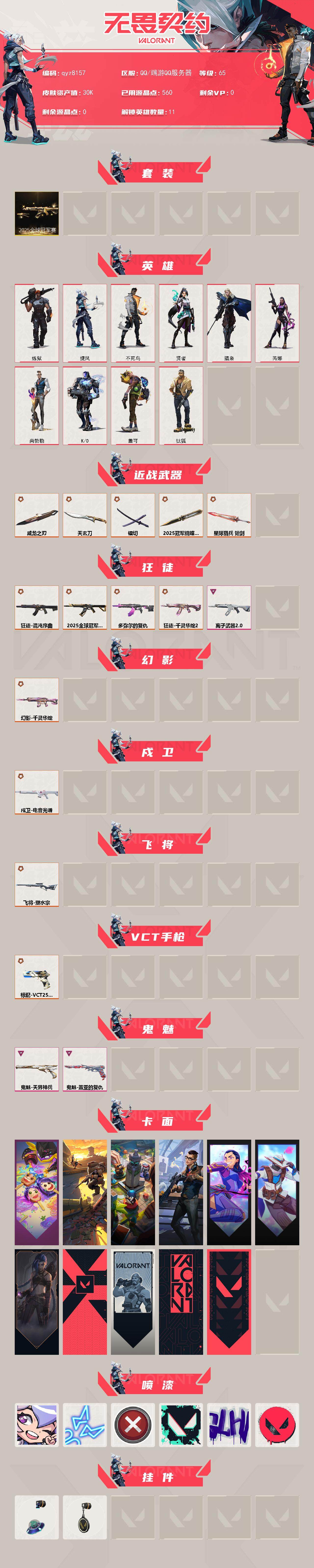 25冠军套威龙之刃-莲华狂徒幻影-雷切天玄刃-qyz8157-套装:-2025全球冠军赛-近战武器皮肤:-天玄刀威龙之刃镭切2025全球冠军赛-蝴蝶刀-步呛皮肤:-幻影-千灵华绽狂徒-混沌序曲狂徒-离子武器20戍卫-电音光谱2025全球冠军赛-狂徒狂徒-千灵华绽//20-佩呛皮肤:-鬼魅-盖亚的复仇鬼魅-天界神兵标配-vct25x100t-狙击呛皮肤:-飞将-塑水宗-亮点:-【qyz8157】【套装】:2025全球冠军赛套装【英雄】:炼狱,钛狐,捷风,不死鸟,贤者,猎枭,芮娜,尚勃勒,k/o,盖可【近战-武器】:近战武器-2025全球冠军赛-蝴蝶刀,近战武器-镭切,近战武器-威龙之刃,近战武器-天玄刀,近战武器-星际猎兵-短剑【狂徒】:狂徒-2025全球冠军赛,狂徒-混沌序曲,狂徒-多弥尔的复仇,狂徒-千灵华绽//20,狂徒-离子武器//20【幻影】:幻影-千灵华绽【戍卫】:戍卫-电音光谱,戍卫-电音光谱【飞将】:飞将-塑水宗【vct手呛】:标配-vct25-x-100t【鬼魅】:鬼魅-盖亚的复仇,鬼魅-天界神兵【卡面】:瓦娃脸雪糕-p2-卡面,荒土机兵-卡面,战术桌游-卡面,西装暴徒-卡面,无畏契约go!第一卷:芮娜-卡面,无畏契约go!第一卷:零-卡面,《双城之战》金克丝-卡面,代号红色-卡面,新兵报到-卡面,v契约-卡面,无畏契约-卡面【喷漆】:超能偶像-喷漆,霓光四射-喷漆,买装还是存钱-喷漆,胜利属于无畏契约-喷漆,glhf-喷漆,无畏契约-喷漆【挂饰】:天外飞客-挂饰,无畏契约-纪念币-挂饰
