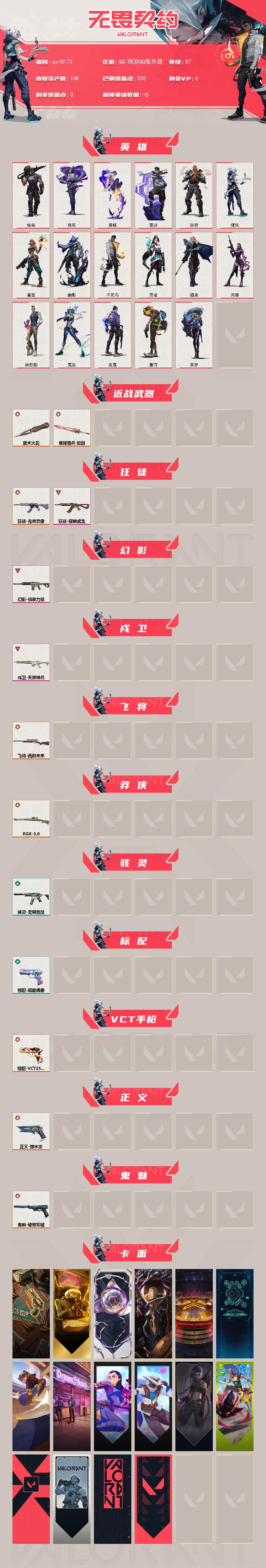 精品87级白银号-主战都有皮肤喜欢的来吧-qyz8172-近战武器皮肤:-魔术火花-步呛皮肤:-幻影-侦察力量戍卫-天界神兵狂徒-耀鳞威龙狂徒-光荣异象-佩呛皮肤:-鬼魅-破败军械正义-塑水宗标配-vct25xedg-狙击呛皮肤:-莽侠-rgx-11z-pro-30飞将-西部未来-亮点:-【qyz8172】【英雄】:炼狱,维斯,暮蝶,壹决,铁臂,捷风,雷兹,幽影,不死鸟,贤者,猎枭,芮娜,尚勃勒,霓虹,夜露,盖可,黑梦【近战-武器】:近战武器-魔术火花,近战武器-星际猎兵-短剑,近战武器-魔术火花【狂徒】:狂徒-光荣异象,狂徒-耀鳞威龙【幻影】:幻影-侦察力量【戍卫】:戍卫-天界神兵【飞将】:飞将-西部未来【莽侠】:莽侠-rgx-11z-pro//30【骇灵】:骇灵-无限竞技【标配】:标配-超能偶像【vct手呛】:标配-vct25-x-edg【正义】:正义-塑水宗【鬼魅】:鬼魅-破败军械【卡面】:正义的化身-卡面,终章:生意人麦宝-卡面,铁之华-卡面,时间到-卡面,最高舞台-卡面,声感陷阱设计图-卡面,clutch-卡面,梦幻奶茶-卡面,无畏契约go!第一卷:芮娜-卡面,无畏契约go!第一卷:零-卡面,《双城之战》金克丝-卡面,势不可挡//盖可-卡面,代号红色-卡面,新兵报到-卡面,v契约-卡面,无畏契约-卡面【喷漆】:超级粉丝-喷漆,捷风差距-喷漆,惊声尖叫-喷漆,拼一呛-喷漆,买装还是存钱-喷漆,蕊形灯-喷漆,胜利属于无畏契约-喷漆,glhf-喷漆,无畏契约-喷漆【挂饰】:无畏契约go!第一卷-芮娜-挂饰,无畏契约go!第一卷-零-挂饰,鱼骨头-挂饰,薰衣草之心-挂饰,终章:这瓜保熟-挂饰,糖葫芦-挂饰,袖珍捷风-挂饰,迷你浓缩-挂饰,第九季//第一幕-纪念币-挂饰,vct-x-edg-挂饰,传世莲华-挂饰,天外飞客-挂饰,冬日絮语-挂饰,无畏契约-纪念币-挂饰