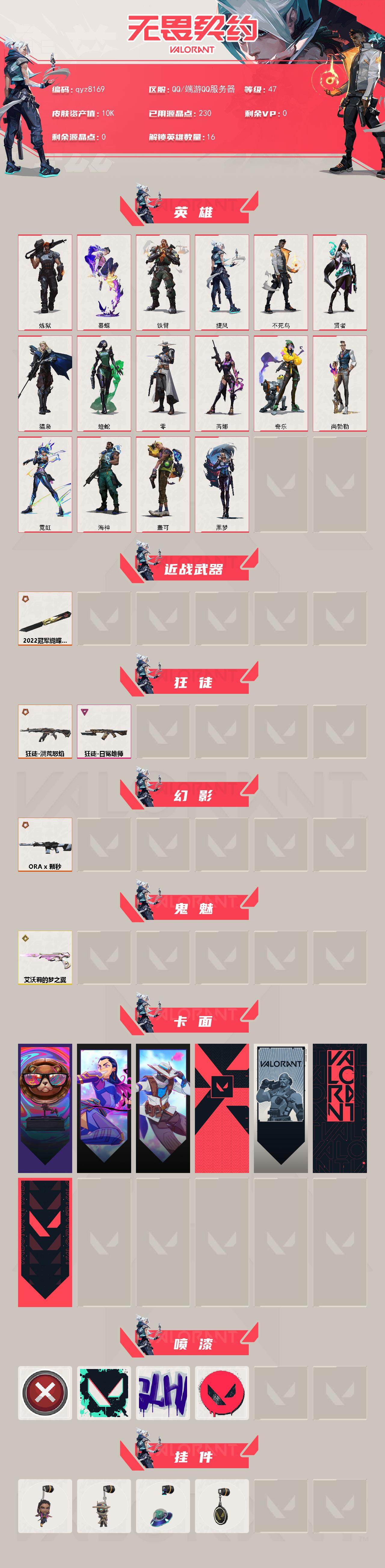 精品47级白银号-颗秒狂徒/艾沃利鬼魅/22冠军蝴蝶刀/狮子狂徒/流脓狂徒-qyz8169-亮点皮肤:-蝴蝶刀-2022全球冠军赛-步呛皮肤:-狂徒-洪荒怒焰狂徒-日冕雄师-佩呛皮肤:-鬼魅-艾沃莉的梦之翼-亮点:-【qyz8169】【英雄】:炼狱,暮蝶,铁臂,捷风,不死鸟,贤者,猎枭,蝰蛇,零,芮娜,奇乐,尚勃勒,霓虹,海神,盖可,黑梦【近战-武器】:近战武器-2022全球冠军赛-蝴蝶刀【狂徒】:狂徒-洪荒怒焰,狂徒-日冕雄师【幻影】:幻影-a-x-颗秒【鬼魅】:鬼魅-艾沃莉的梦之翼【卡面】:音熊登场-卡面,无畏契约go!第一卷:芮娜-卡面,无畏契约go!第一卷:零-卡面,代号红色-卡面,新兵报到-卡面,v契约-卡面,无畏契约-卡面【喷漆】:买装还是存钱-喷漆,胜利属于无畏契约-喷漆,glhf-喷漆,无畏契约-喷漆【挂饰】:无畏契约go!第一卷-芮娜-挂饰,无畏契约go!第一卷-零-挂饰,天外飞客-挂饰,无畏契约-纪念币-挂饰