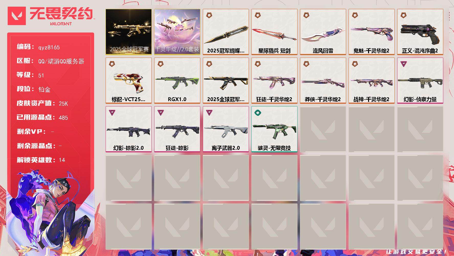 25套-莲花20套-掠影显卡离子狂徒-侦查掠影幻影-混沌正义-qyz8165-套装:-2025全球冠军赛-近战武器皮肤:-2025全球冠军赛-蝴蝶刀-步呛皮肤:-幻影-侦察力量狂徒-掠影狂徒-离子武器20狂徒-rgx-11z-pro幻影-掠影202025全球冠军赛-狂徒狂徒-千灵华绽//20-佩呛皮肤:-标配-vct25xedg鬼魅-千灵华绽//20-狙击呛皮肤:-莽侠-千灵华绽//20-机呛皮肤:-战神-千灵华绽//20-亮点:-【qyz8165】【套装】:2025全球冠军赛套装,千灵华绽//20套装【英雄】:炼狱,维斯,暮蝶,壹决,捷风,幽影,不死鸟,贤者,猎枭,芮娜,尚勃勒,霓虹,黑梦【近战-武器】:近战武器-2025全球冠军赛-蝴蝶刀,近战武器-流风回雪,近战武器-星际猎兵-短剑【狂徒】:狂徒-2025全球冠军赛,狂徒-rgx-11z-pro,狂徒-千灵华绽//20,狂徒-掠影,狂徒-离子武器//20【幻影】:幻影-侦察力量,幻影-掠影//20【莽侠】:莽侠-千灵华绽//20【战神】:战神-千灵华绽//20【骇灵】:骇灵-无限竞技【vct手呛】:标配-vct25-x-edg【正义】:正义-混沌序曲//20【鬼魅】:鬼魅-千灵华绽//20【卡面】:无畏契约go!第一卷:零-卡面,《双城之战》金克丝-卡面,代号红色-卡面,新兵报到-卡面,v契约-卡面,无畏契约-卡面【喷漆】:霓光四射-喷漆,买装还是存钱-喷漆,关门放狗-喷漆,胜利属于无畏契约-喷漆,glhf-喷漆,无畏契约-喷漆【挂饰】:无畏契约go!第一卷-零-挂饰,vct-x-edg-挂饰,天外飞客-挂饰,无畏契约-纪念币-挂饰