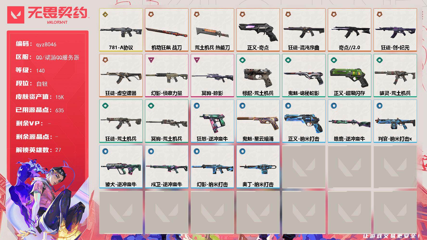 【qyz8046】混沌-虚空-纪元ak-摩托刀-侦察-781m4-qyz8046-近战武器皮肤:-机动狂飙战刀荒土机兵热能刀-步呛皮肤:-幻影-侦察力量幻影-781-a协议狂徒-混沌序曲狂徒-奇点//20狂徒-创纪元狂徒-虚空遗器-佩呛皮肤:-正义-奇点-狙击呛皮肤:-冥驹-掠影-亮点:-【qyz8046】【英雄】:幻棱,炼狱,维斯,暮蝶,钛狐,壹决,铁臂,捷风,雷兹,幽影,不死鸟,贤者,猎枭,蝰蛇,零,芮娜,奇乐,尚勃勒,霓虹,斯凯,夜露,星礈,k/o,海神,盖可,黑梦,钢锁【近战-武器】:近战武器-荒土机兵-热能刀,近战武器-机动狂飙-战刀【狂徒】:狂徒-混沌序曲,狂徒-奇点//20,狂徒-创纪元,狂徒-虚空遗器,狂徒-荒土机兵【幻影】:幻影-781-a协议,幻影-侦察力量,幻影-纳米打击【戍卫】:戍卫-逆冲蛮牛【獠犬】:獠犬-逆冲蛮牛【冥驹】:冥驹-掠影,冥驹-荒土机兵【奥丁】:奥丁-纳米打击【判官】:判官-纳米打击x【雄鹿】:雄鹿-逆冲蛮牛【骇灵】:骇灵-荒土机兵【标配】:标配-荒土机兵【正义】:正义-奇点,正义-超限闪存,正义-纳米打击【鬼魅】:鬼魅-诡秘蛇影,鬼魅-星云暗涌【狂怒】:狂怒-逆冲蛮牛【卡面】:终章:激斗汉堡-卡面,进入射程-卡面,分崩离析-卡面,纳米打击-卡面,抑制技术-卡面,激斗汉堡-卡面,瓦娃脸雪糕-p2-卡面,从黄昏到黎明-卡面,荒土机兵-卡面,银弹猎手-卡面,逆冲蛮牛-卡面,《双城之战》拥抱-卡面,精灵大战-卡面,欢迎来到底城-卡面,南瓜盛典-卡面,修车达人-卡面,正义的化身-卡面,时间到-卡面,最高舞台-卡面,霓帧牛蛙-卡面,梦幻奶茶-卡面,源能反应-卡面,零点嗅探设计图-卡面,无畏契约:蝰蛇-卡面,沙雕爆能器-卡面,无畏契约go!第一卷:芮娜-卡面,深海水族-卡面,清除名单-卡面,无畏契约go!第一卷:零-卡面,逆向独行-卡面-,暗呛-卡面,代号红色-卡面,新兵报到-卡面,v契约-卡面,无畏契约-卡面【喷漆】:小小心意-喷漆,战“素”兔-喷漆,宇宙的指引-喷漆,请求重启-喷漆,逆冲蛮牛-喷漆,纳米打击-喷漆,鼻尖上的蝴蝶-喷漆,简笔画黯兽-喷漆,独守蝰腹-喷漆,他们将落荒而逃-喷漆,通缉:战术企鹅-喷漆,荒土机兵-喷漆,别挡我吃球!-喷漆,嗨宝南瓜灯-喷漆,嘭!-喷漆,都算到了-喷漆,控场勿近-喷漆,小丑猫
