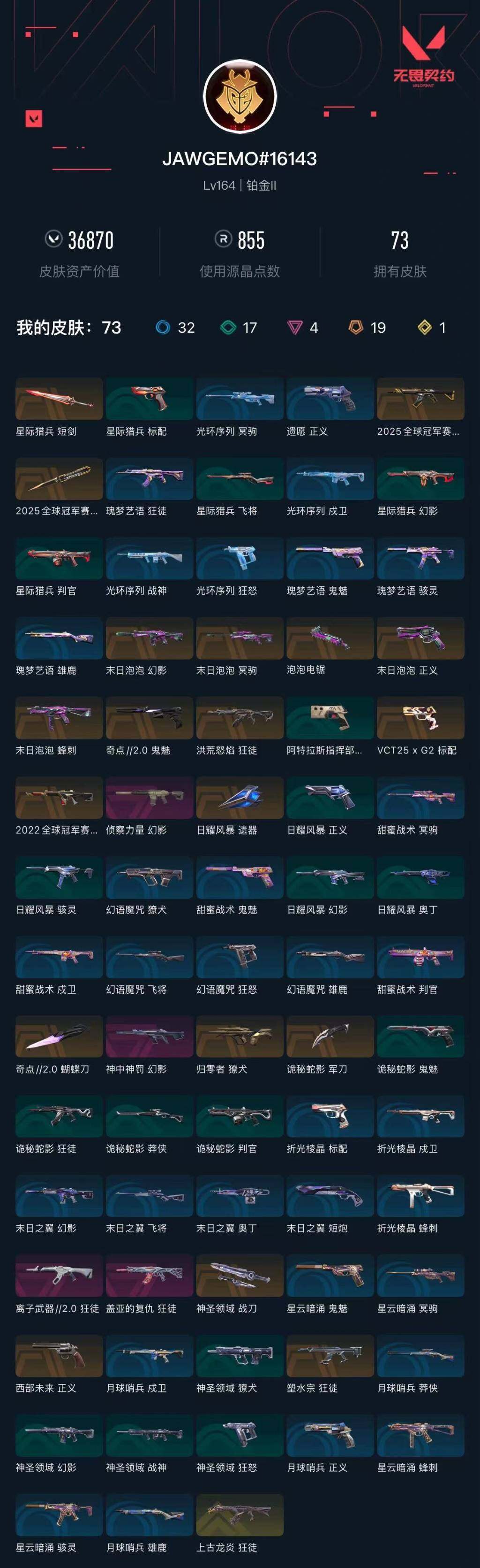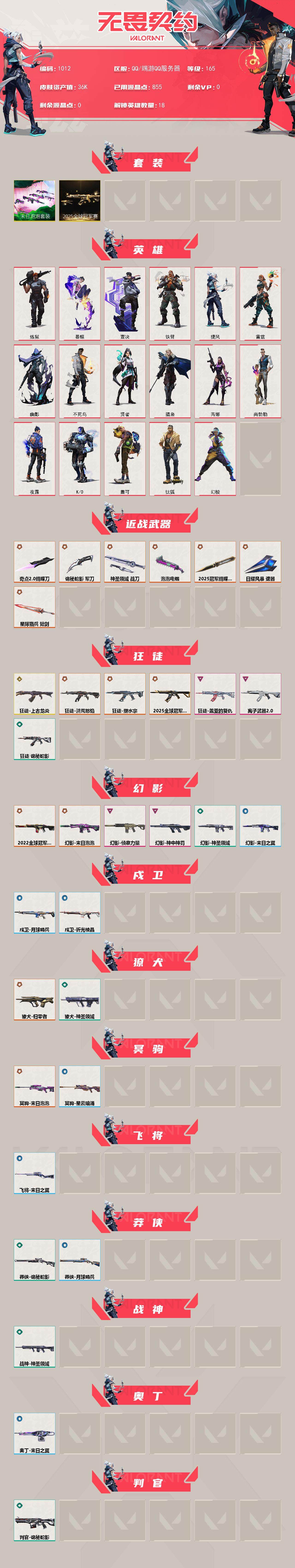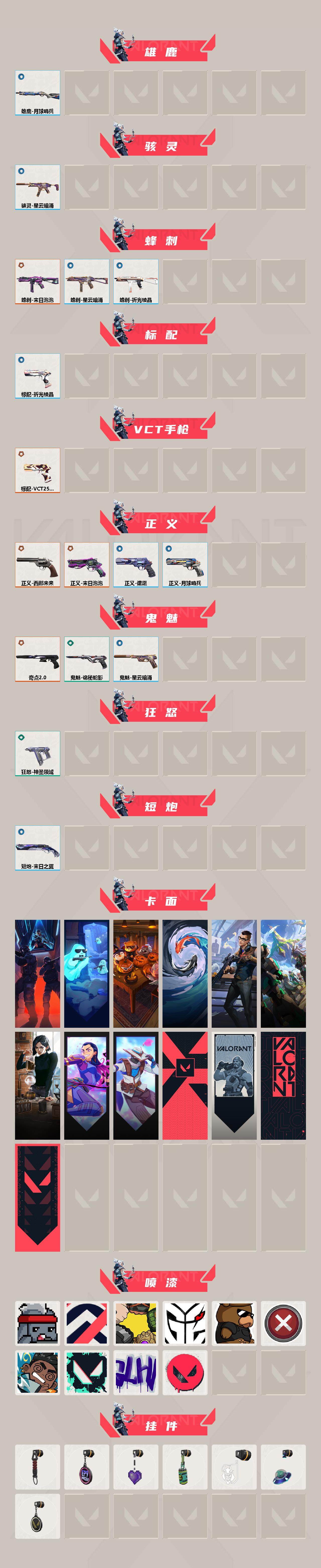 [14755155]【套装】:2025全球冠军赛套装,末日泡泡套装 【英雄】:幻棱,炼狱,暮蝶,钛狐,壹决,铁臂,捷风,雷兹,幽影,不死鸟,贤者,猎枭,芮娜,尚勃勒,夜露,k/o,盖可 【近战 武器】:近战武器-2025全球冠军赛 蝴蝶刀,近战武器-泡泡电锯,近战武器-奇点//2.0 蝴蝶刀,近战武器-诡秘蛇影 军刀,近战武器-神圣领域 战刀,近战武器-日耀风暴 遗器,近战武器-星际猎兵 短剑 【狂徒】:狂徒-上古龙炎,狂徒-2025全球冠军赛,狂徒-洪荒怒焰,狂徒-塑水宗,狂徒-盖亚的复仇,狂徒-离子武器//2.0,狂徒-诡秘蛇影 【幻影】:幻影-2022全球冠军赛,幻影-末日泡泡,幻影-侦察力量,幻影-神中神罚,幻影-神圣领域,幻影-末日之翼 【戍卫】:戍卫-月球哨兵,戍卫-折光棱晶 【獠犬】:獠犬-归零者,獠犬-神圣领域 【冥驹】:冥驹-末日泡泡,冥驹-星云暗涌 【飞将】:飞将-末日之翼 【莽侠】:莽侠-诡秘蛇影,莽侠-月球哨兵 【战神】:战神-神圣领域 【奥丁】:奥丁-末日之翼 【判官】:判官-诡秘蛇影 【雄鹿】:雄鹿-月球哨兵 【骇灵】:骇灵-星云暗涌 【蜂刺】:蜂刺-末日泡泡,蜂刺-星云暗涌,蜂刺-折光棱晶 【标配】:标配-折光棱晶 【vct手呛】:标配-vct25 x g2 【正义】:正义-西部未来,正义-末日泡泡,正义-遗愿,正义-月球哨兵 【鬼魅】:鬼魅-奇点//2.0,鬼魅-诡秘蛇影,鬼魅-星云暗涌 【狂怒】:狂怒-神圣领域 【短炮】:短炮-末日之翼 【卡面】:纳米打击 卡面,精灵大战 卡面,南瓜盛典 卡面,红鳞松叶 卡面,西装暴徒 卡面,流星兵团 卡面,虹吸式咖啡壶 卡面,无畏契约go!第一卷:芮娜 卡面,无畏契约go!第一卷:零 卡面,代号红色 卡面,新兵报到 卡面,v契约 卡面,无畏契约 卡面 【喷漆】:战“素”兔 喷漆,控场勿近 喷漆,五个全都齐了 喷漆,vct x g2 喷漆,三熊合一 喷漆,买装还是存钱 喷漆,爆泉领域 喷漆,胜利属于无畏契约 喷漆,glhf 喷漆,无畏契约 喷漆 【挂饰】:伞绳 挂饰,第九季//第三幕 纪念币 挂饰,薰衣草之心 挂饰,z世代特饮 挂饰,vct x g2 挂饰,天外飞客 挂饰,无畏契约 纪念币 挂饰