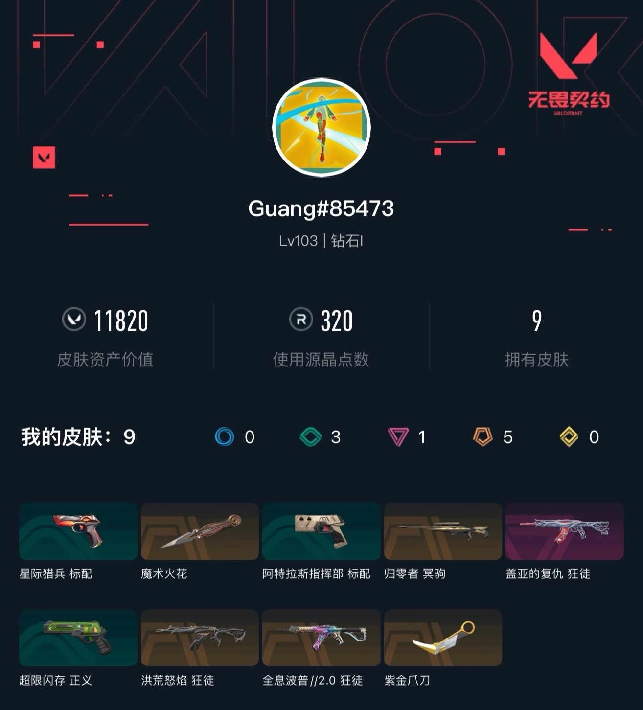 【无畏契约】【yhwww7307】等级:103,已用无畏点11820,已用源晶点320,橙皮:近战-紫金爪刀|狂徒-全息波普2.0|狂徒-洪荒怒焰|冥驹-归零者|近战-魔术火花__紫皮:狂徒-盖亚的复仇__段位:钻石__绿皮:正义-超限闪存|标配-星际猎兵__蓝皮:标配-阿特拉斯指挥部__英雄:尚勃勒|维斯|黑梦|斯凯|暮蝶|盖可|霓虹|壹决|星礈|k/o|幽影|钢锁|奇乐|炼狱|铁臂|贤者|猎枭|芮娜|零|捷风|蝰蛇|不死鸟|雷兹|禁灭