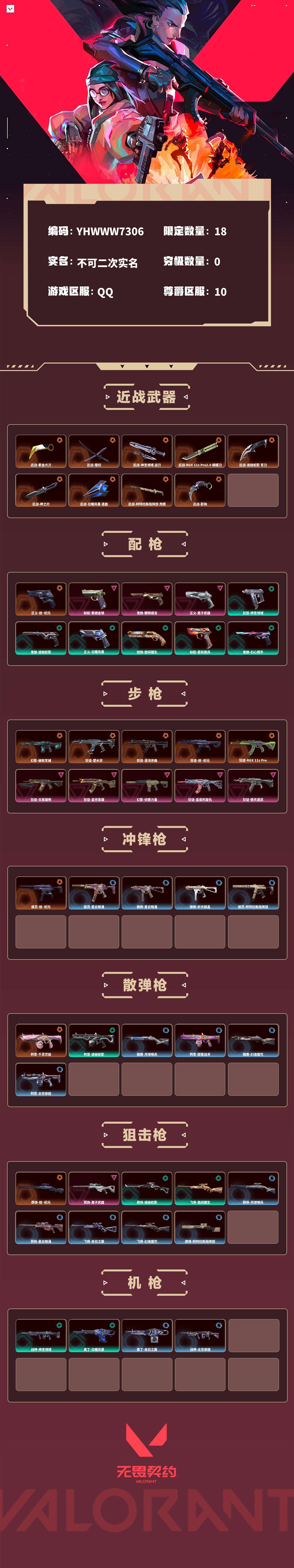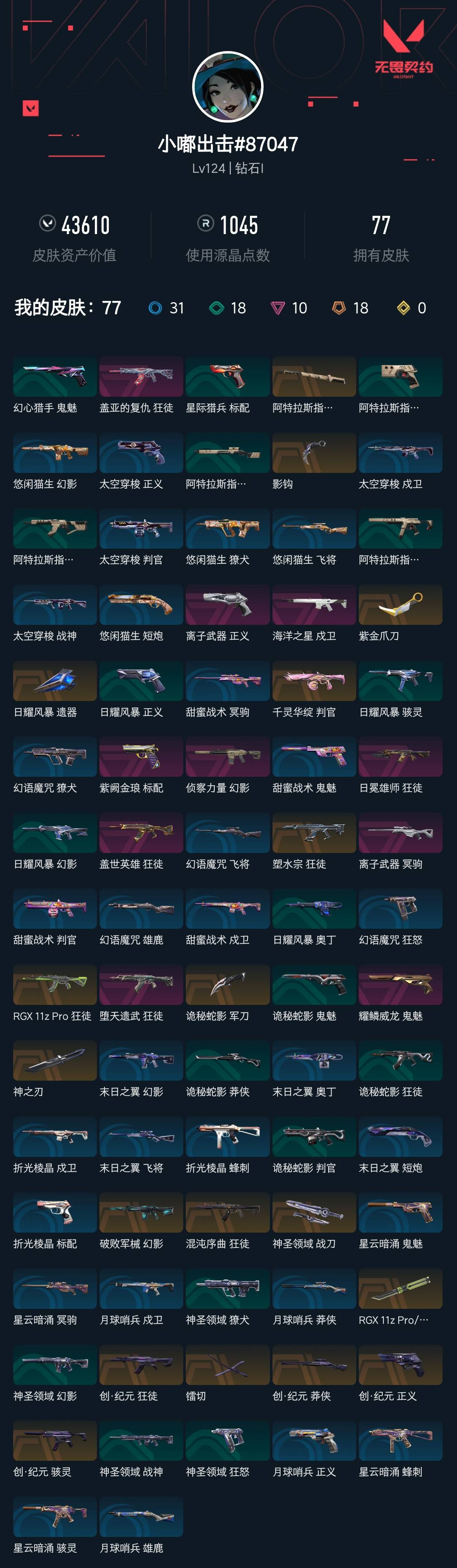 【无畏契约】【yhwww7306】等级:124,已用无畏点43610,已用源晶点1045,橙皮:幻影-破败军械|近战-紫金爪刀|狂徒-塑水宗|狂徒-混沌序曲|判官-千灵华绽|近战-镭切|骇灵-创·纪元|莽侠-创·纪元|狂徒-创·纪元|正义-创·纪元|近战-神圣领域 战刀|近战-rgx 11z pro2.0 蝴蝶刀|近战-诡秘蛇影 军刀|近战-神之刃|近战-日耀风暴 遗器|狂徒-rgx 11z pro|近战-阿特拉斯指挥部 甩棍|近战-影钩__紫皮:标配-紫阙金琅|鬼魅-耀鳞威龙|狂徒-日冕雄师|狂徒-盖世英雄|幻影-侦察力量|狂徒-盖亚的复仇|狂徒-堕天遗武|冥驹-离子武器|戍卫-海洋之星|正义-离子武器__段位:钻石__蓝皮:鬼魅-星云暗涌|骇灵-星云暗涌|正义-月球哨兵|莽侠-月球哨兵|戍卫-月球哨兵|雄鹿-月球哨兵|冥驹-星云暗涌|蜂刺-星云暗涌|蜂刺-折光棱晶|戍卫-折光棱晶|标配-折光棱晶|飞将-末日之翼|幻影-末日之翼|短炮-末日之翼|奥丁-末日之翼|鬼魅-甜蜜战术|判官-甜蜜战术|戍卫-甜蜜战术|雄鹿-幻语魔咒|獠犬-幻语魔咒|飞将-幻语魔咒|狂怒-幻语魔咒|正义-太空穿梭|战神-太空穿梭|判官-太空穿梭|戍卫-太空穿梭|骇灵-阿特拉斯指挥部|莽侠-阿特拉斯指挥部|标配-阿特拉斯指挥部|狂徒-阿特拉斯指挥部__绿皮:獠犬-神圣领域|狂怒-神圣领域|战神-神圣领域|幻影-神圣领域|判官-诡秘蛇影|鬼魅-诡秘蛇影|莽侠-诡秘蛇影|狂徒-诡秘蛇影|正义-日耀风暴|幻影-日耀风暴|奥丁-日耀风暴|短炮-悠闲猫生|飞将-悠闲猫生|幻影-悠闲猫生|獠犬-悠闲猫生|标配-星际猎兵|鬼魅-幻心猎手__英雄:尚勃勒|维斯|黑梦|斯凯|暮蝶|盖可|霓虹|壹决|星礈|k/o|幽影|夜露|钢锁|海神|奇乐|炼狱|铁臂|贤者|猎枭|钛狐|芮娜|零|捷风|蝰蛇|不死鸟|幻棱|雷兹|禁灭