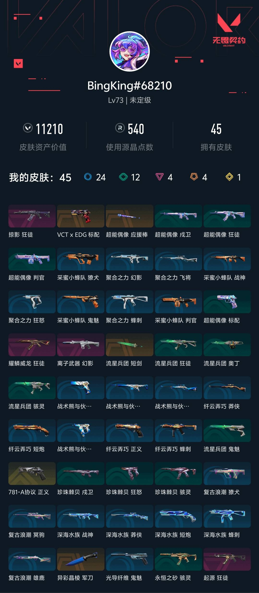 【无畏契约】【yhwww7303】等级:73,已用无畏点11210,已用源晶点540,金皮:正义-781-a协议__橙皮:标配-vct x edg|近战-超能偶像 应援棒|近战-流星兵团 短剑|近战-异彩晶棱 军刀__紫皮:幻影-离子武器|狂徒-起源|狂徒-耀鳞威龙|狂徒-掠影__绿皮:骇灵-珍珠棘贝|狂怒-珍珠棘贝|戍卫-珍珠棘贝|戍卫-超能偶像|标配-超能偶像|狂徒-超能偶像|判官-超能偶像|骇灵-流星兵团|鬼魅-流星兵团|狂徒-流星兵团|奥丁-流星兵团|骇灵-永恒之砂__蓝皮:鬼魅-光导纤维|獠犬-复古浪潮|冥驹-复古浪潮|雄鹿-复古浪潮|鬼魅-采蜜小蜂队|战神-采蜜小蜂队|獠犬-采蜜小蜂队|判官-采蜜小蜂队|蜂刺-聚合之力|幻影-聚合之力|狂怒-聚合之力|飞将-聚合之力|战神-深海水族|短炮-深海水族|蜂刺-深海水族|莽侠-深海水族|莽侠-纤云弄巧|正义-纤云弄巧|短炮-纤云弄巧|蜂刺-纤云弄巧|飞将-战术熊与伙伴们|狂怒-战术熊与伙伴们|戍卫-战术熊与伙伴们|标配-战术熊与伙伴们__段位:未定级__英雄:尚勃勒|黑梦|斯凯|暮蝶|盖可|霓虹|k/o|幽影|夜露|海神|奇乐|炼狱|铁臂|贤者|猎枭|芮娜|零|捷风|不死鸟|雷兹
